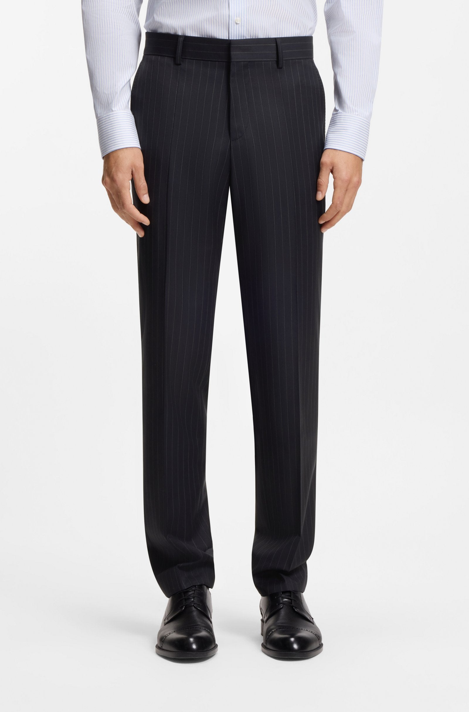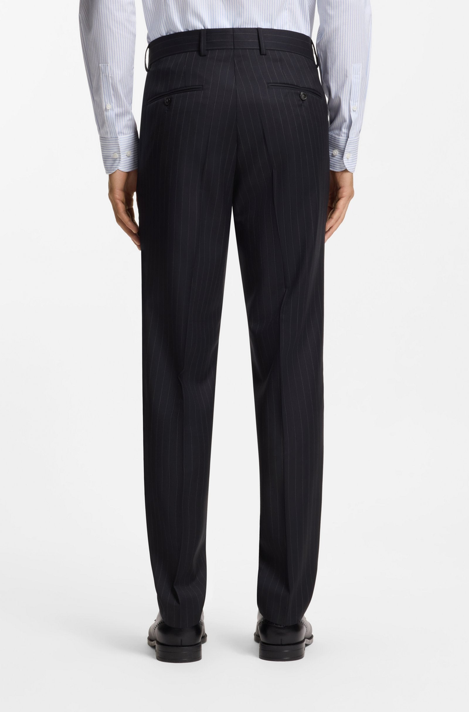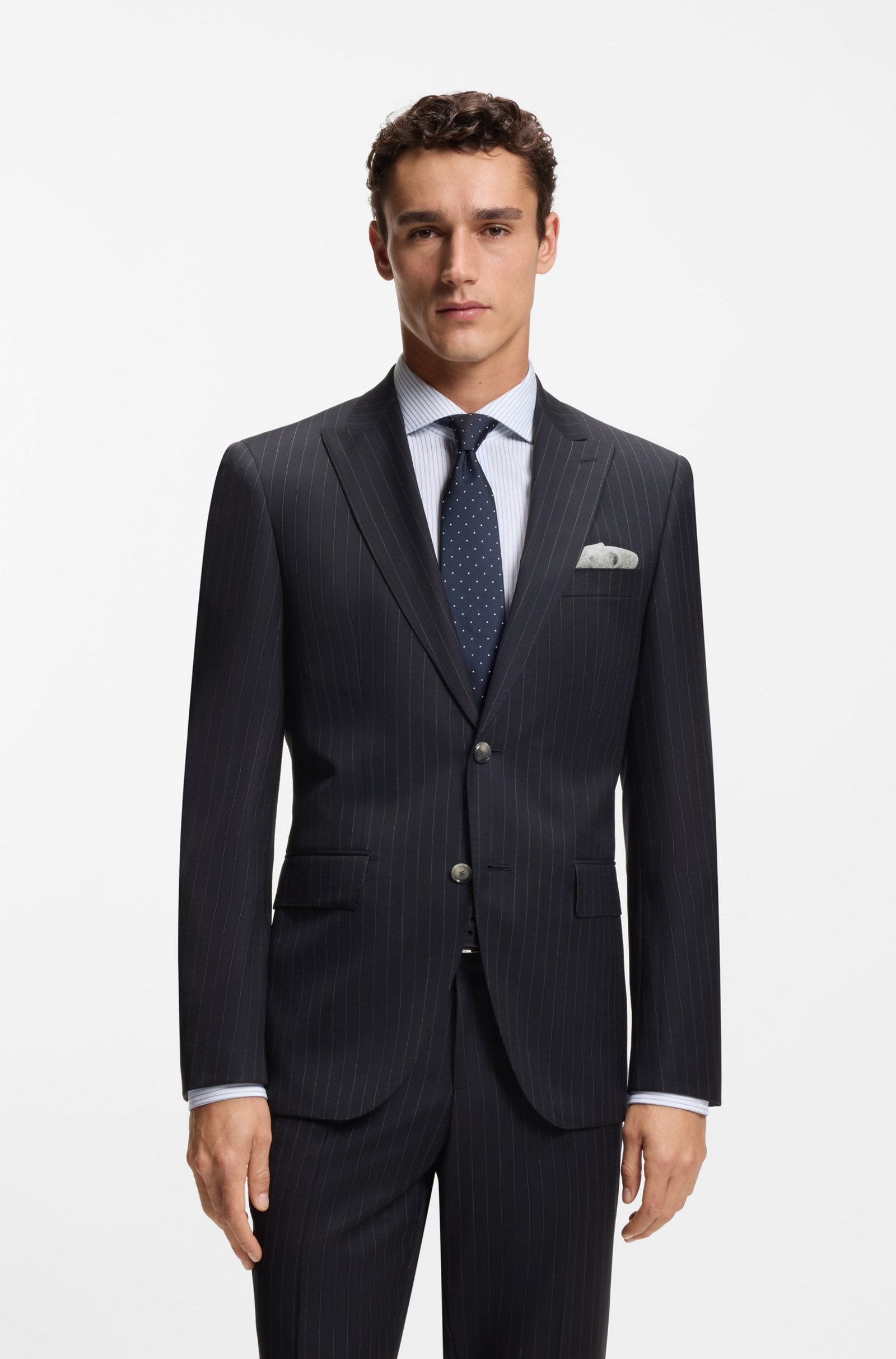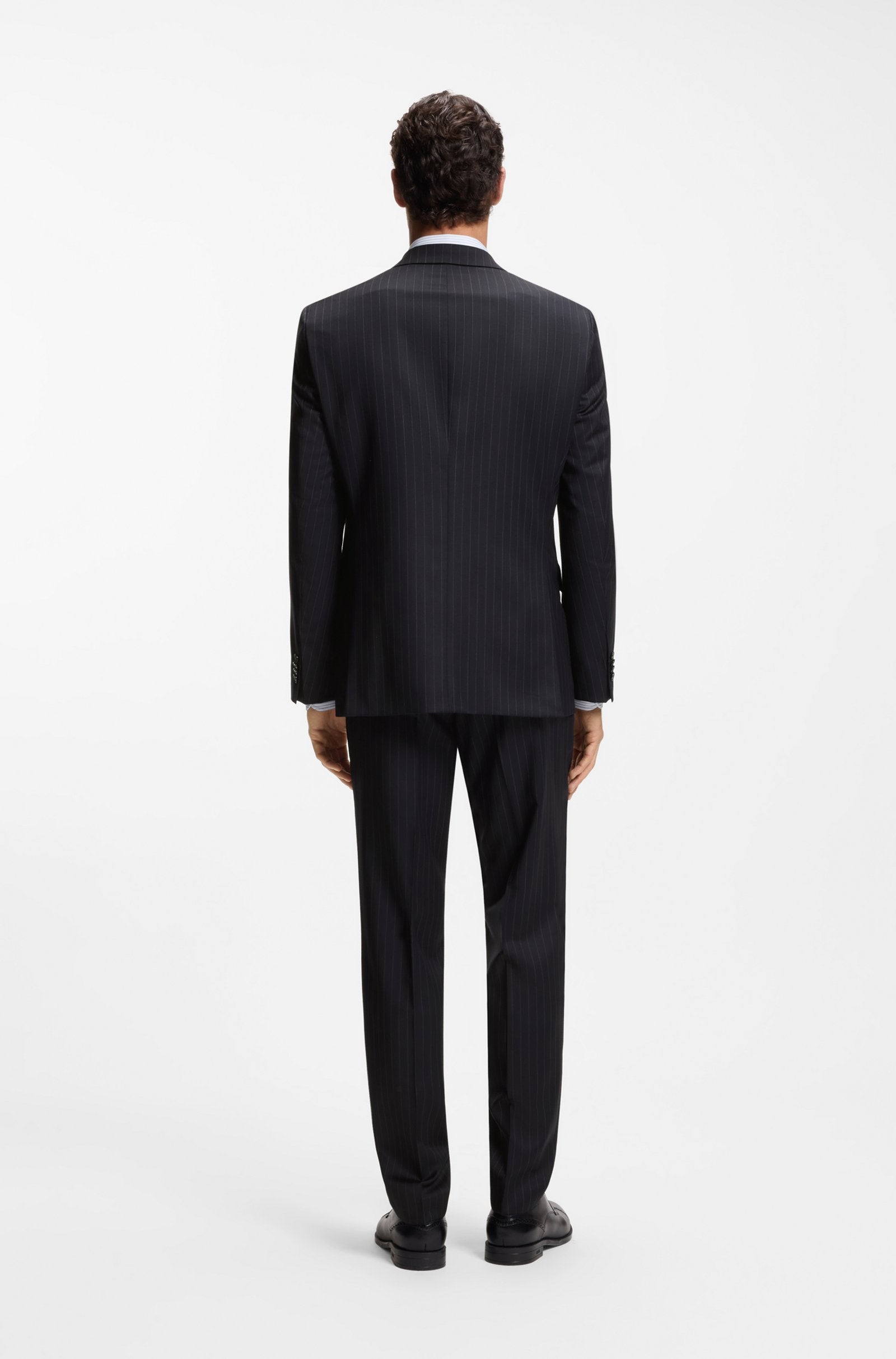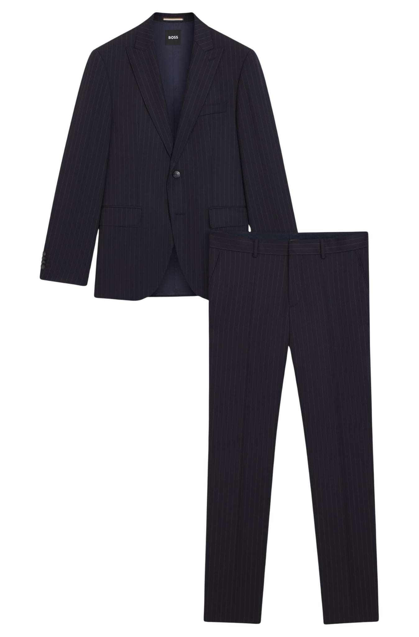 Invest in easy-care formal style with this washable BOSS Menswear suit. Crafted in virgin wool, this two-piece suit is patterned with a pinstripe that offers a classic look. The regular fit provides clean lines with room to move.