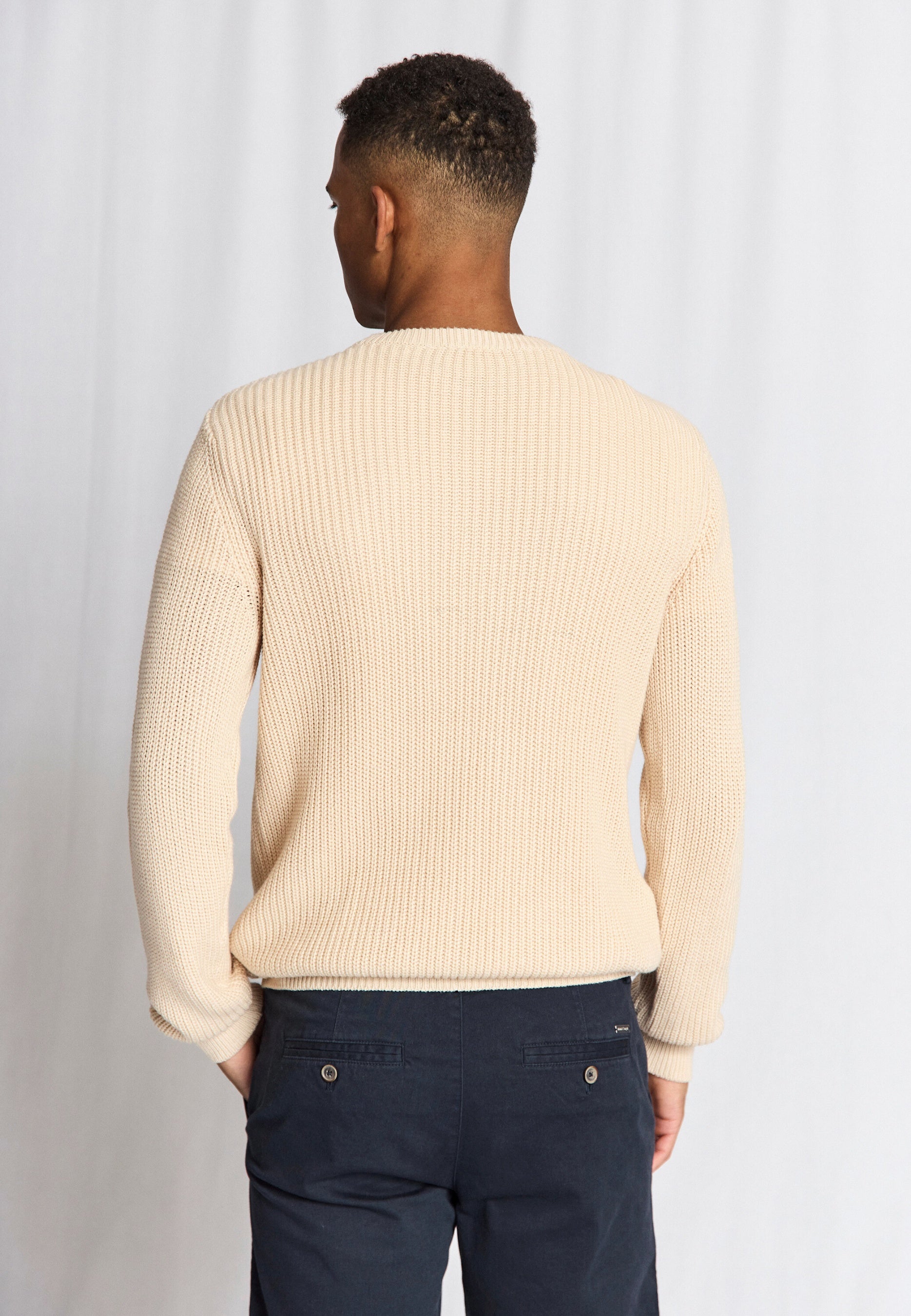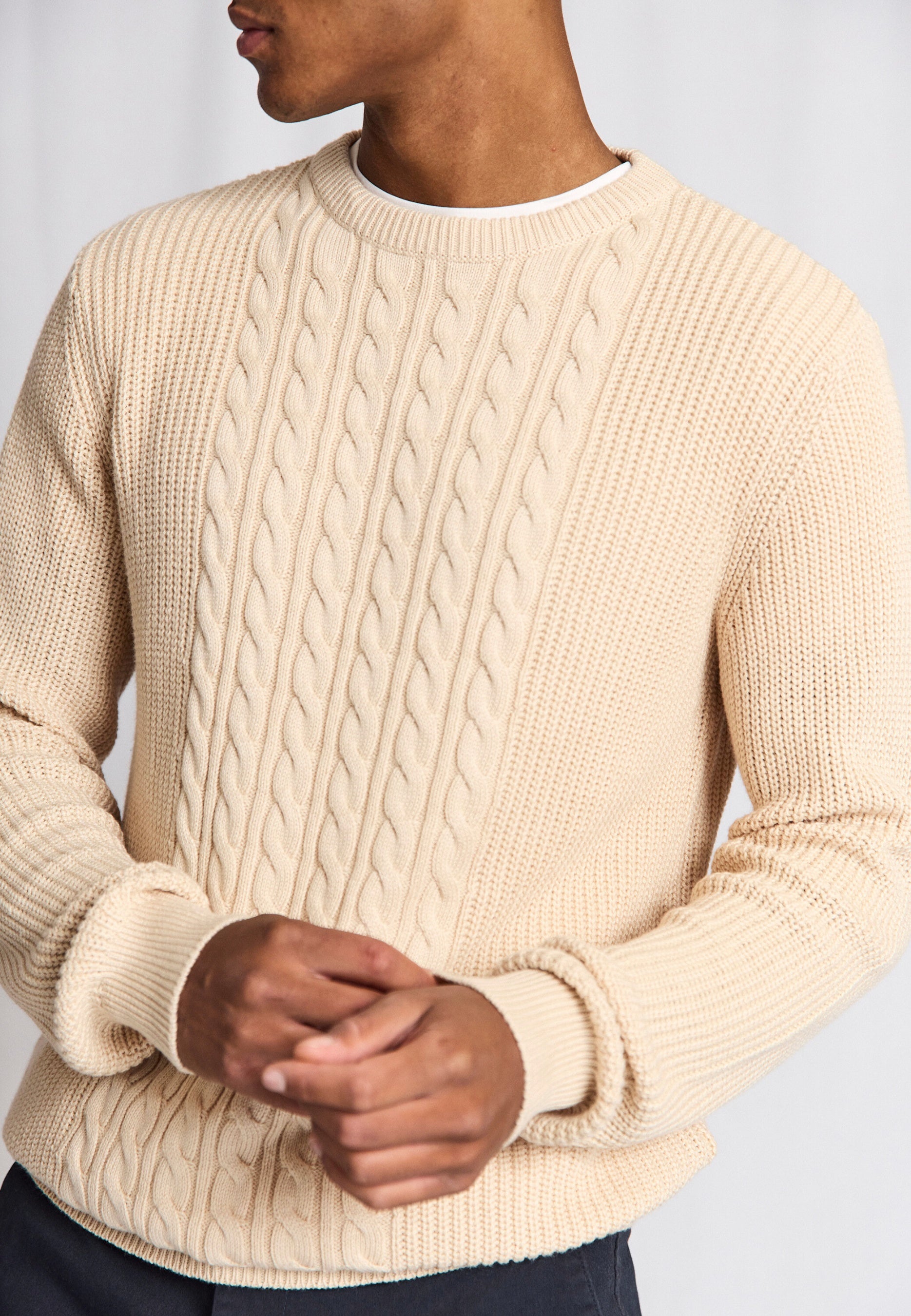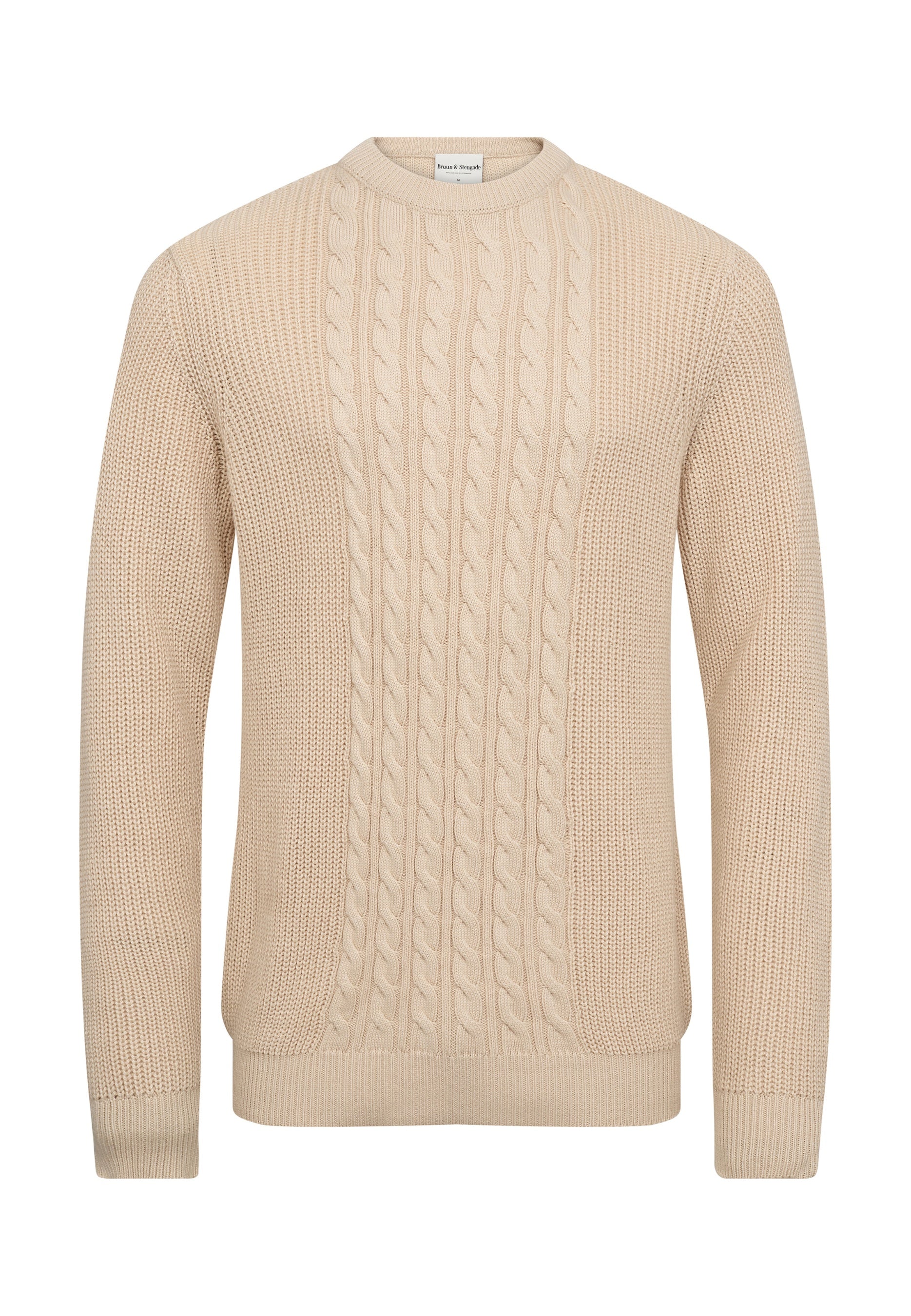 Heavyweight o-neck sweater in a blend of cotton, rayon and nylon, designed with cable knit detail on the front and rib knit on the back and sleeves. The sweater has a timeless fit that provides both warmth and comfort for everyday wear.