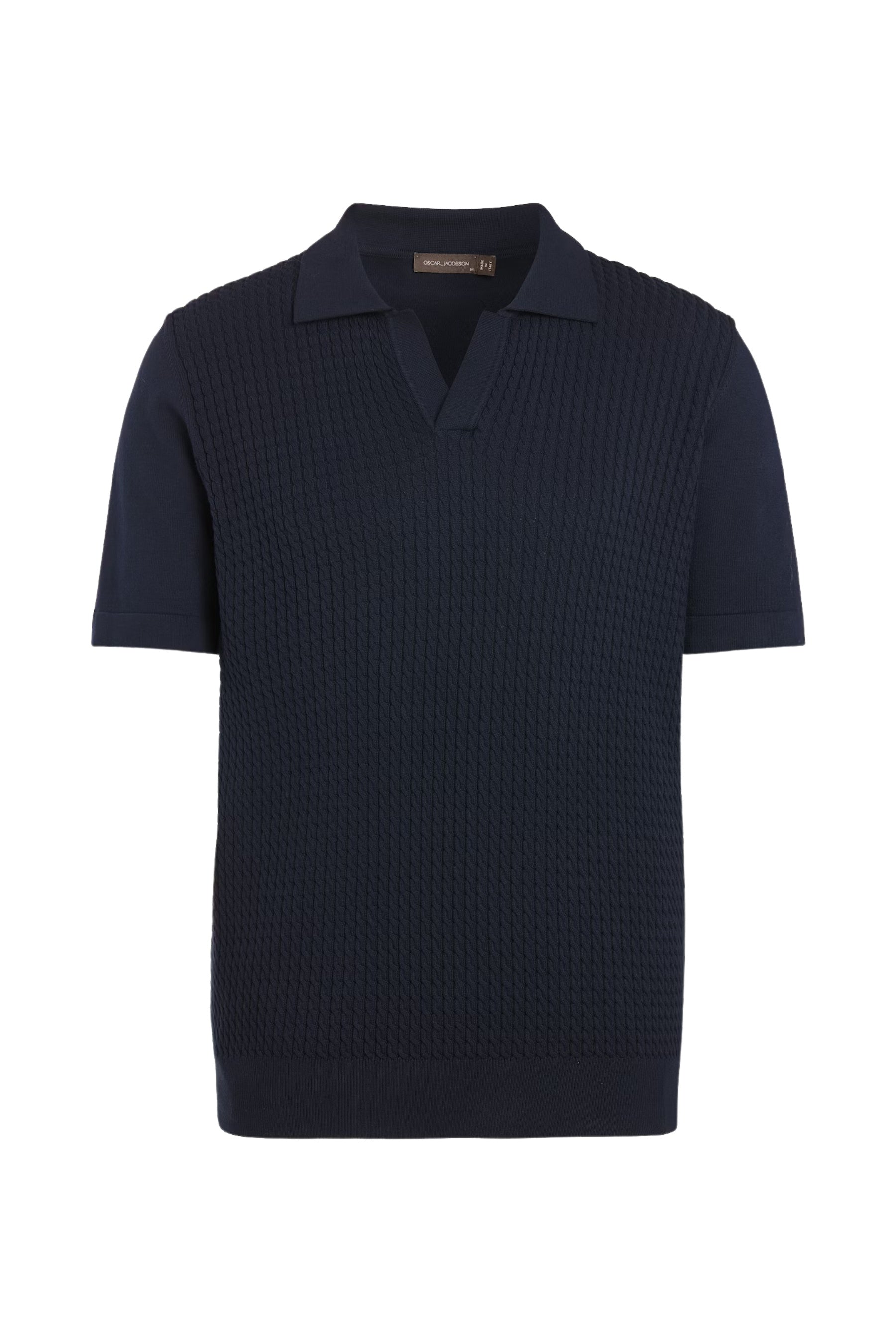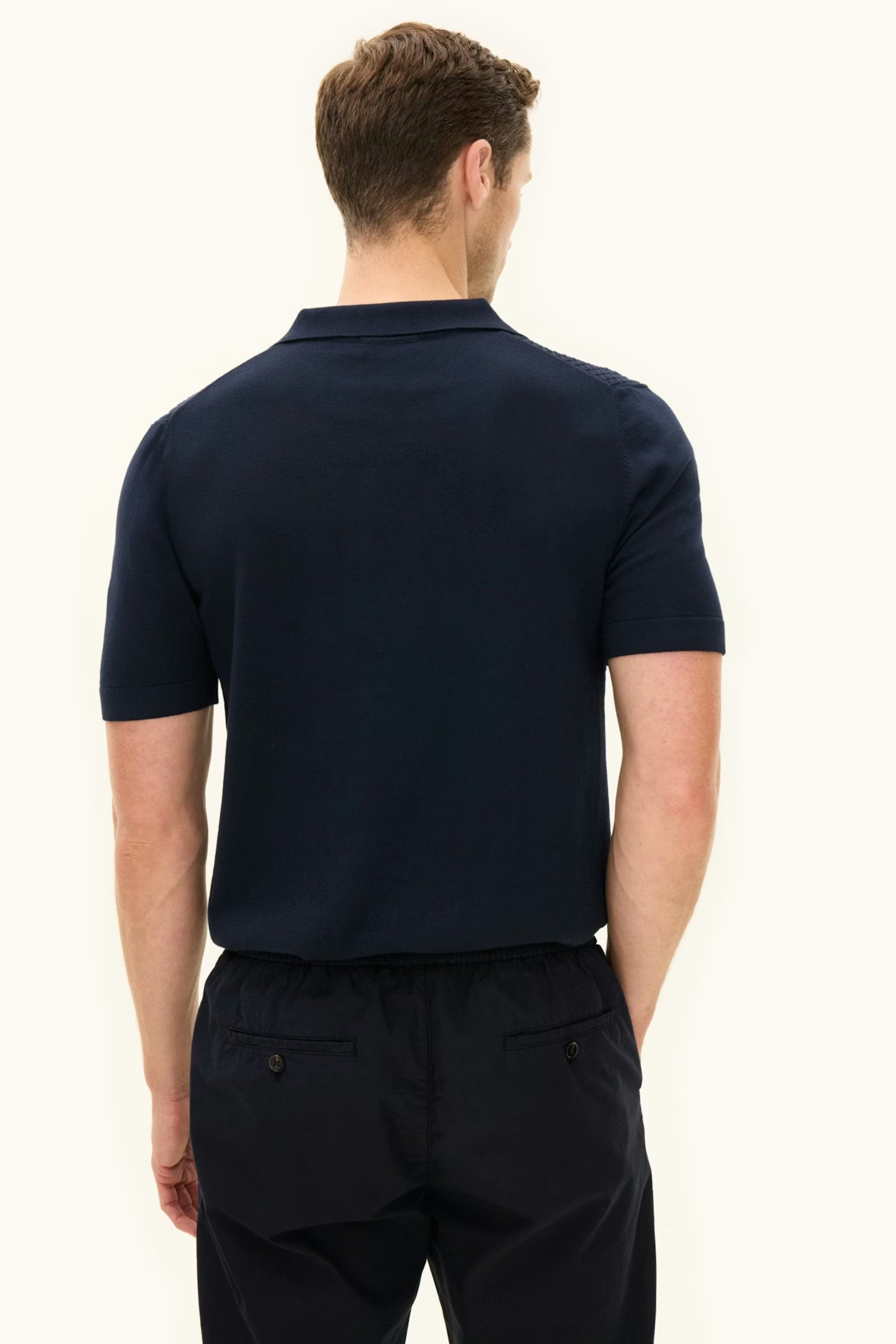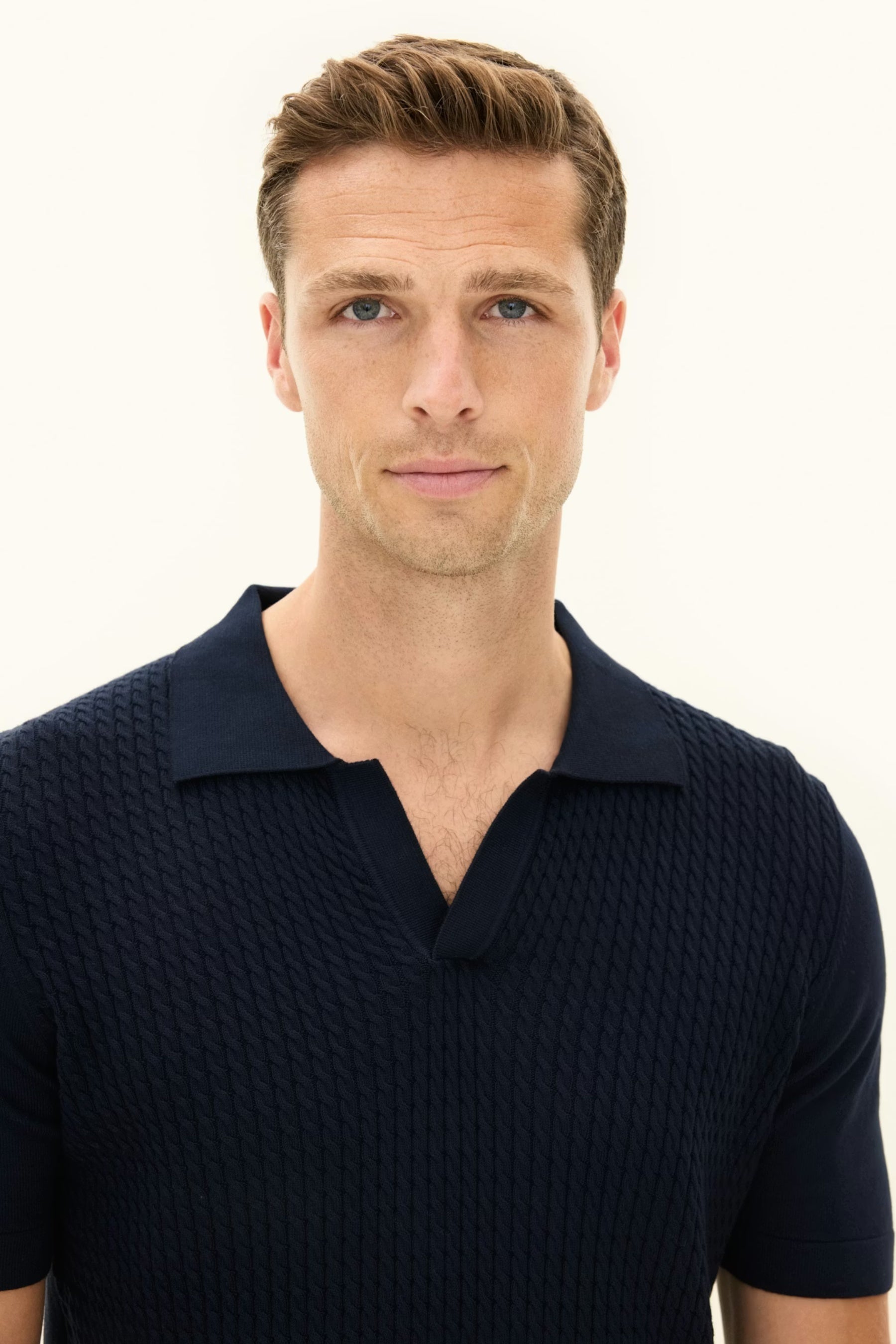 Short-sleeved knitted turtleneck jumper in garment-dyed cotton. Knitted in 12 gauge with a fine cable structure on the front. No buttons at the front for a more relaxed look. A great piece to wear with chinos, but can just as easily be worn under a casual suit or jacket.