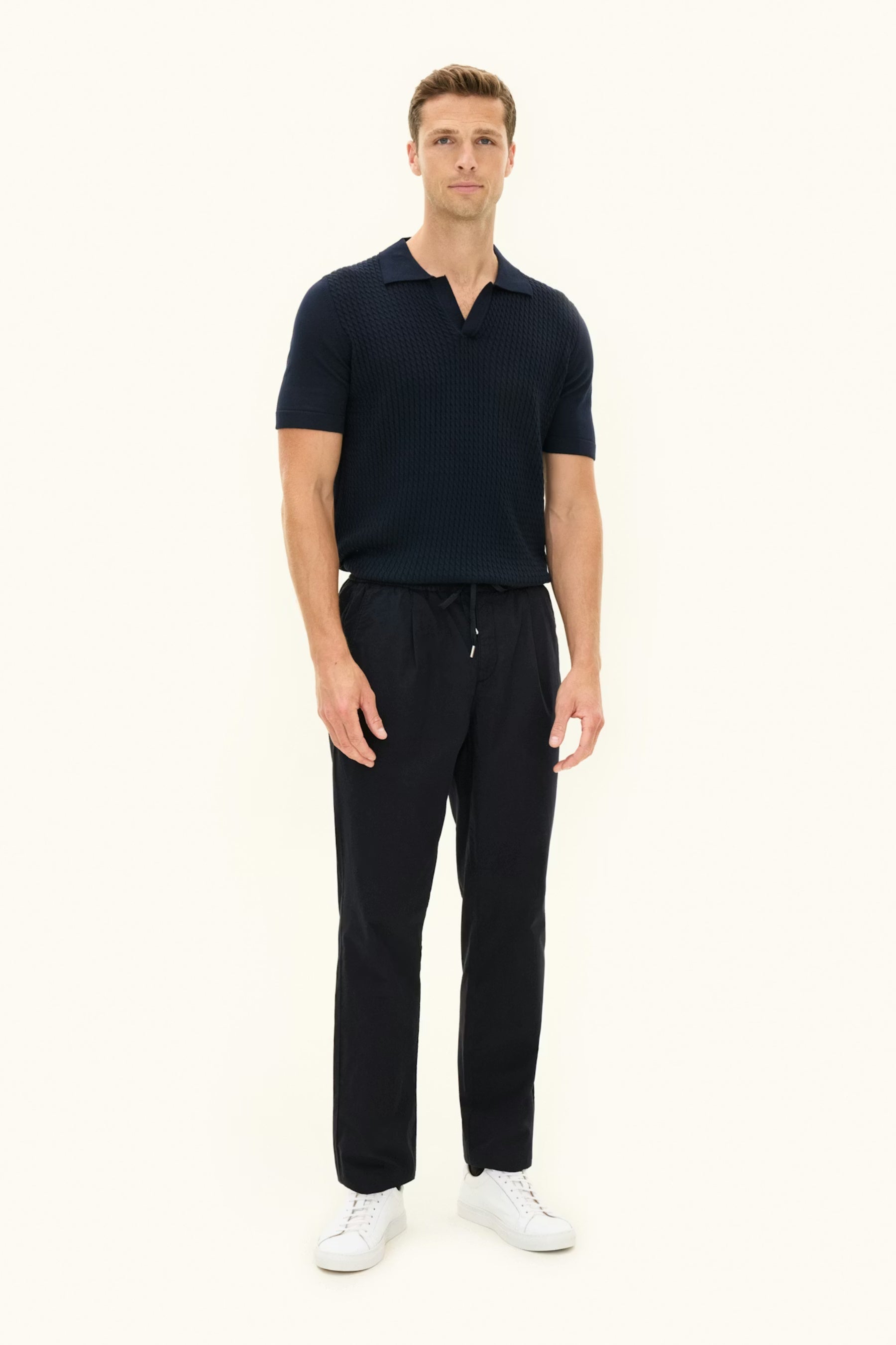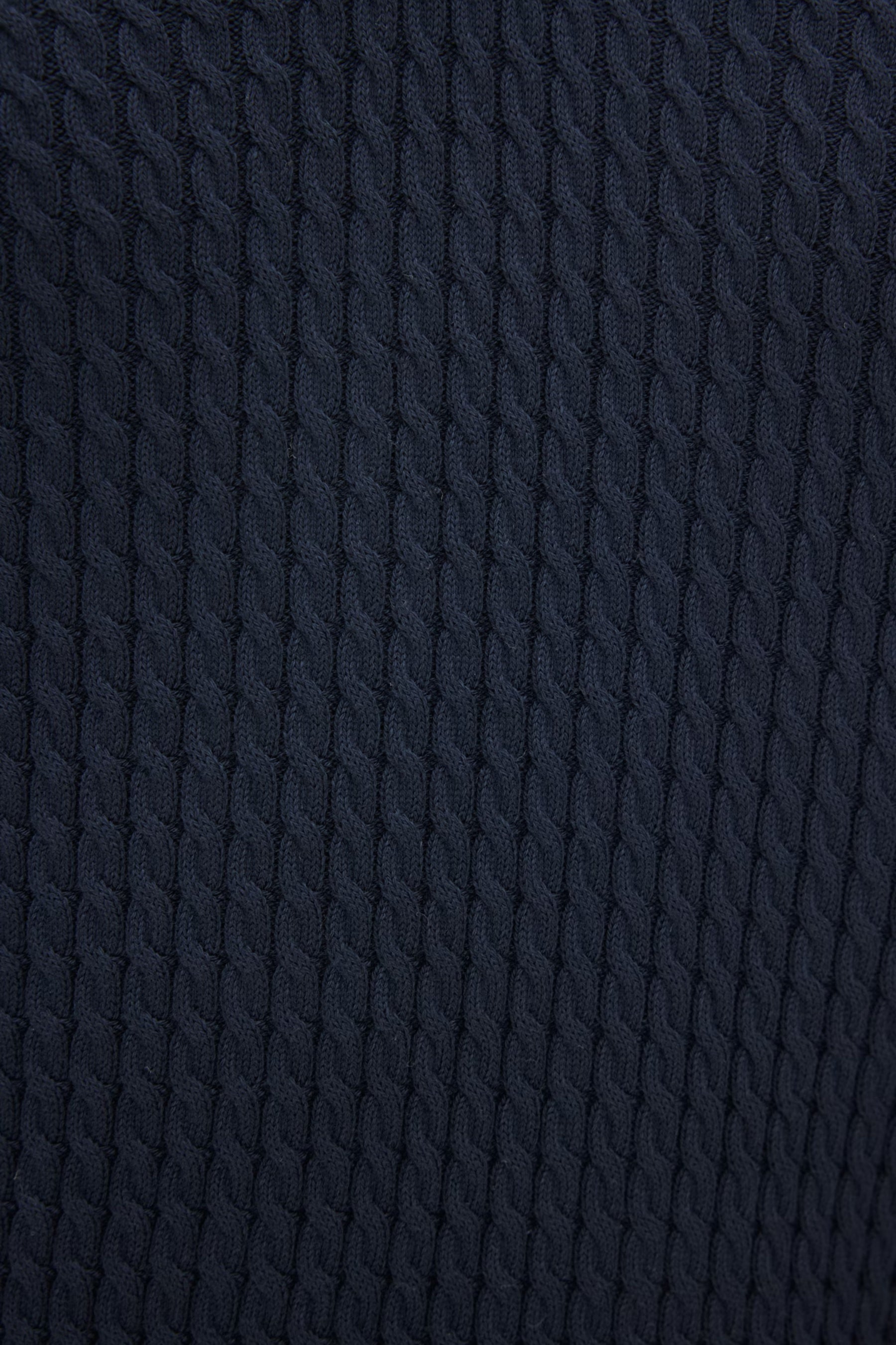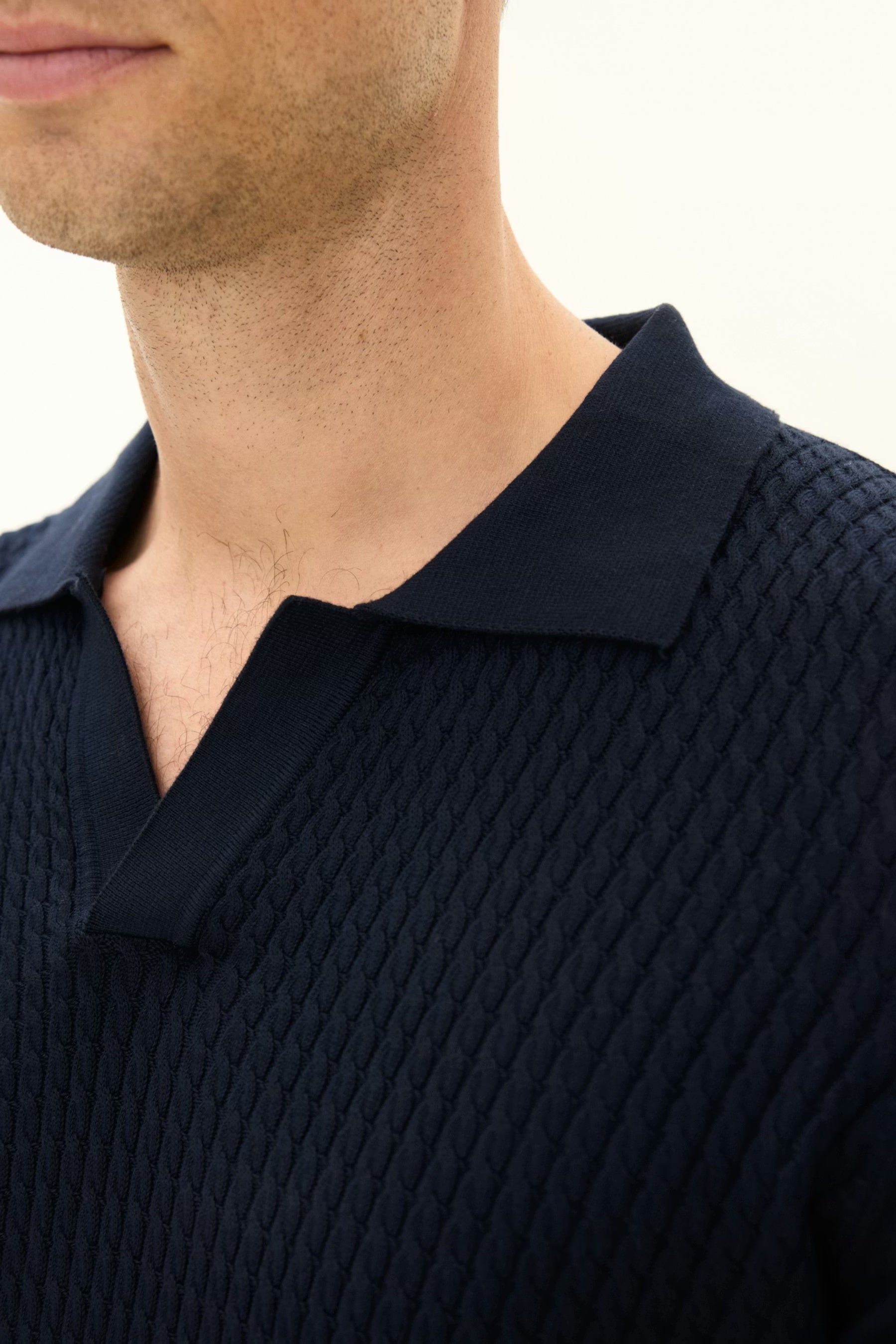 Short-sleeved knitted turtleneck jumper in garment-dyed cotton. Knitted in 12 gauge with a fine cable structure on the front. No buttons at the front for a more relaxed look. A great piece to wear with chinos, but can just as easily be worn under a casual suit or jacket.