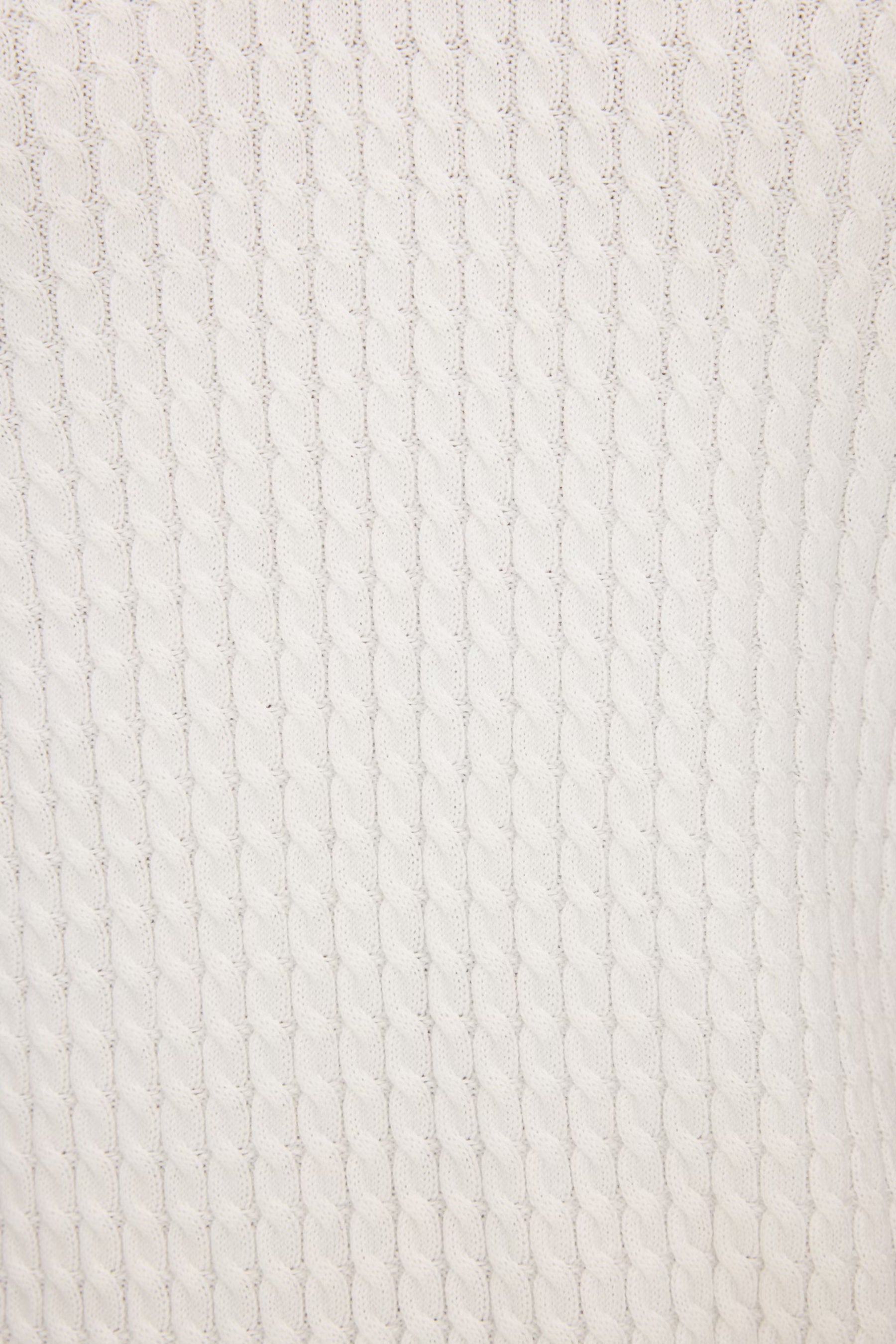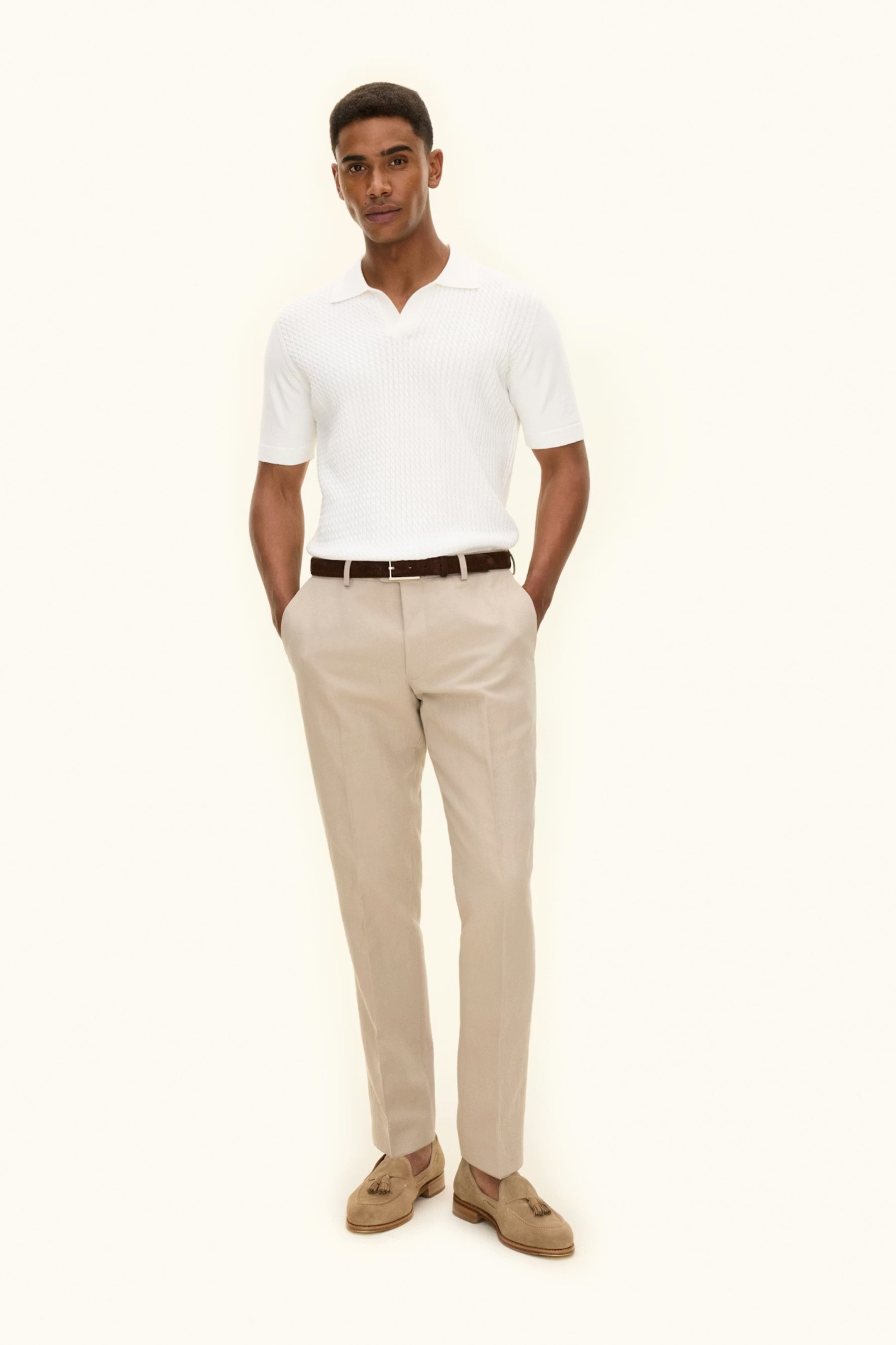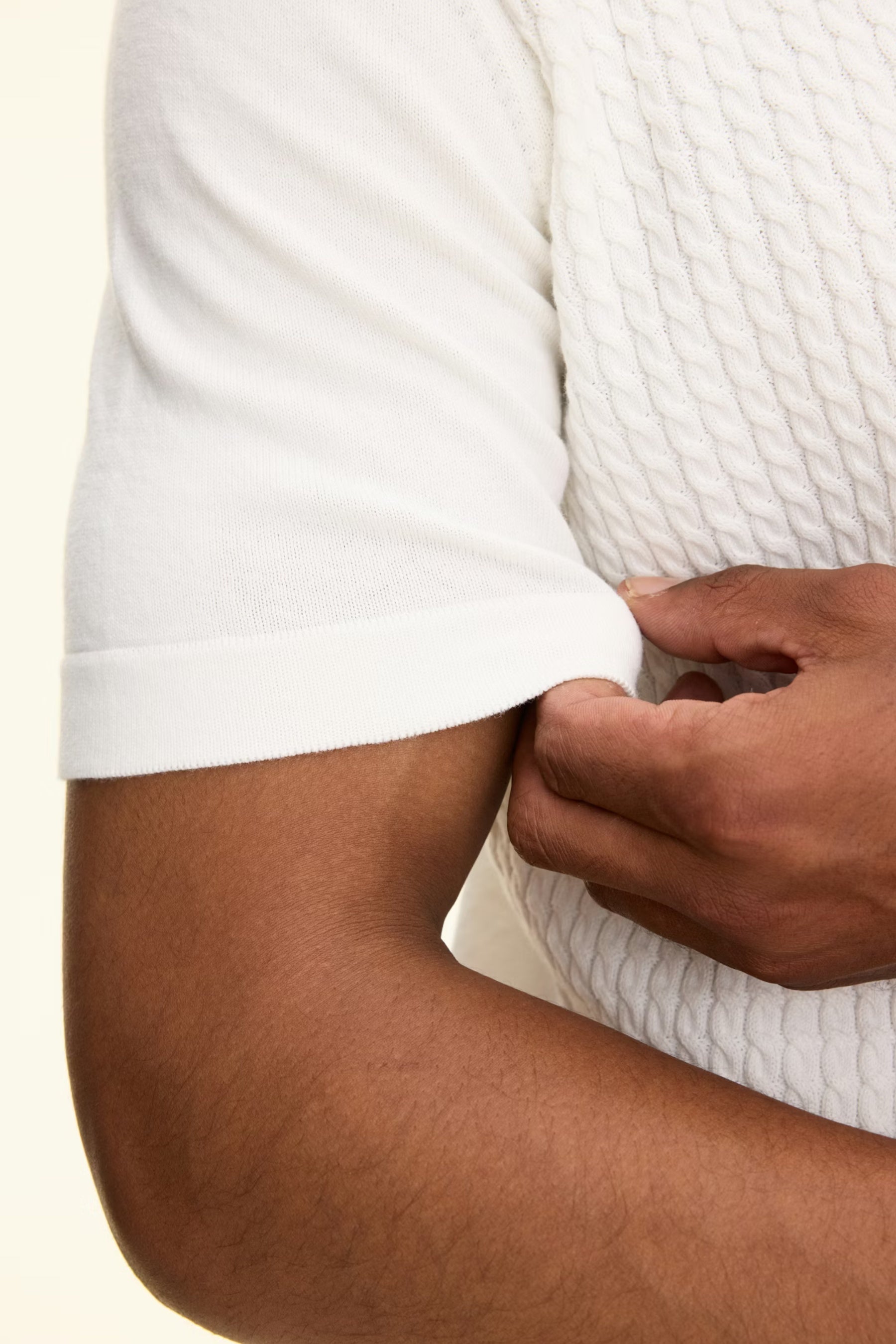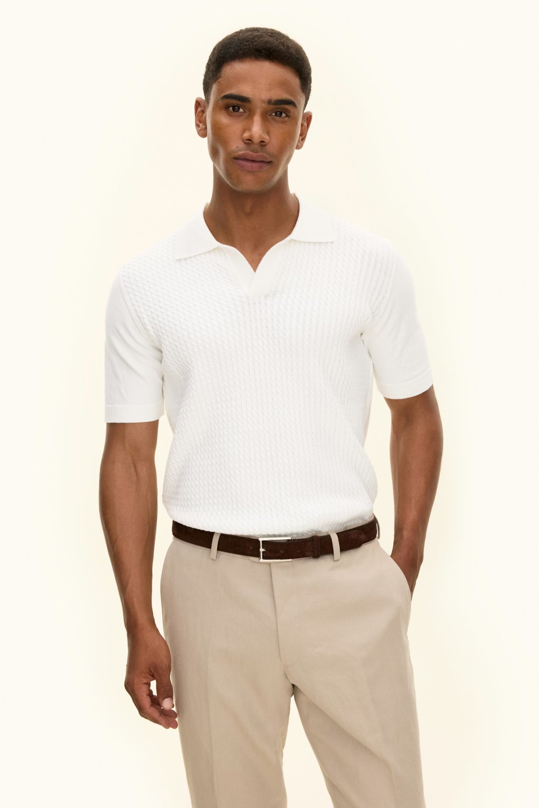 Short-sleeved knitted turtleneck jumper in garment-dyed cotton. Knitted in 12 gauge with a fine cable structure on the front. No buttons at the front for a more relaxed look. A great piece to wear with chinos, but can just as easily be worn under a casual suit or jacket.