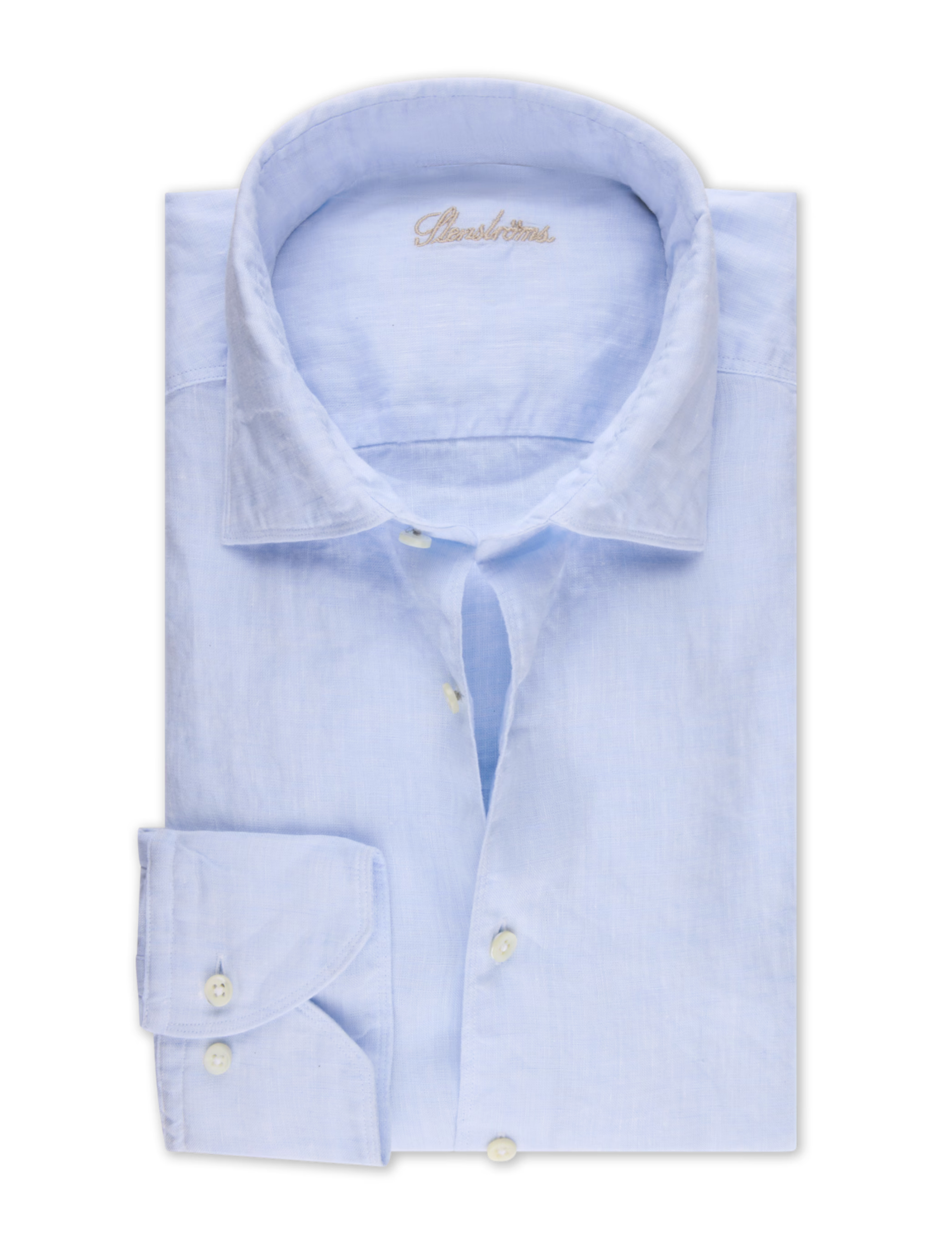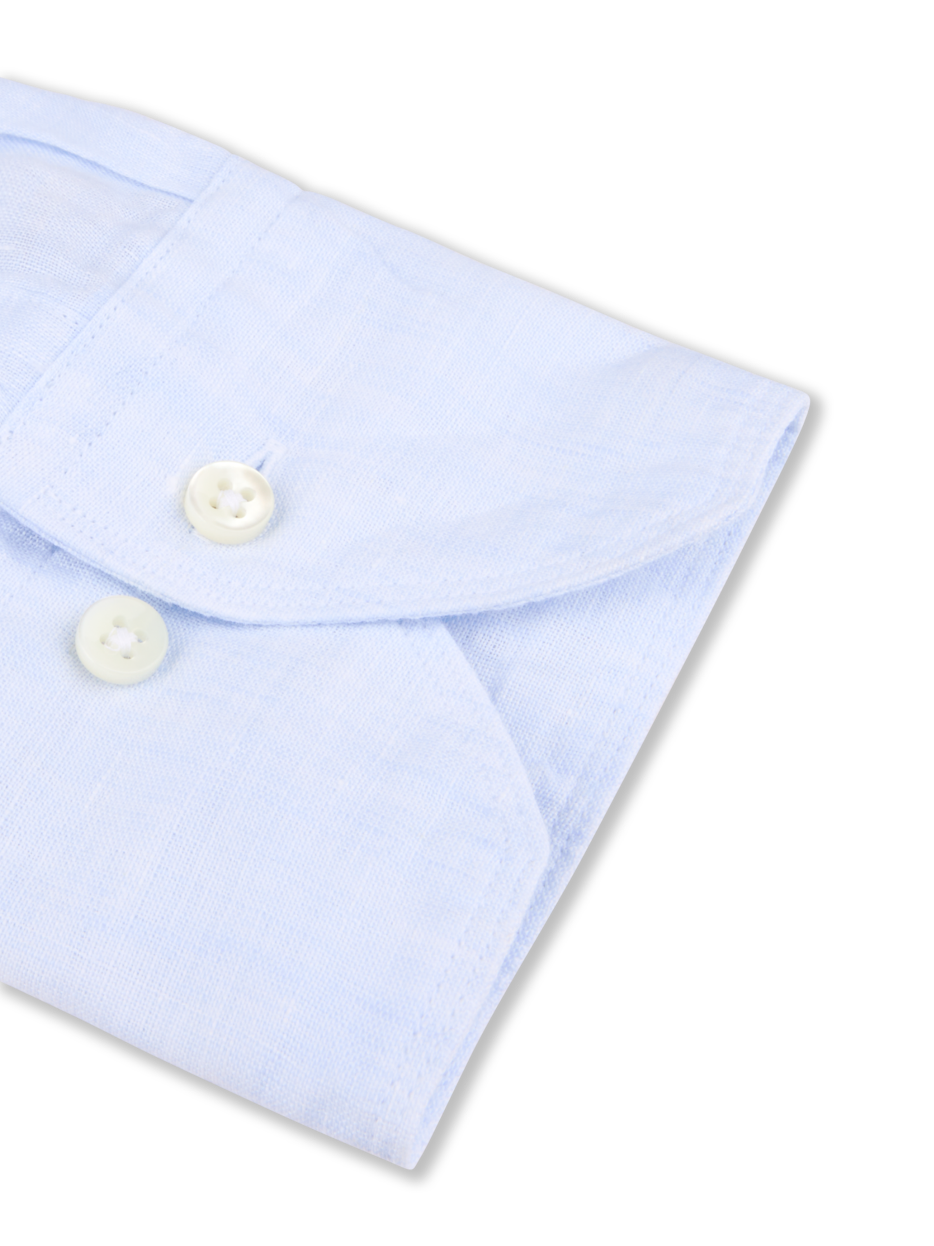 This shirt is made of linen. The shirt is detailed with mother of pearl buttons, single cuffs and a cut away collar.