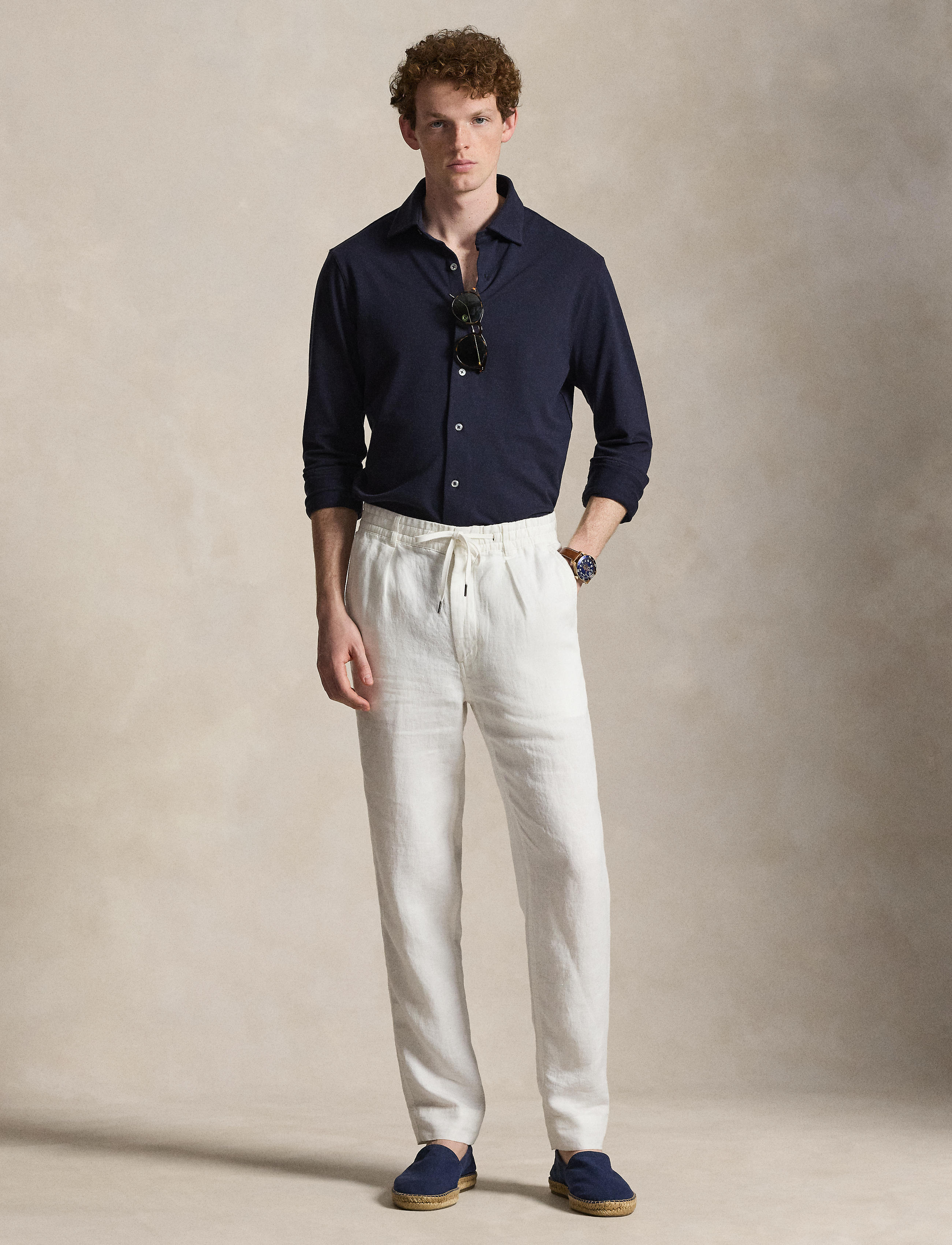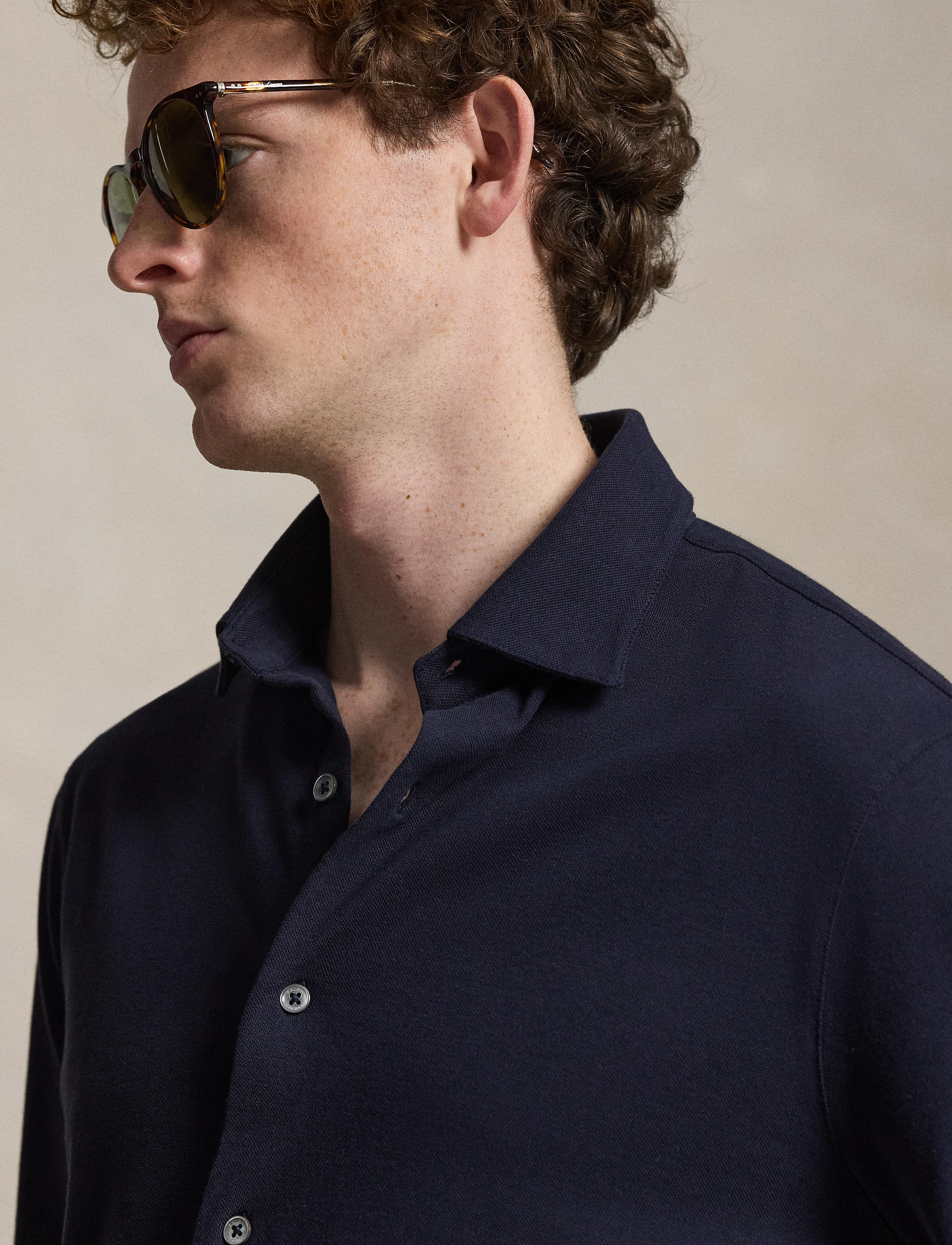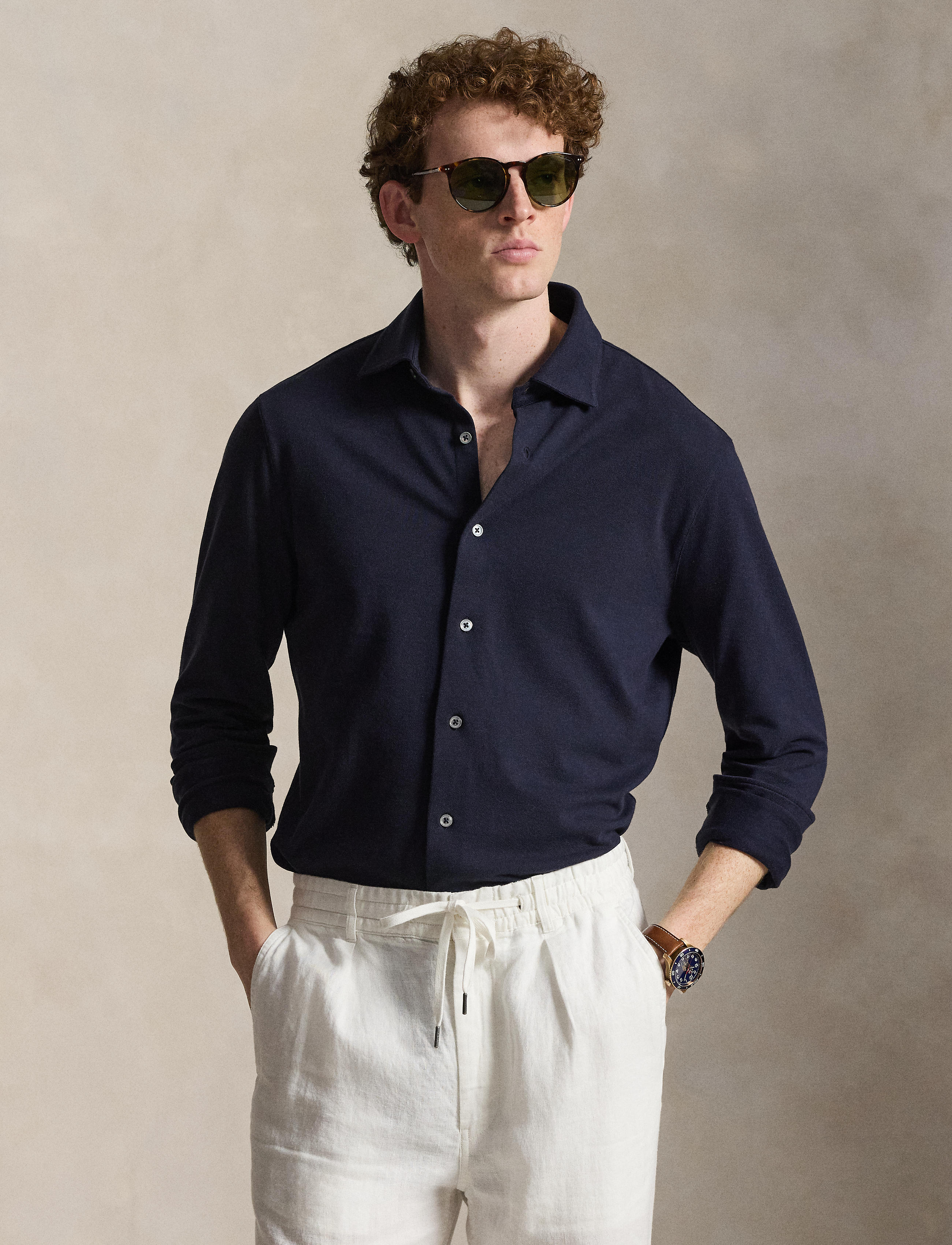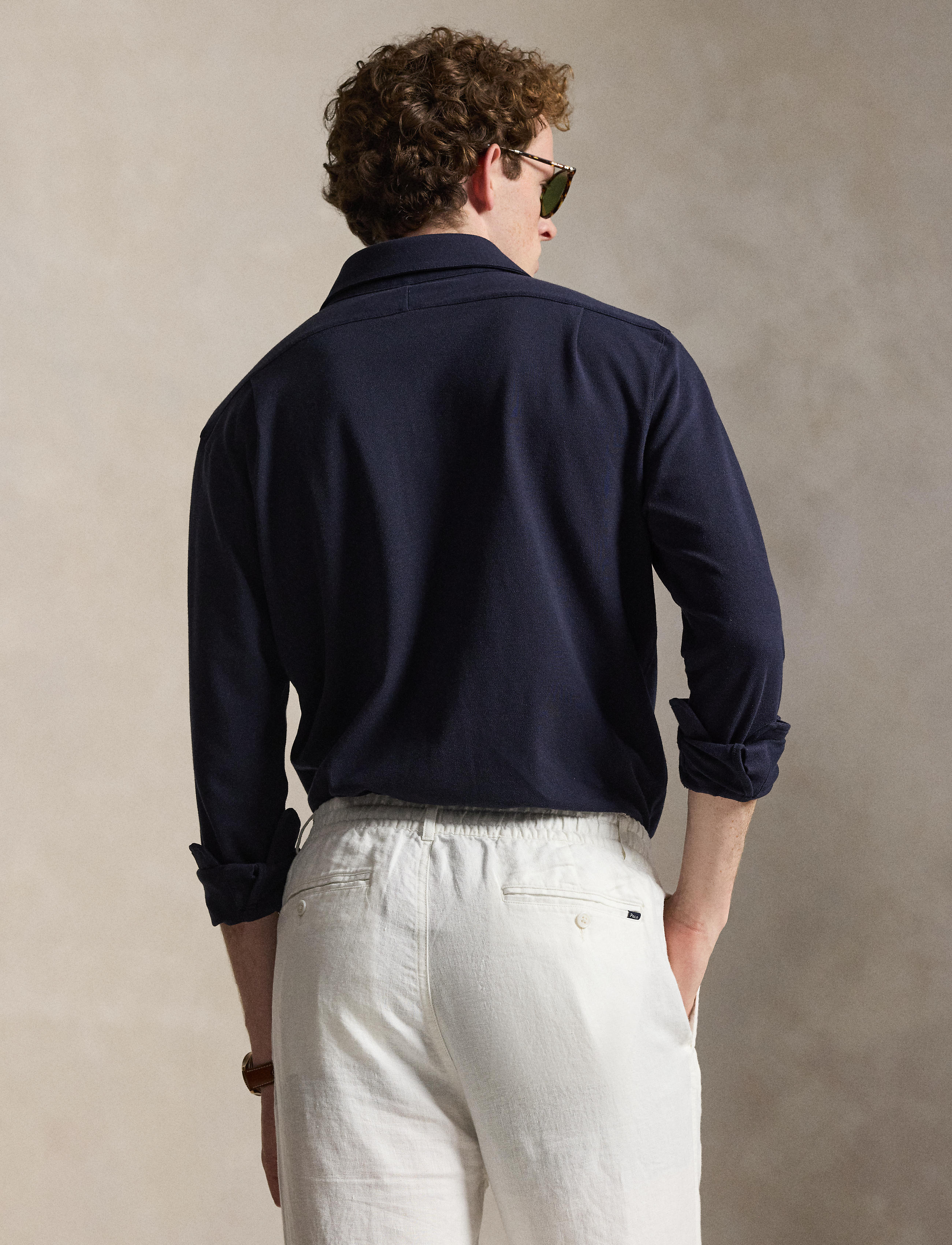 • Medium-spread collar. Buttoned placket. Genuine mother-of-pearl buttons custom-developed with a “Ralph Lauren” logo.