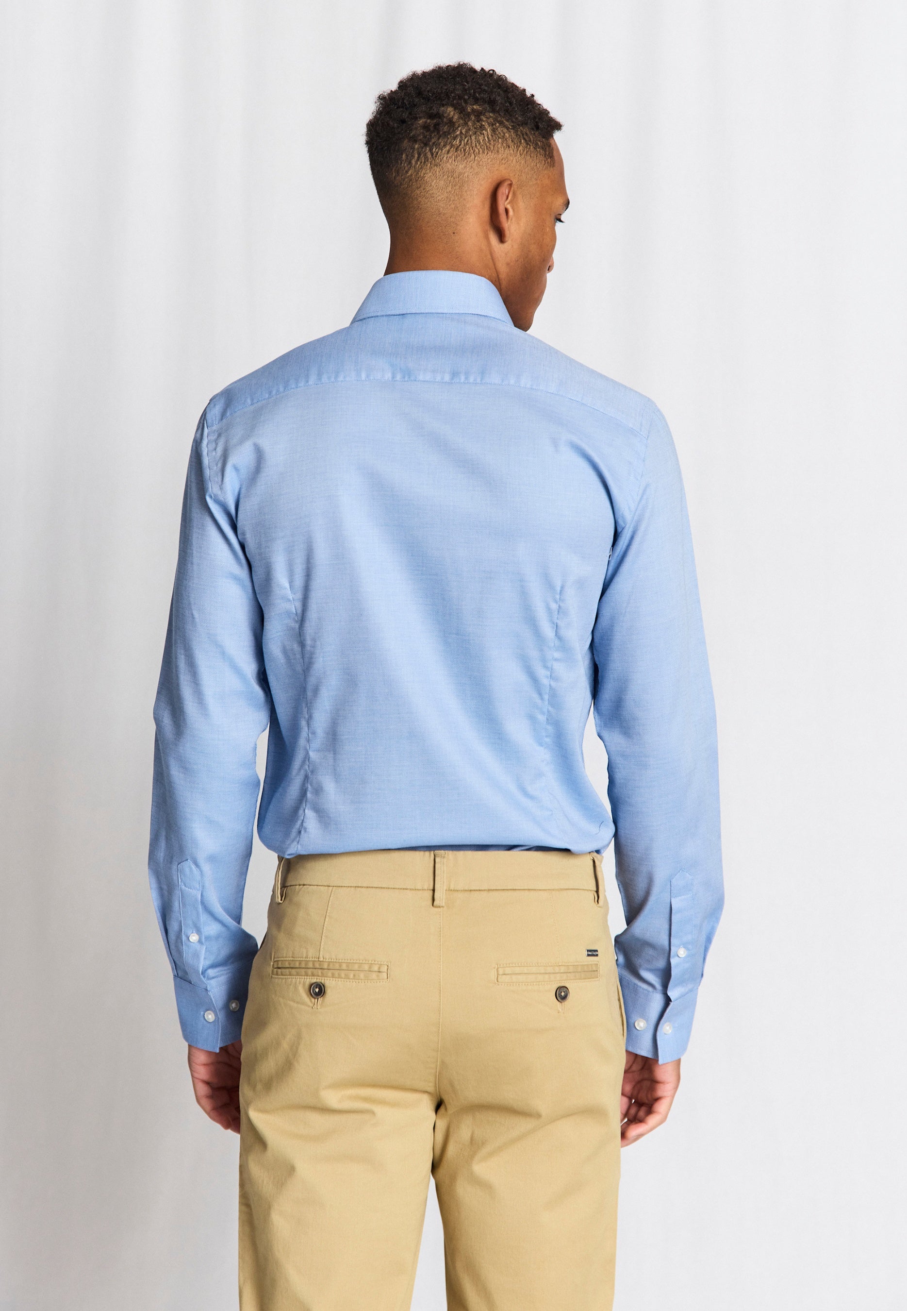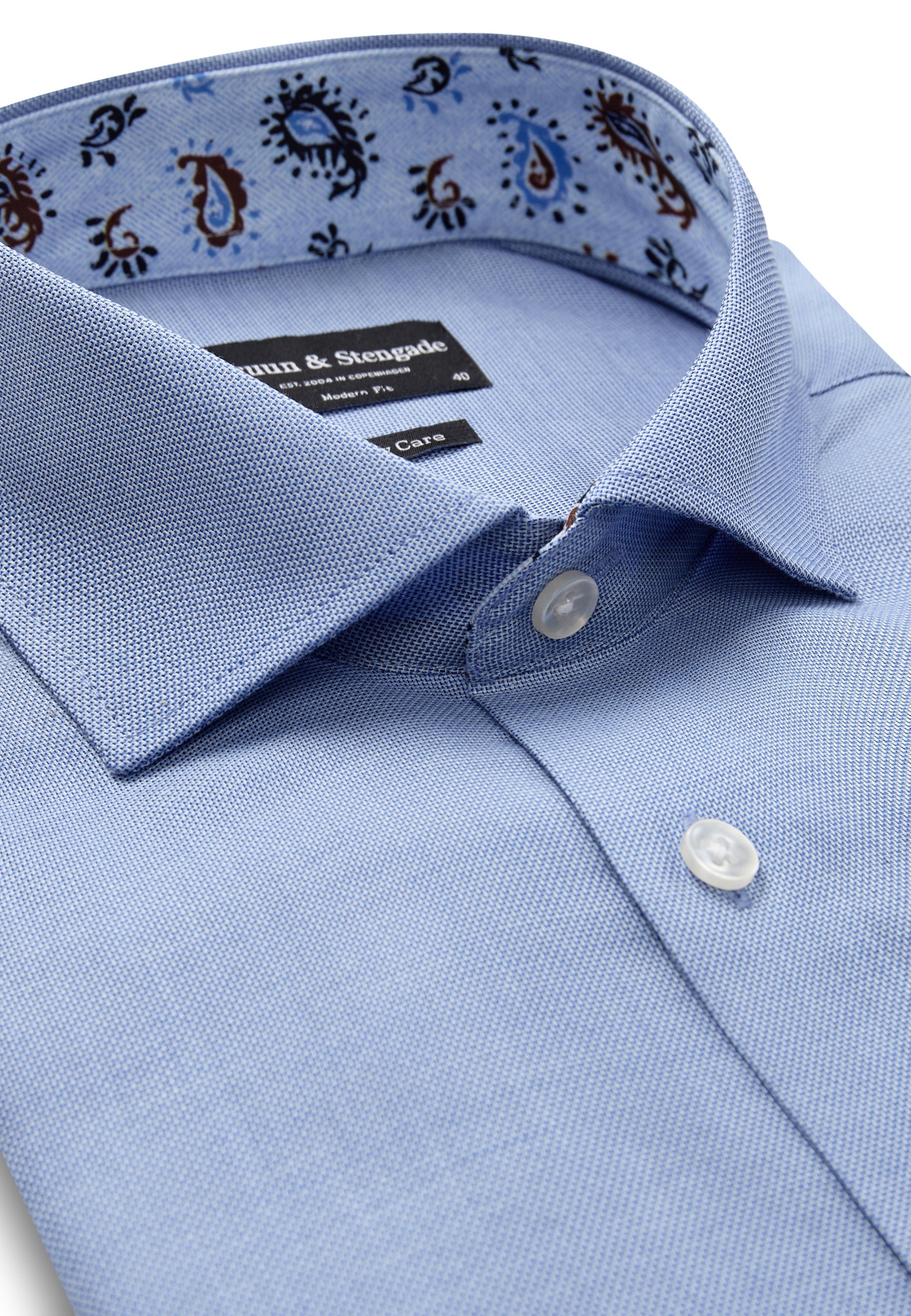 Our Modern fit formal shirt is perfect for those who prefer a wider fit in both the body and sleeves. Made from 100% cotton with a combination of twill and dobby weave. The design includes a classic cutaway collar, French placket with pearl buttons, and adjustable cuffs.