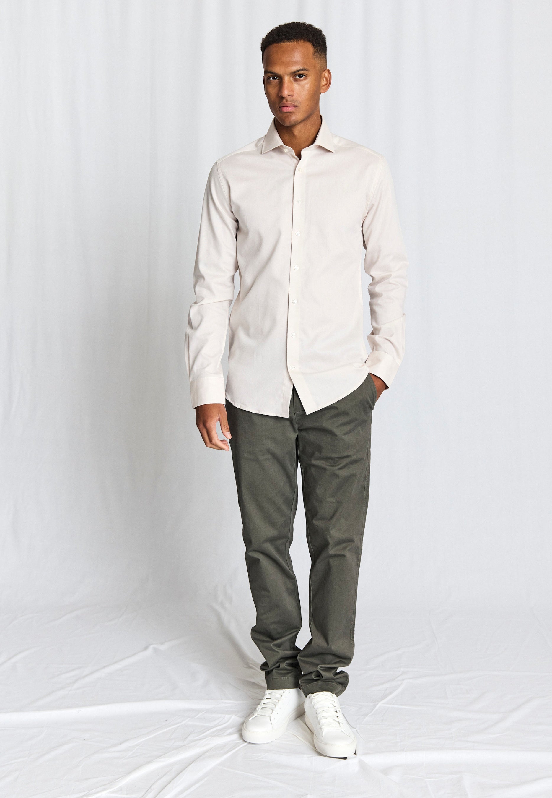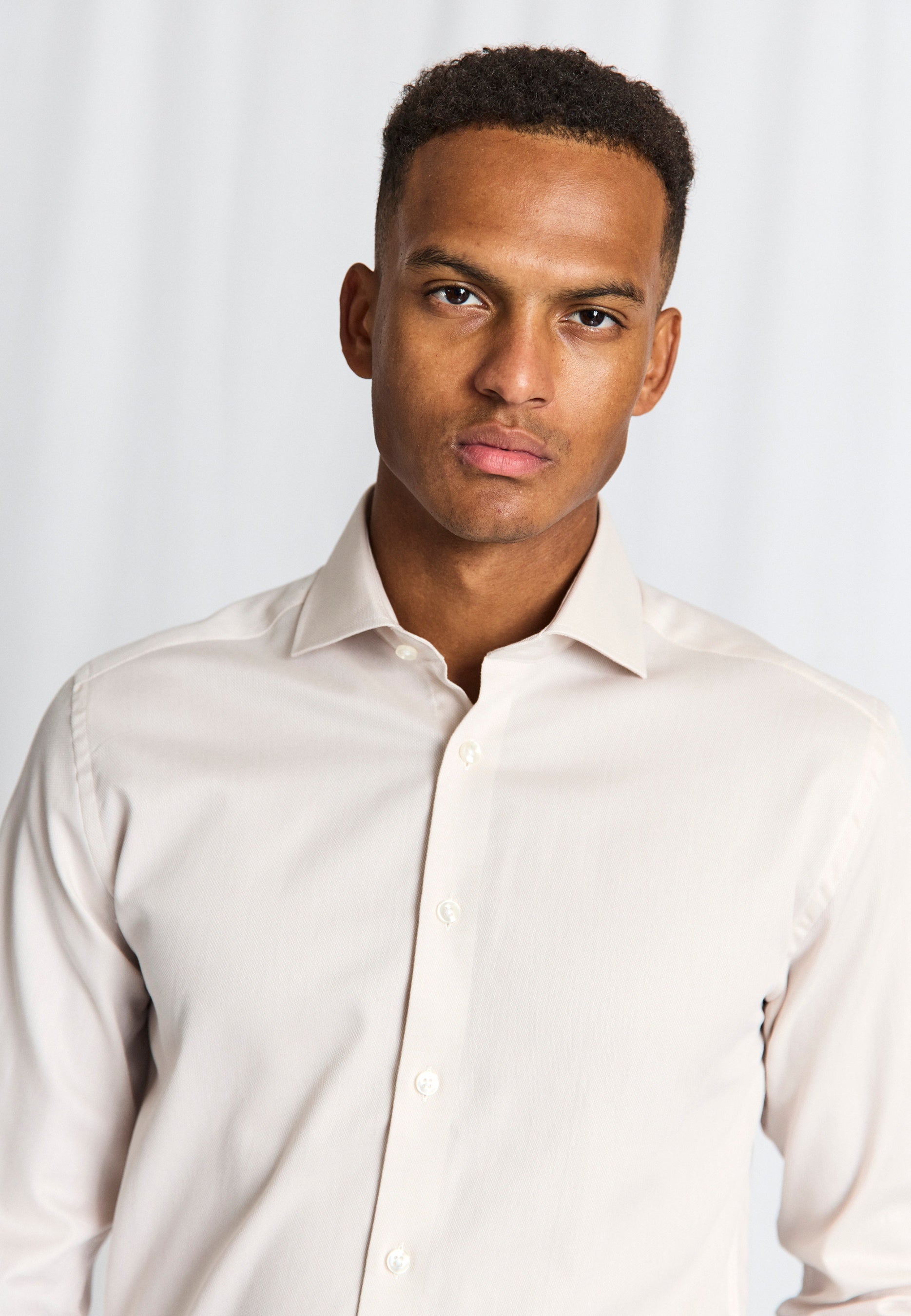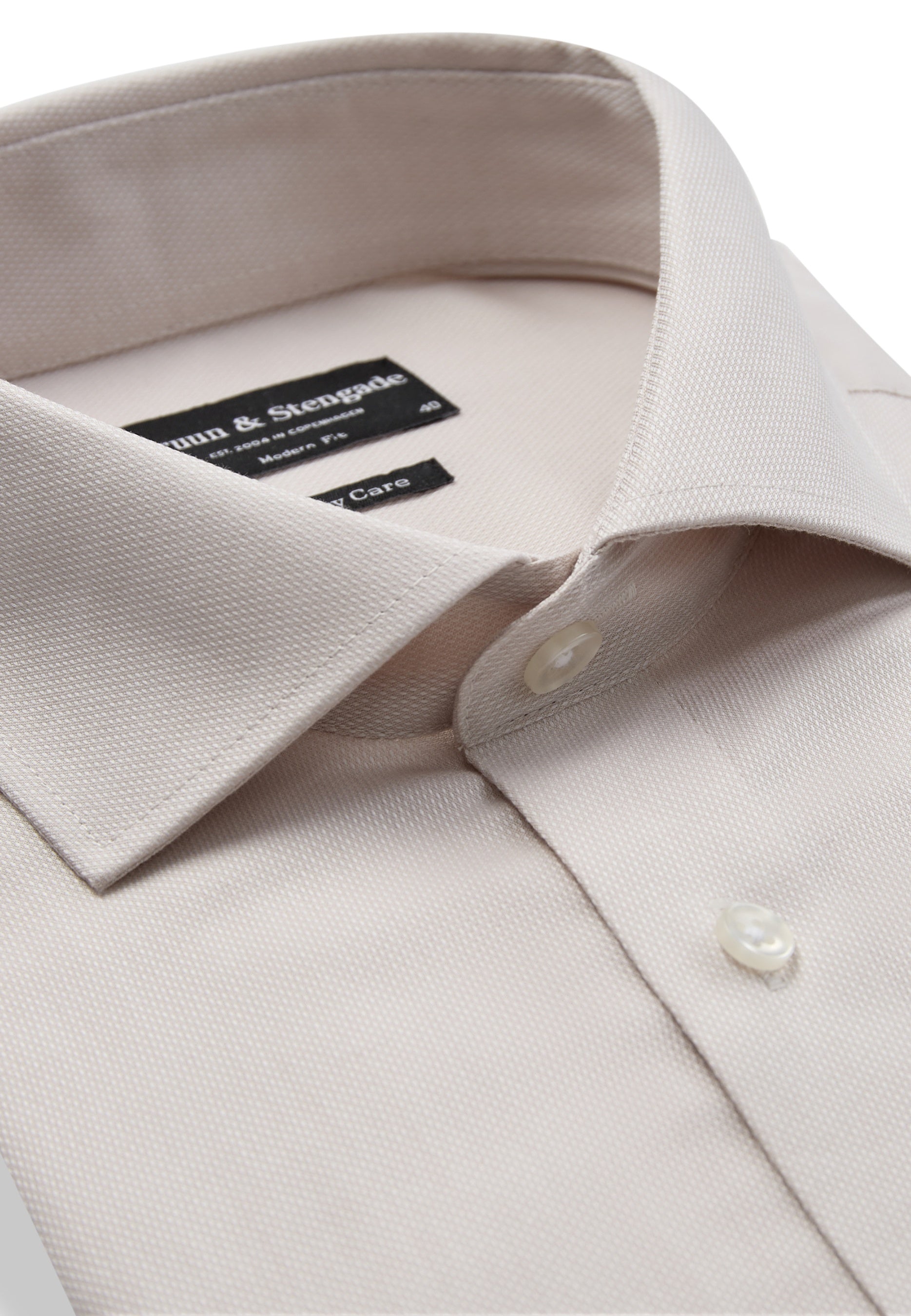 Our Modern fit formal shirt is perfect for those who prefer a wider fit in both the body and sleeves. Made from 100% cotton with a combination of twill and dobby weave. The design includes a classic cutaway collar, French placket with pearl buttons, and adjustable cuffs.