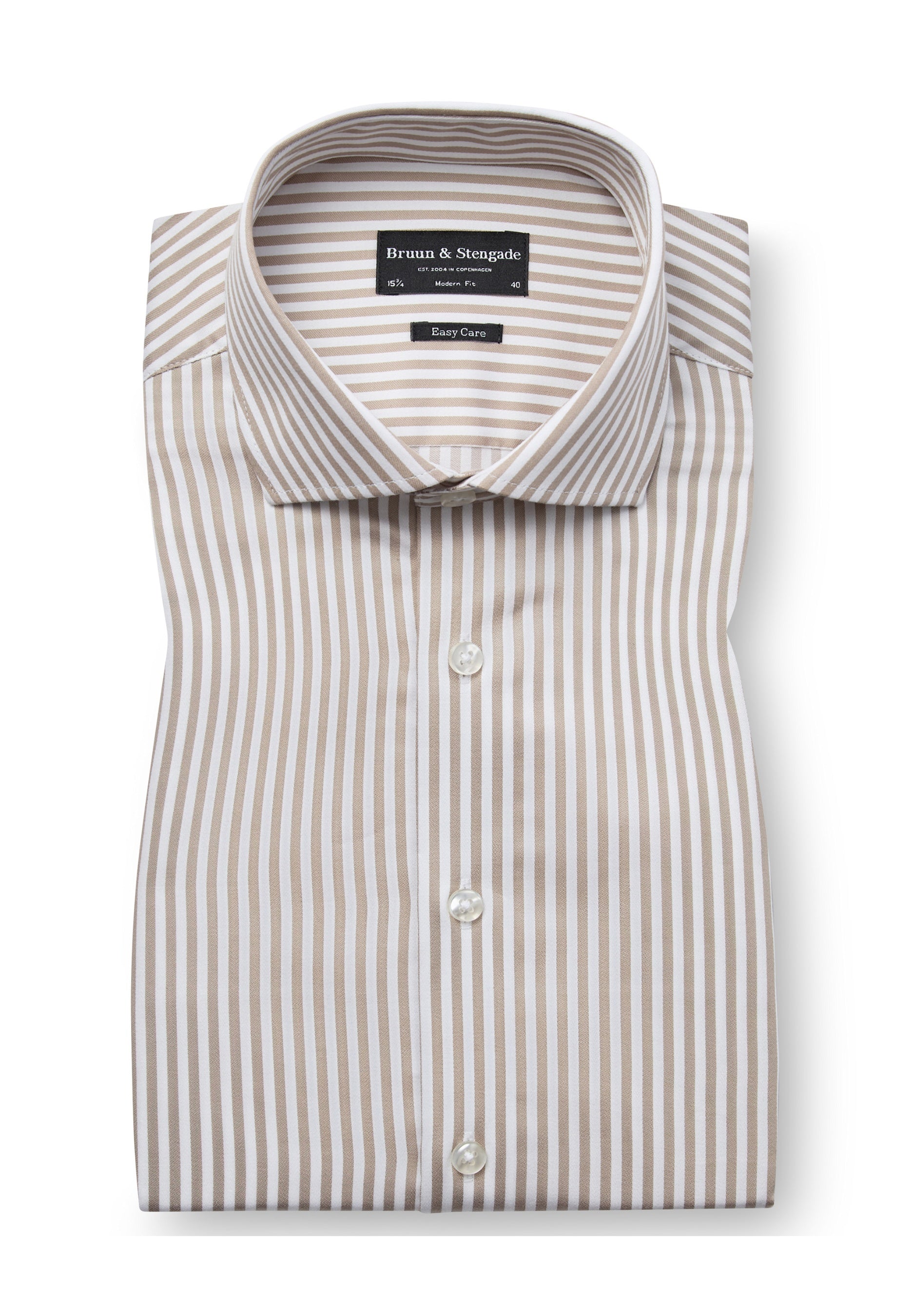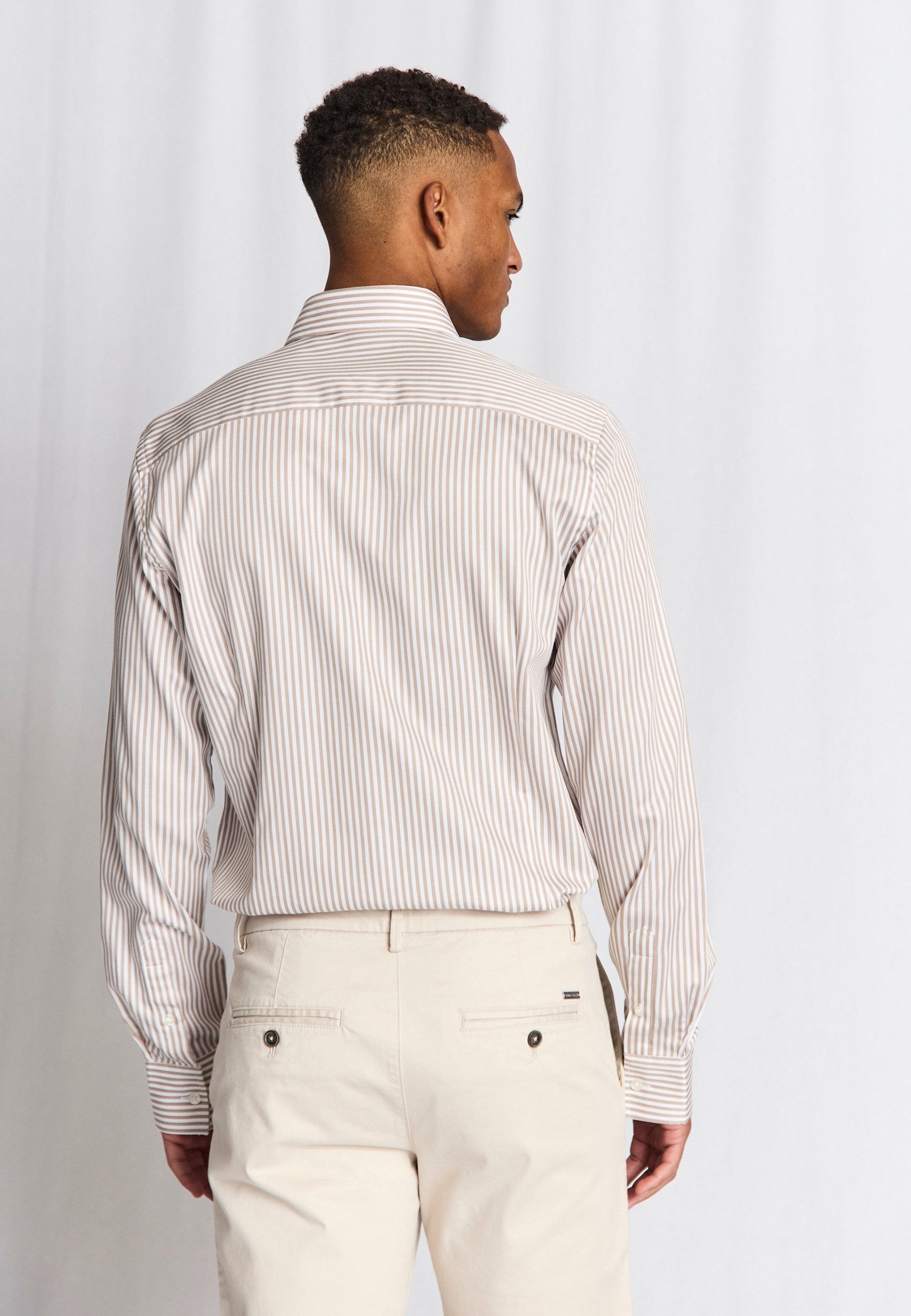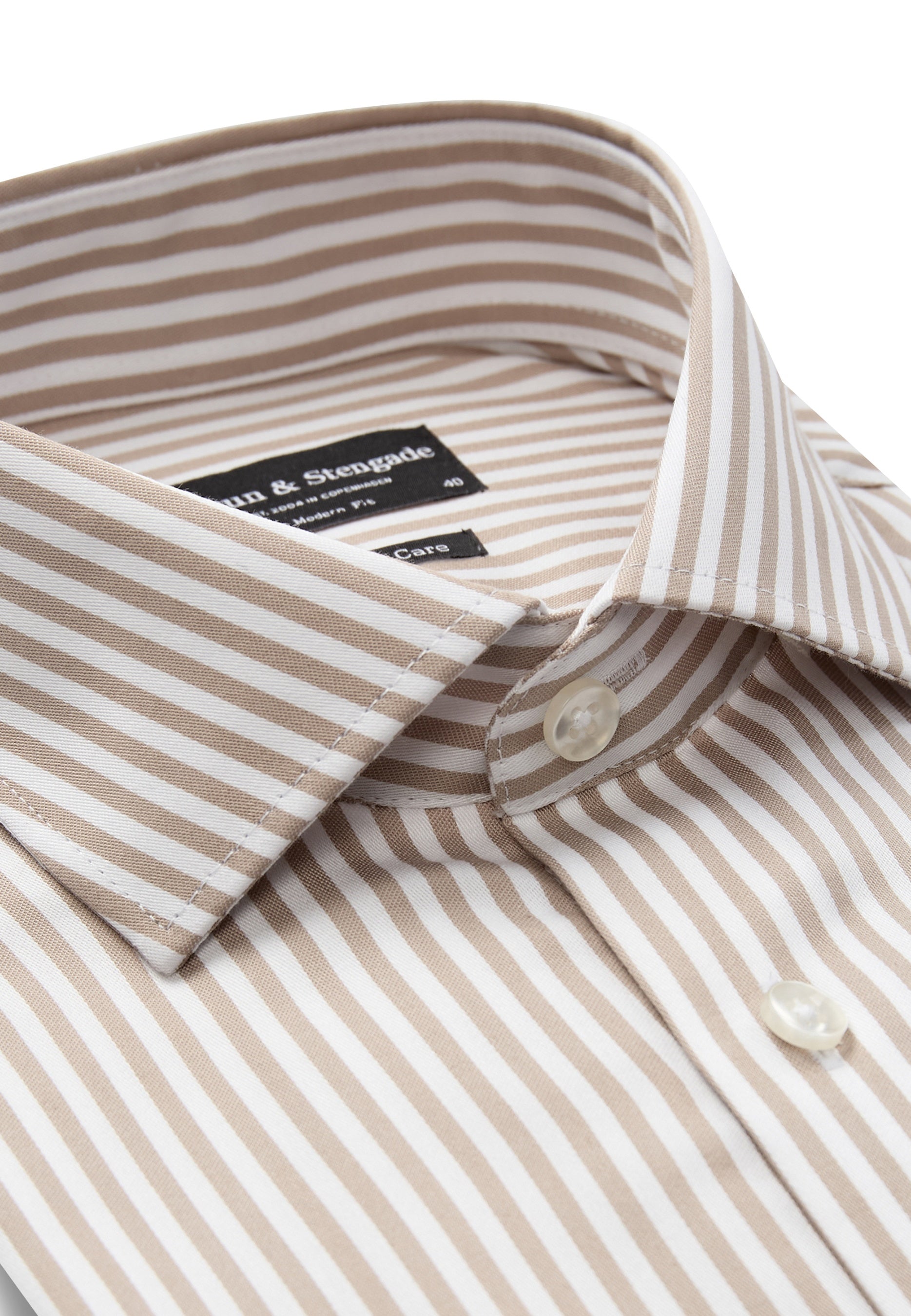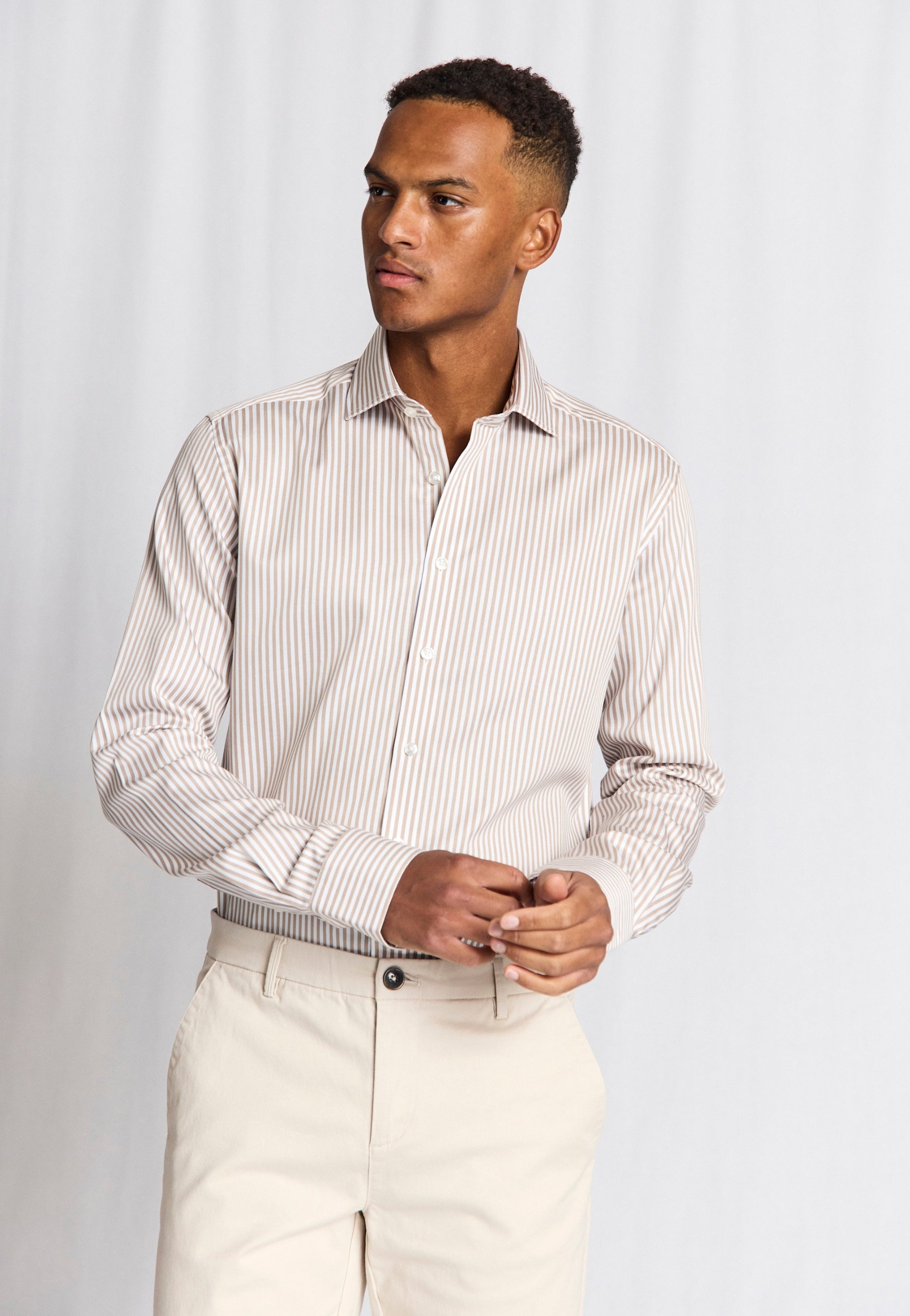 Our Modern fit formal shirt is perfect for those who prefer a wider fit in both the body and sleeves. Made from 100% cotton with a combination of twill and dobby weave. The design includes a classic cutaway collar, French placket with pearl buttons, and adjustable cuffs.