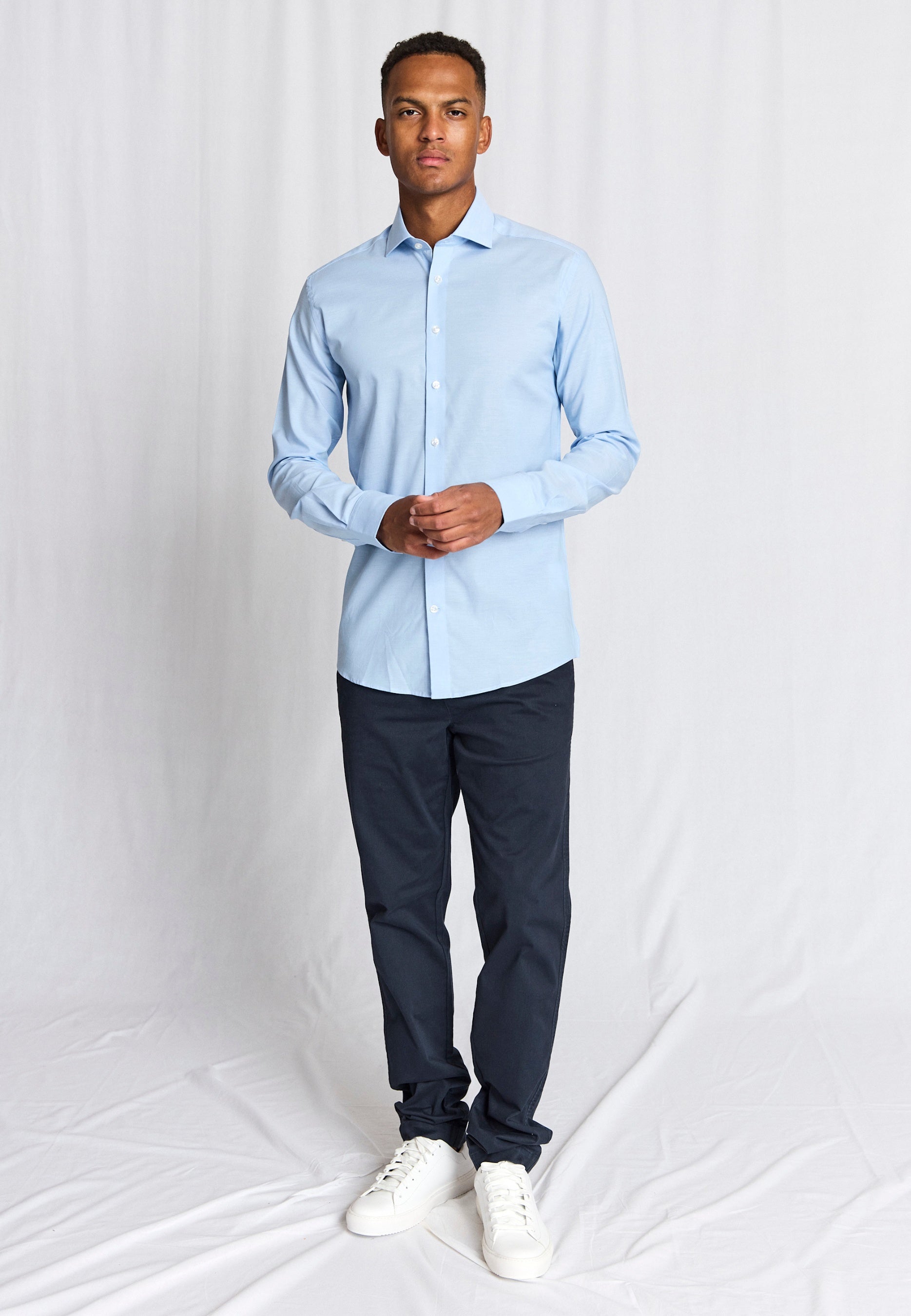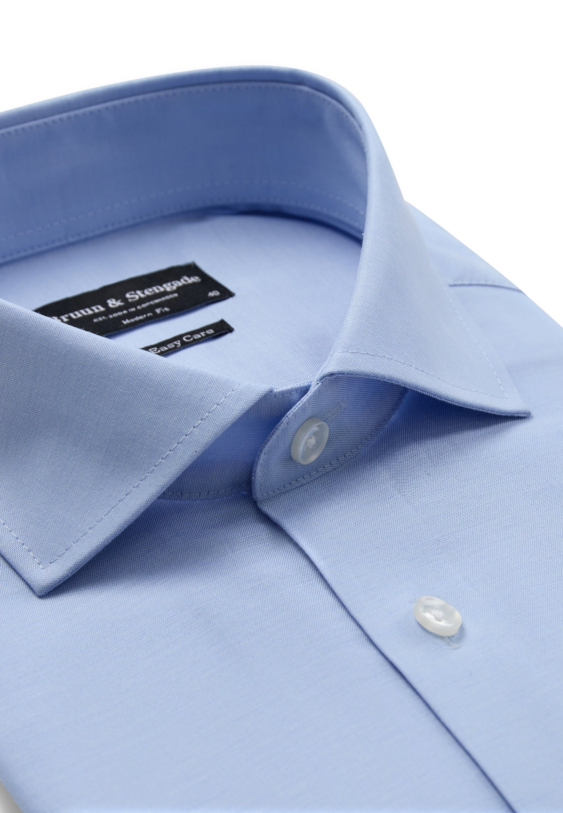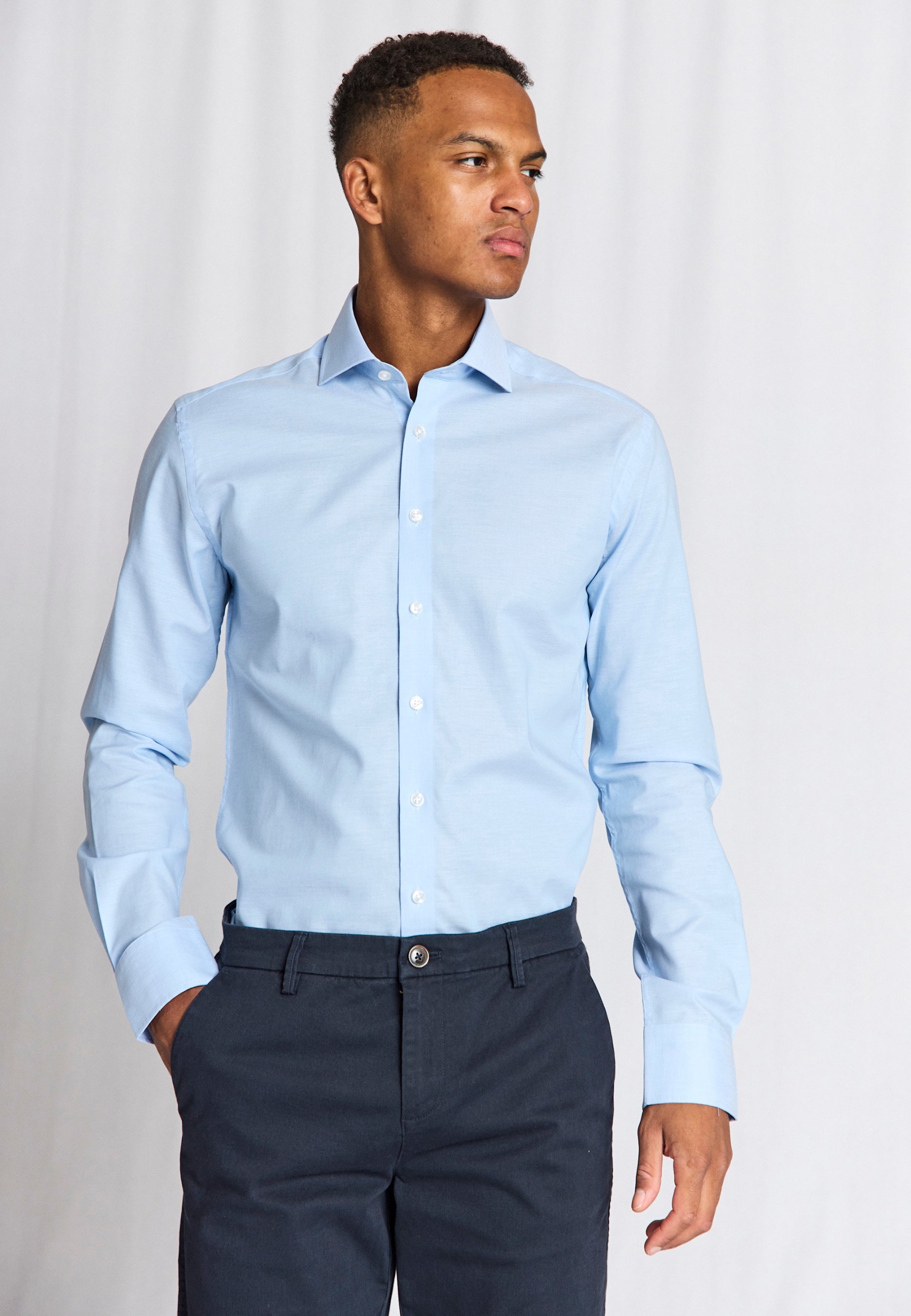 Our Modern fit formal shirt is perfect for those who prefer a wider fit in both the body and sleeves. Made from 100% cotton with a combination of twill and dobby weave. The design includes a classic cutaway collar, French placket with pearl buttons, and adjustable cuffs.