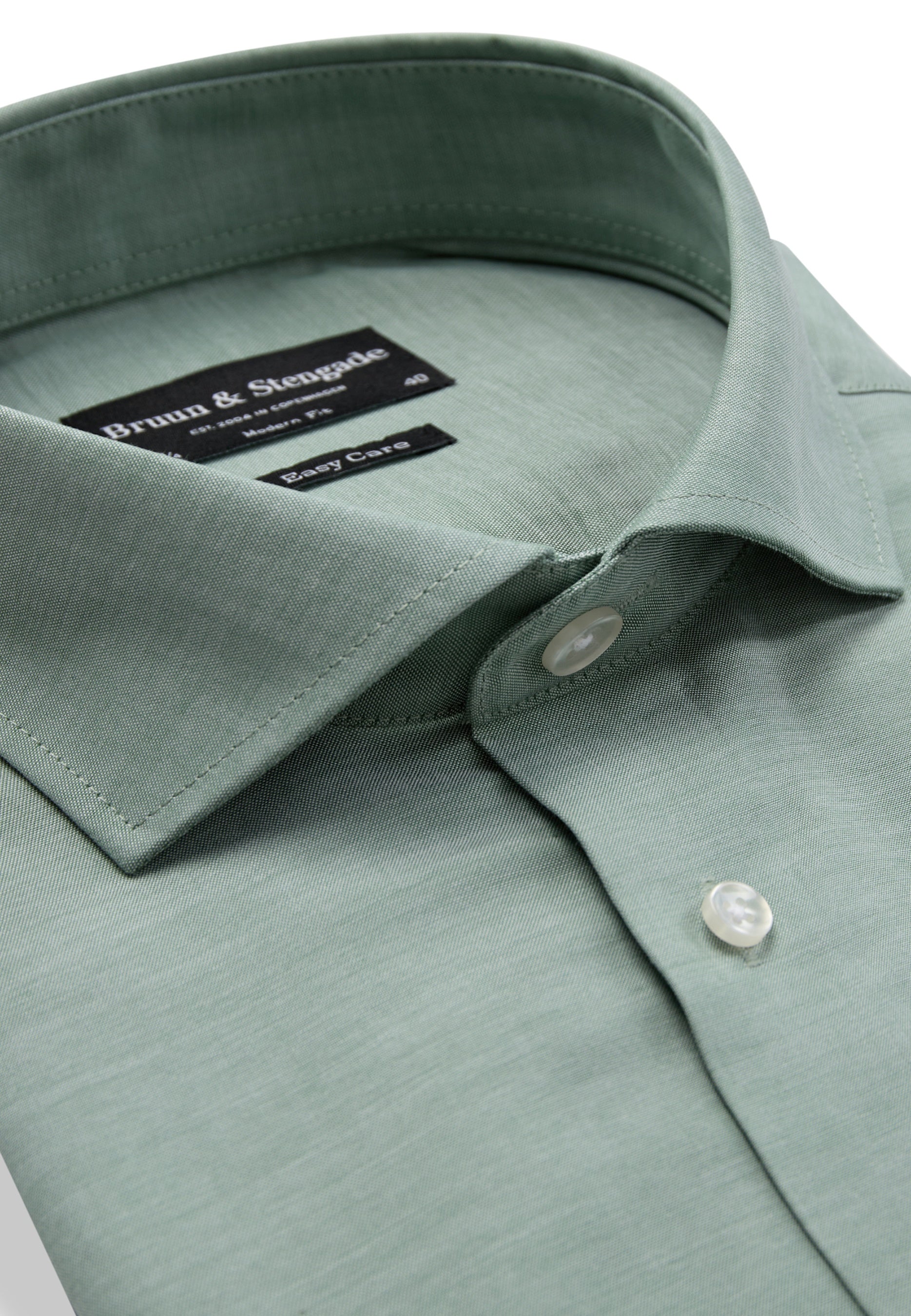 Our Modern fit formal shirt is perfect for those who prefer a wider fit in both the body and sleeves. Made from 100% cotton with a combination of twill and dobby weave. The design includes a classic cutaway collar, French placket with pearl buttons, and adjustable cuffs.