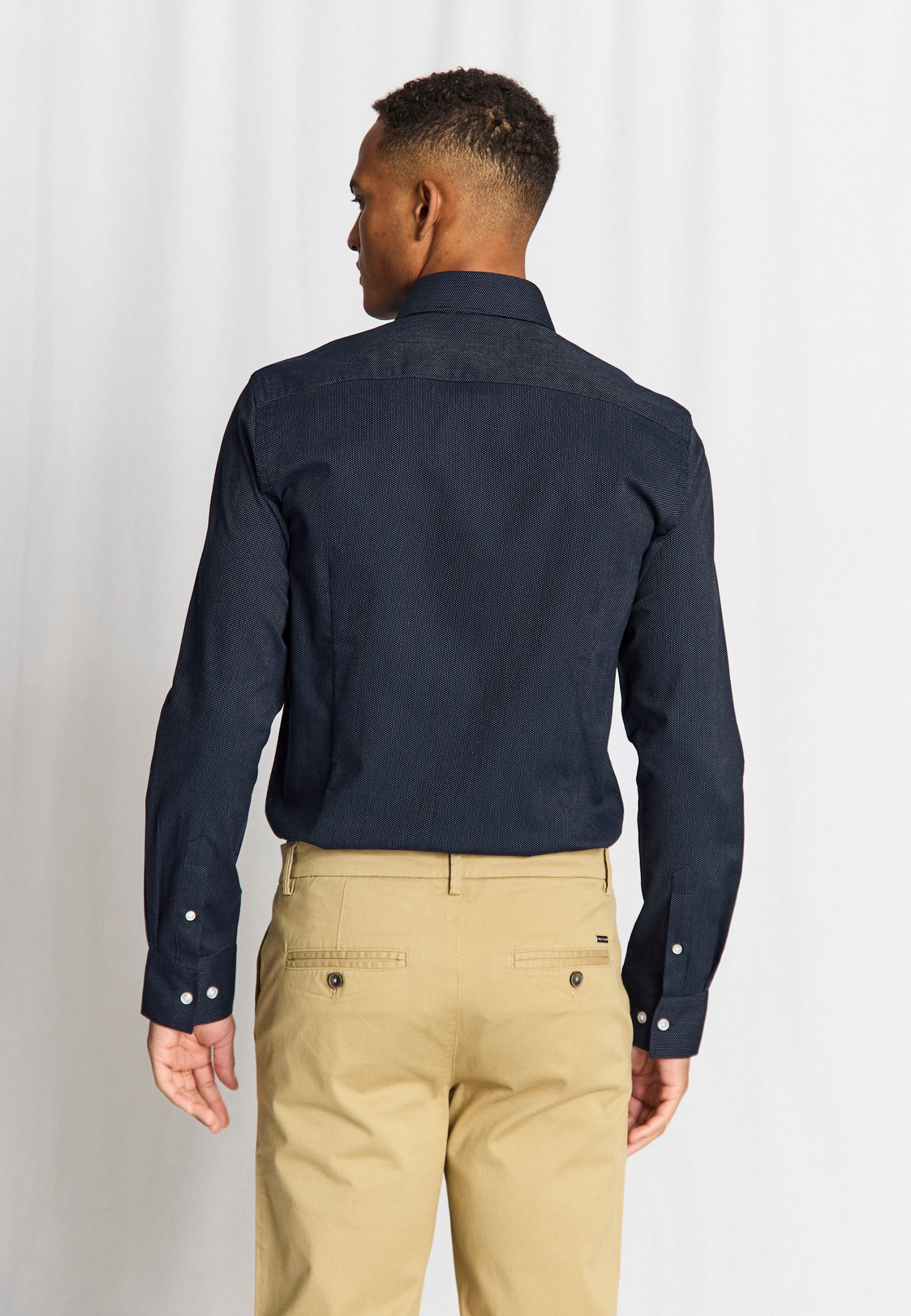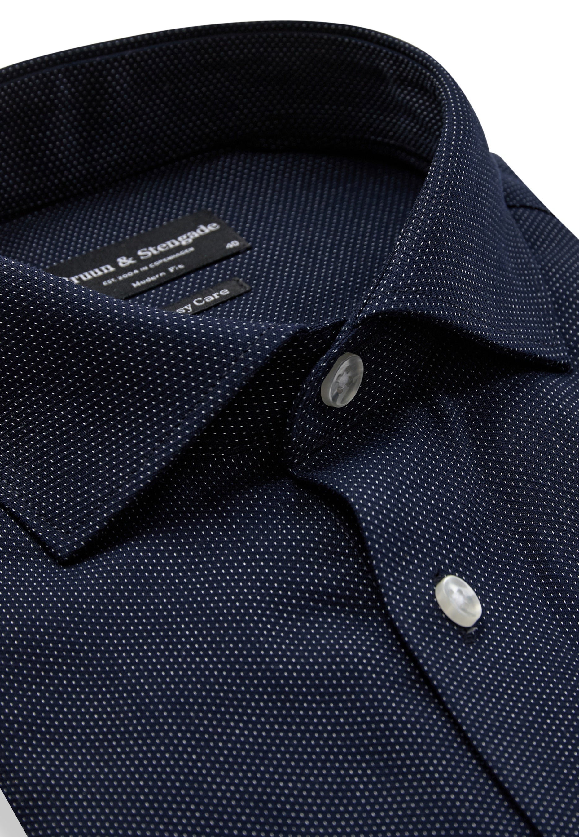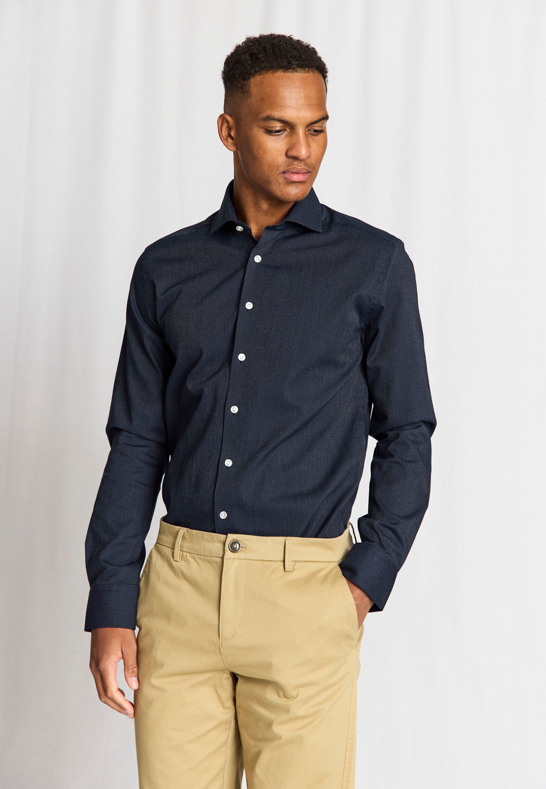 Our Modern fit formal shirt is perfect for those who prefer a wider fit in both the body and sleeves. Made from 100% cotton with a combination of twill and dobby weave. The design includes a classic cutaway collar, French placket with pearl buttons, and adjustable cuffs.
