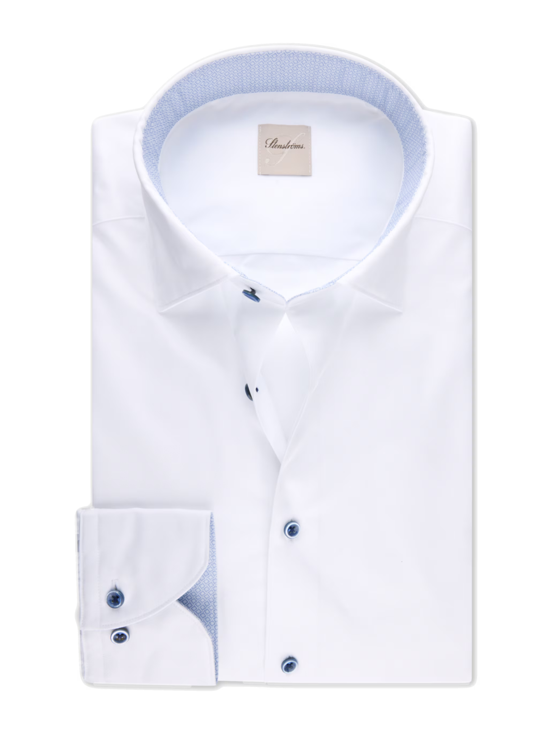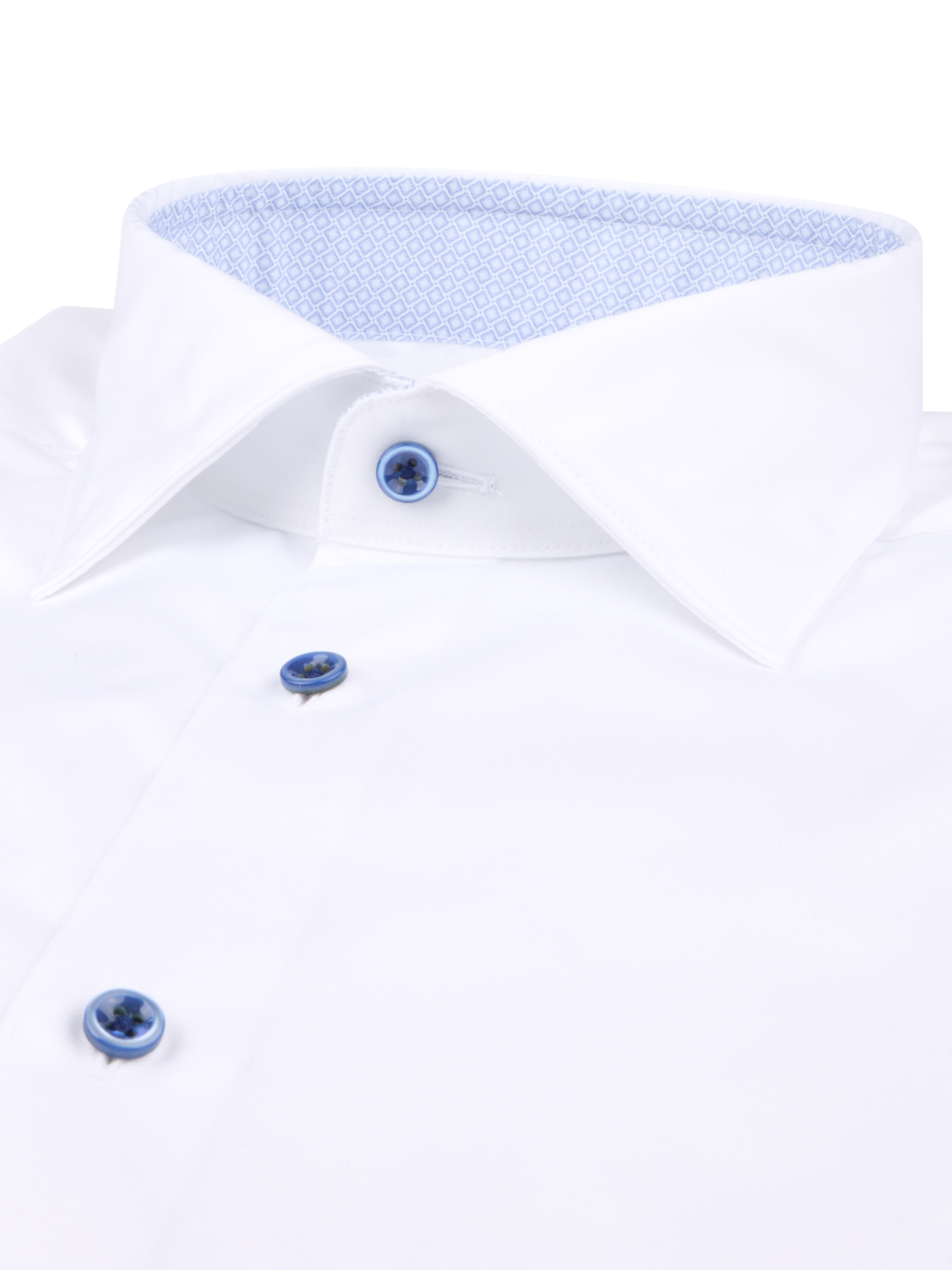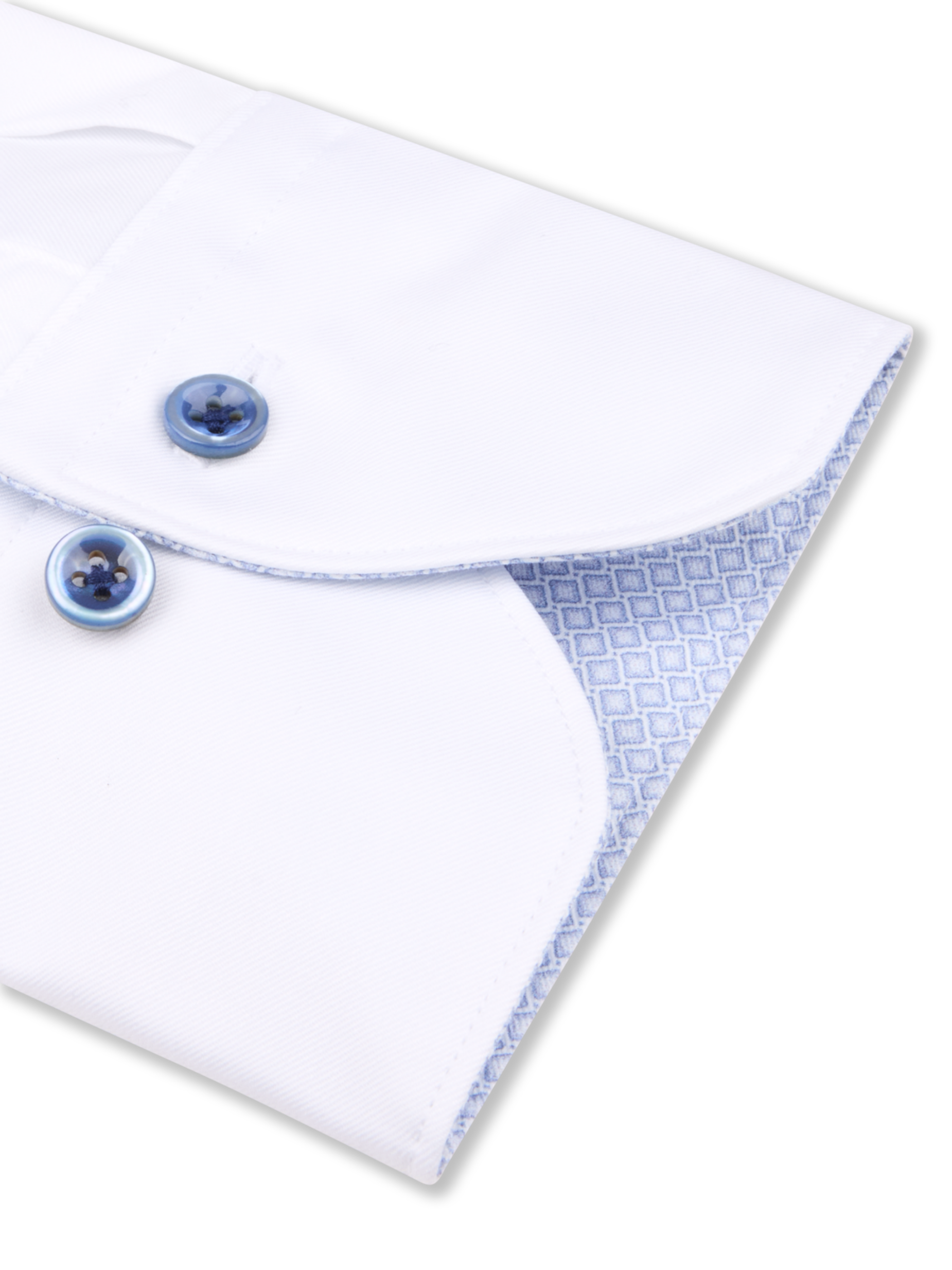 This twill shirt is made of twofold cotton. The shirt is designed with contrast inside collar and cuffs and is detailed with mother of pearl buttons, single cuffs and a cut away collar.
