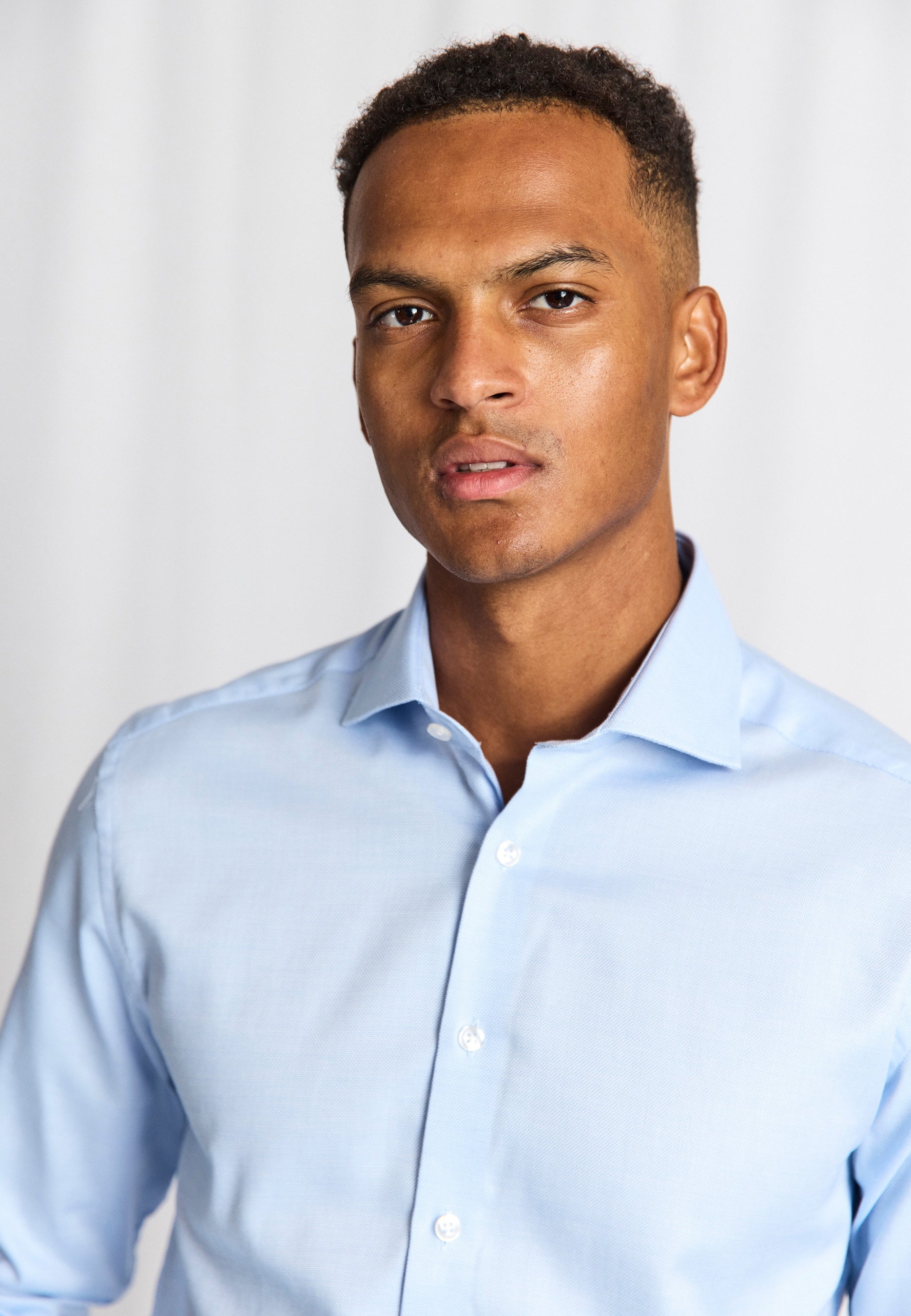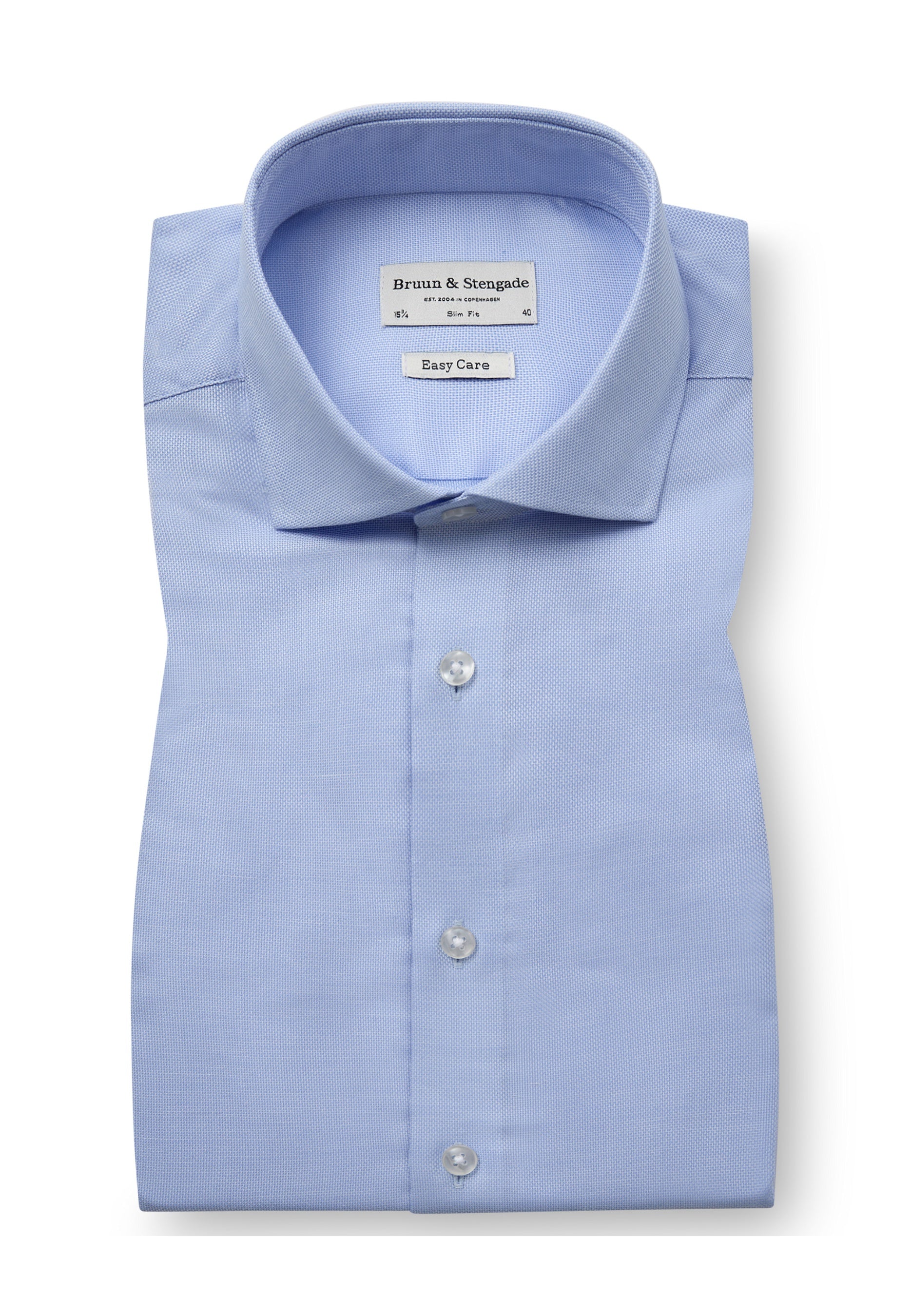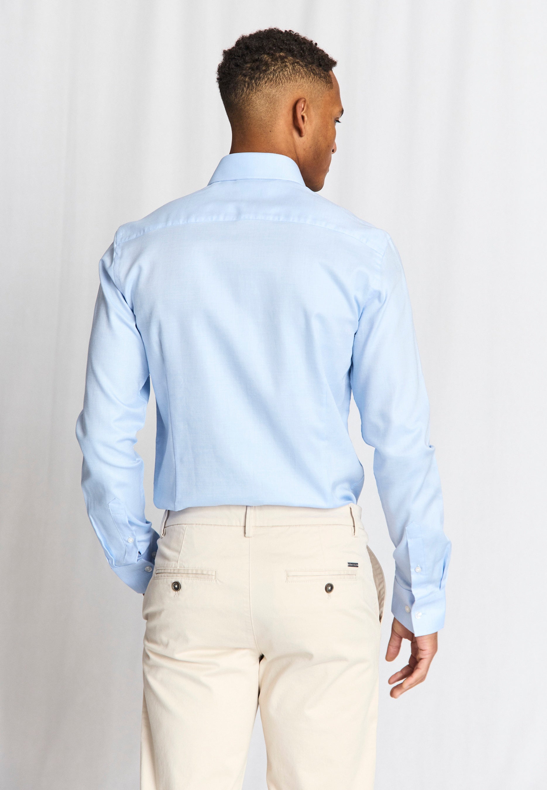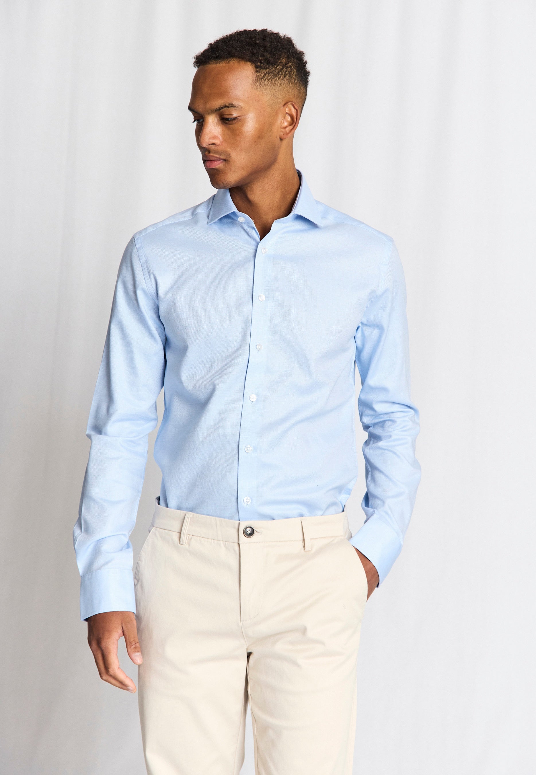 Our slim fit formal shirt is the ideal choice for those who prefer a close-fitting style. The shirt is made from 100% cotton in an elegant dobby weave that adds texture. The classic design features a cutaway collar, French placket with pearl buttons, and adjustable cuffs, making it suitable for both business wear and formal occasions.