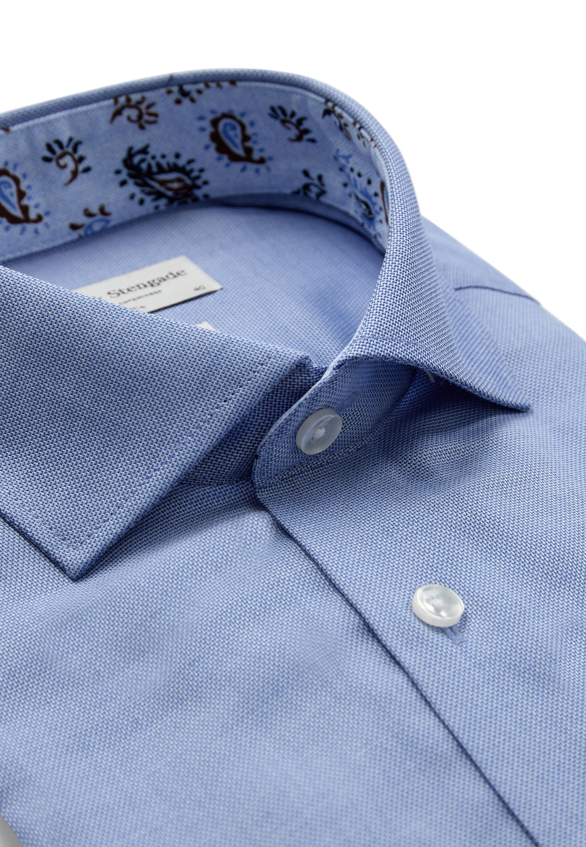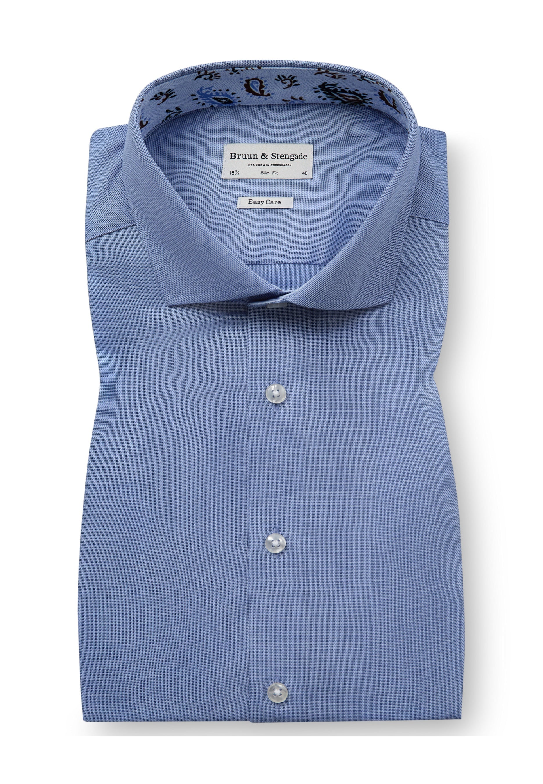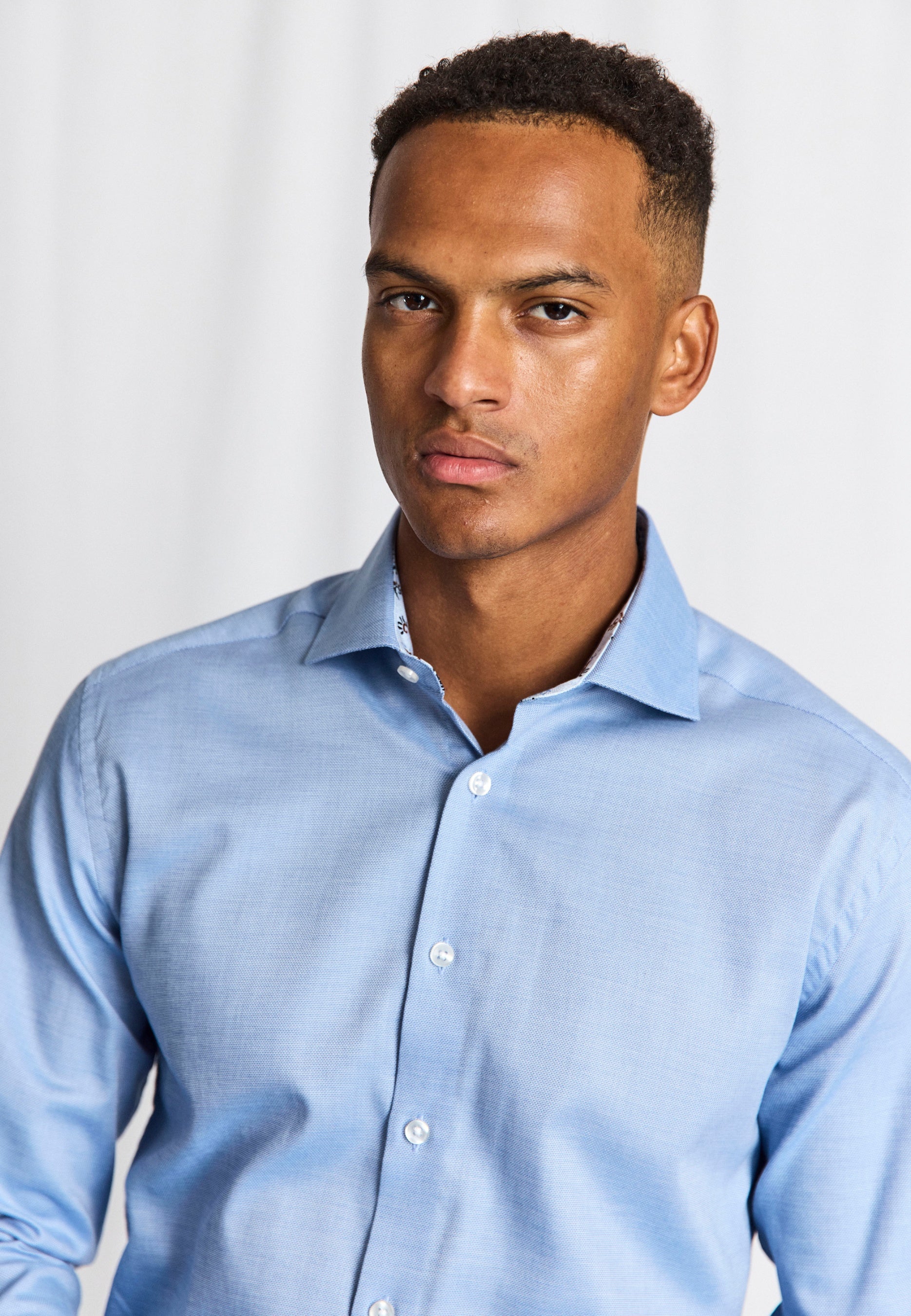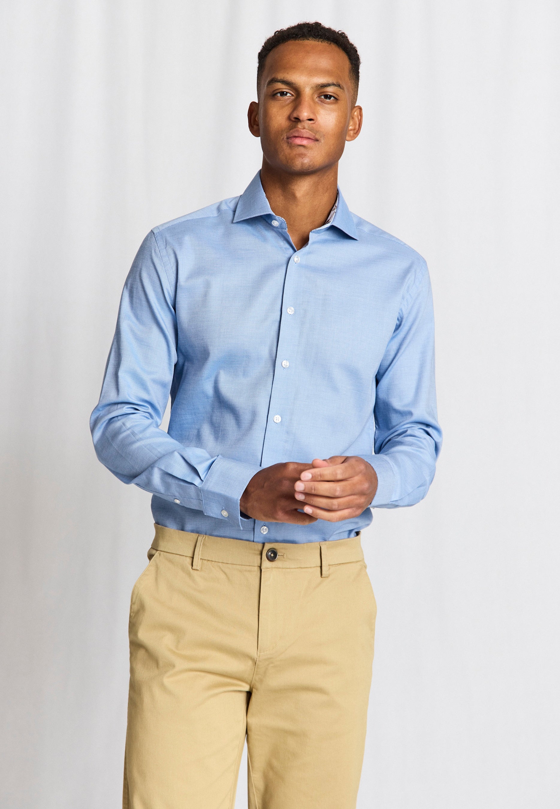 Our slim fit formal shirt is the ideal choice for those who prefer a close-fitting style. The shirt is made from 100% cotton in an elegant dobby weave that adds texture. The classic design features a cutaway collar, French placket with pearl buttons, and adjustable cuffs, making it suitable for both business wear and formal occasions.