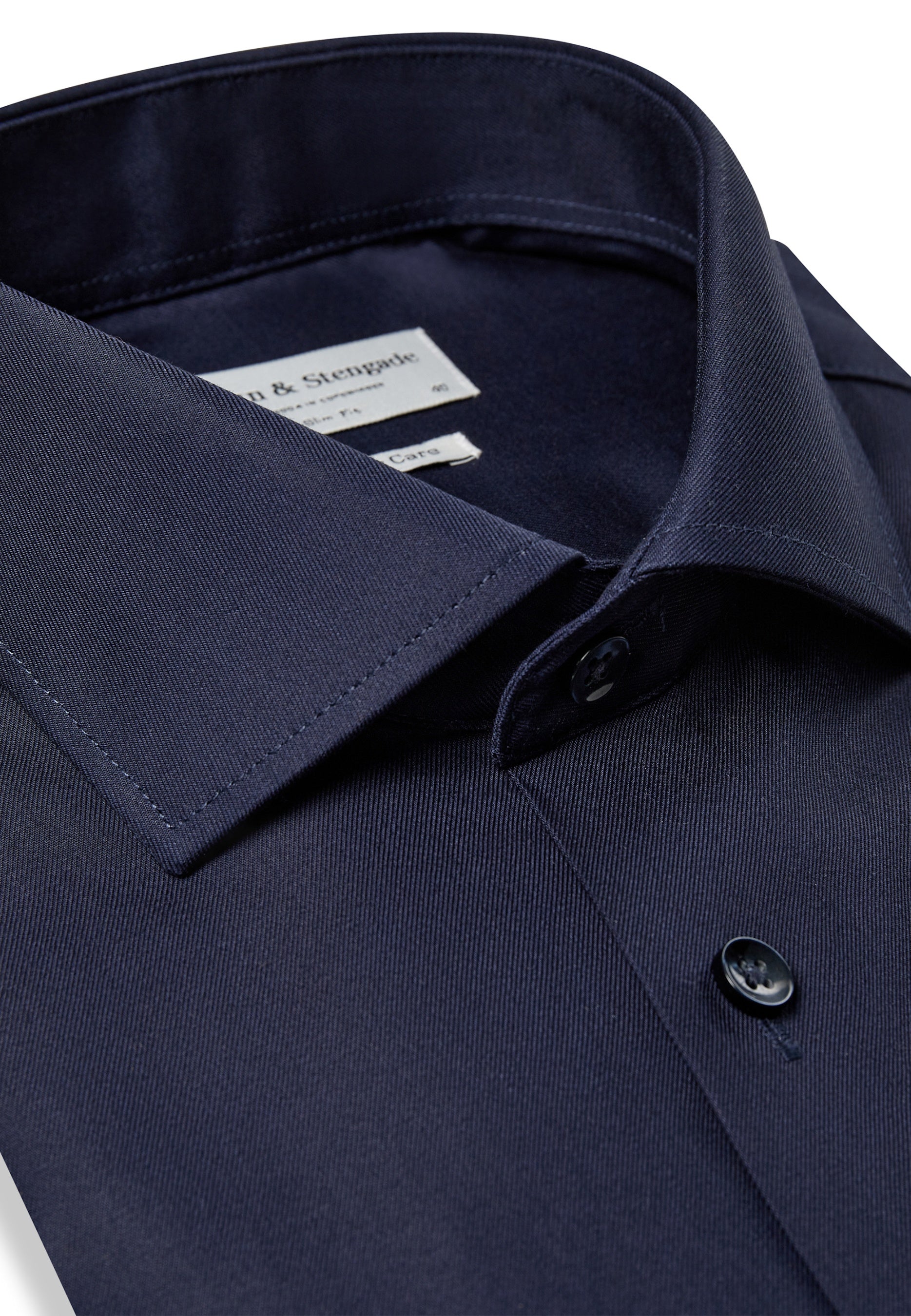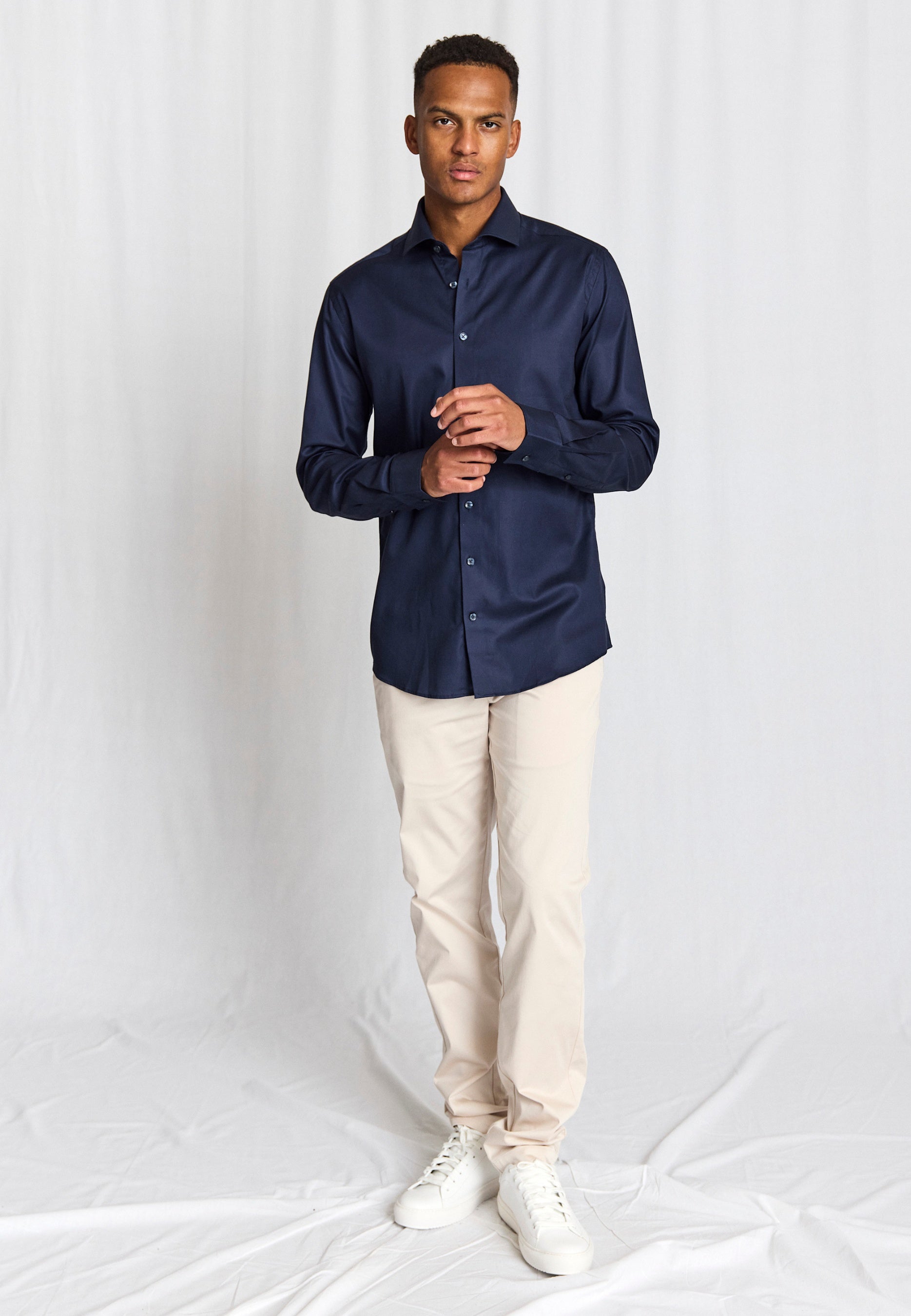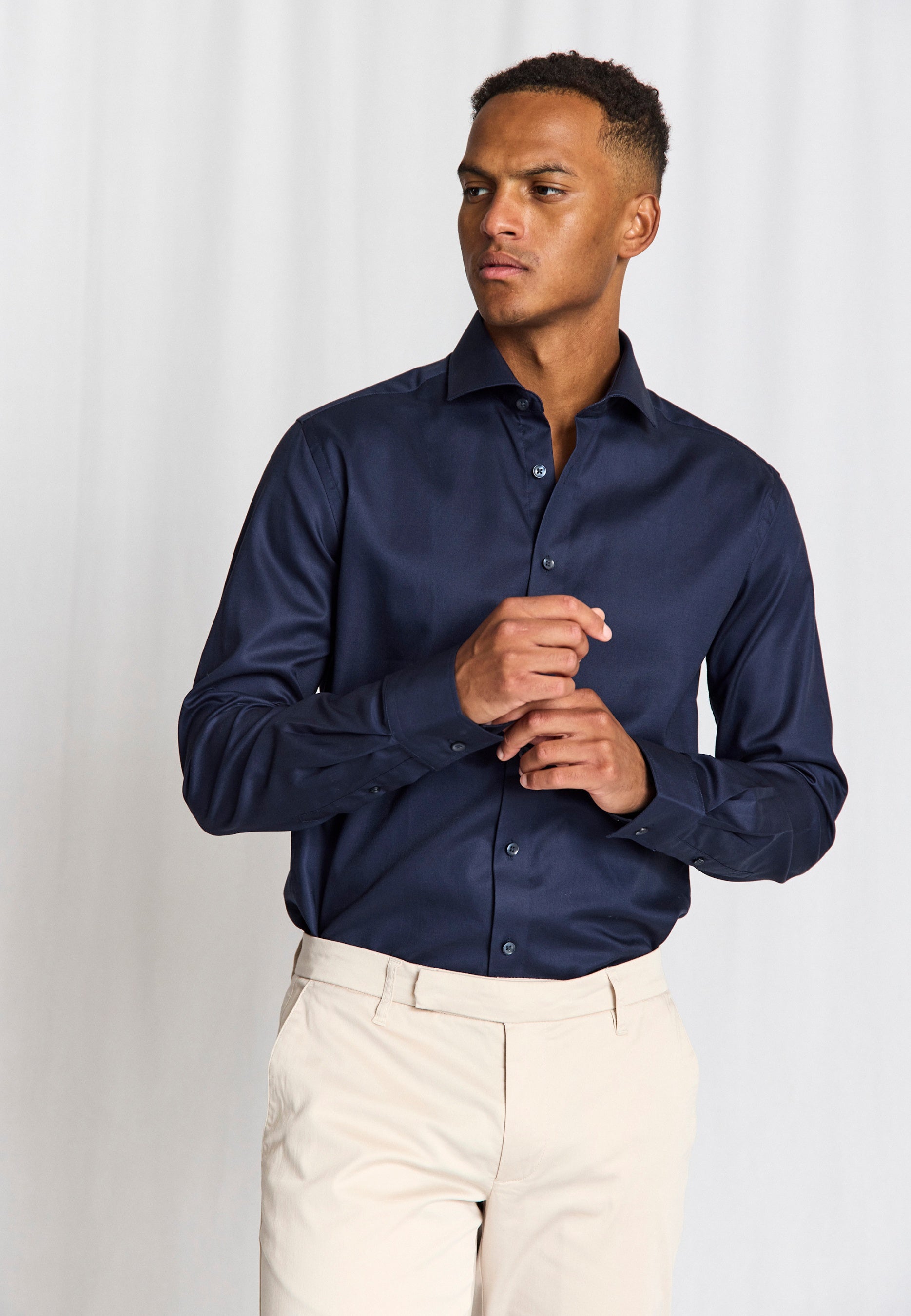 Our slim fit formal shirt is the ideal choice for those who prefer a close-fitting style. The shirt is made from 100% cotton in an elegant dobby weave that adds texture. The classic design features a cutaway collar, French placket with pearl buttons, and adjustable cuffs, making it suitable for both business wear and formal occasions.