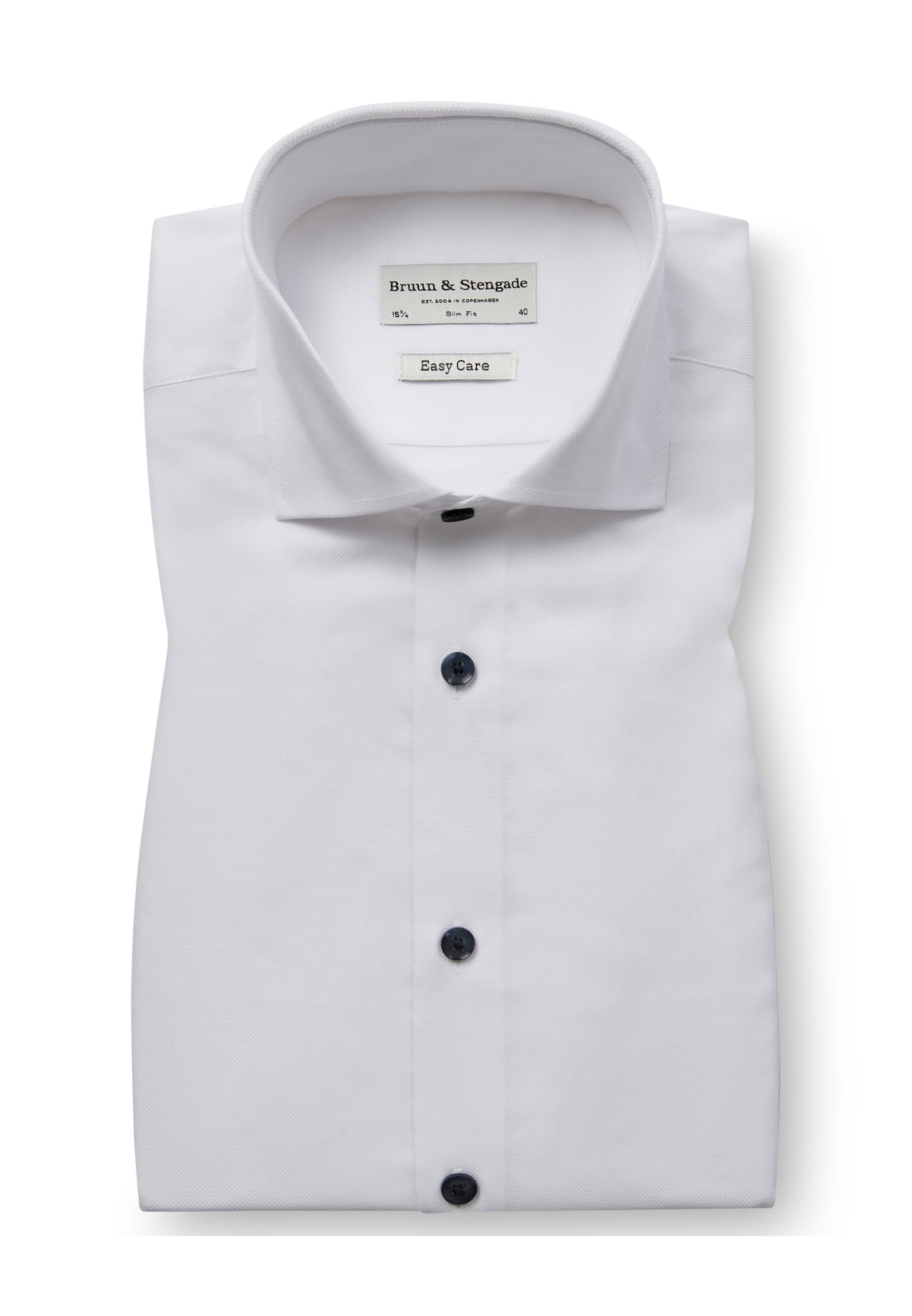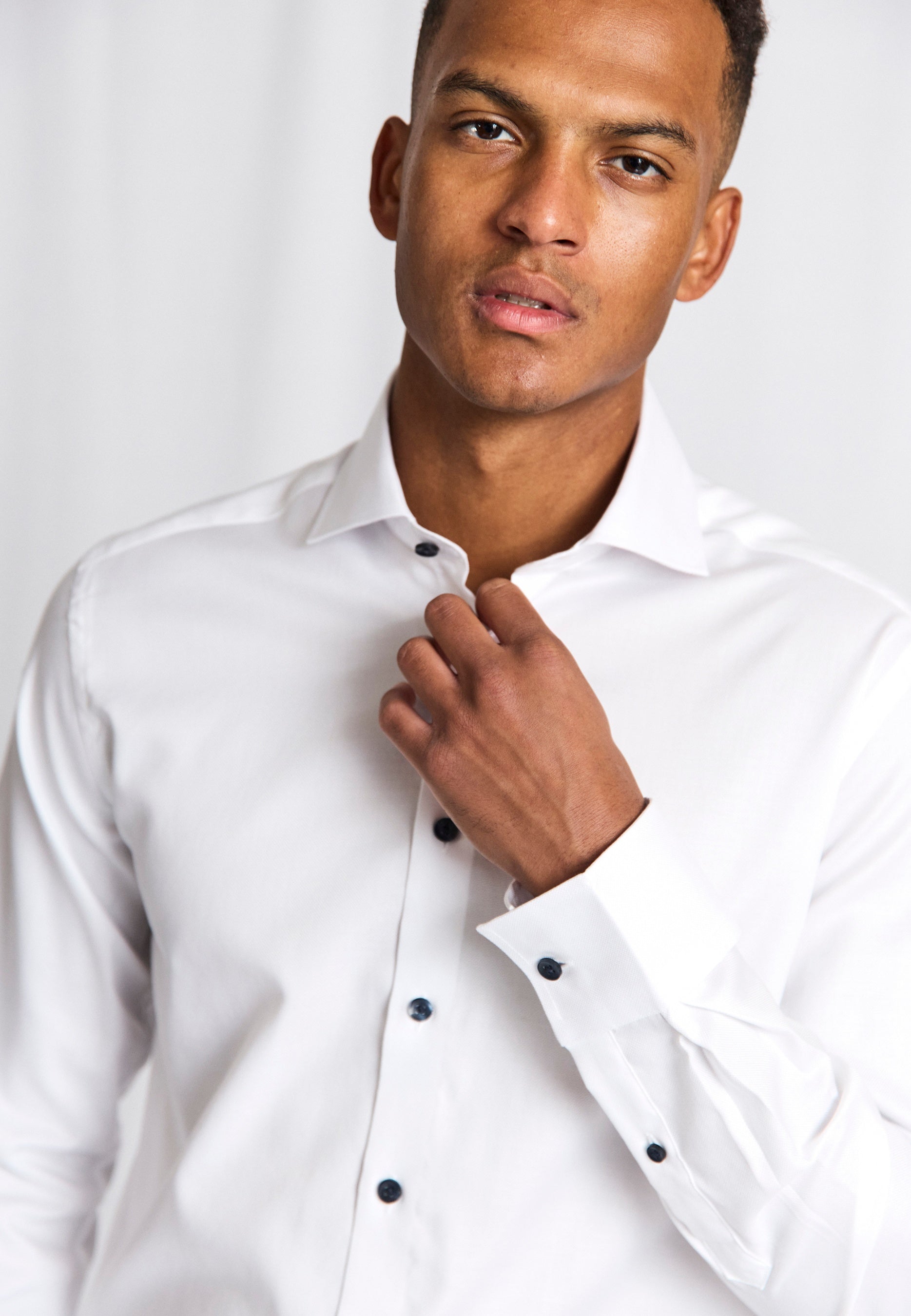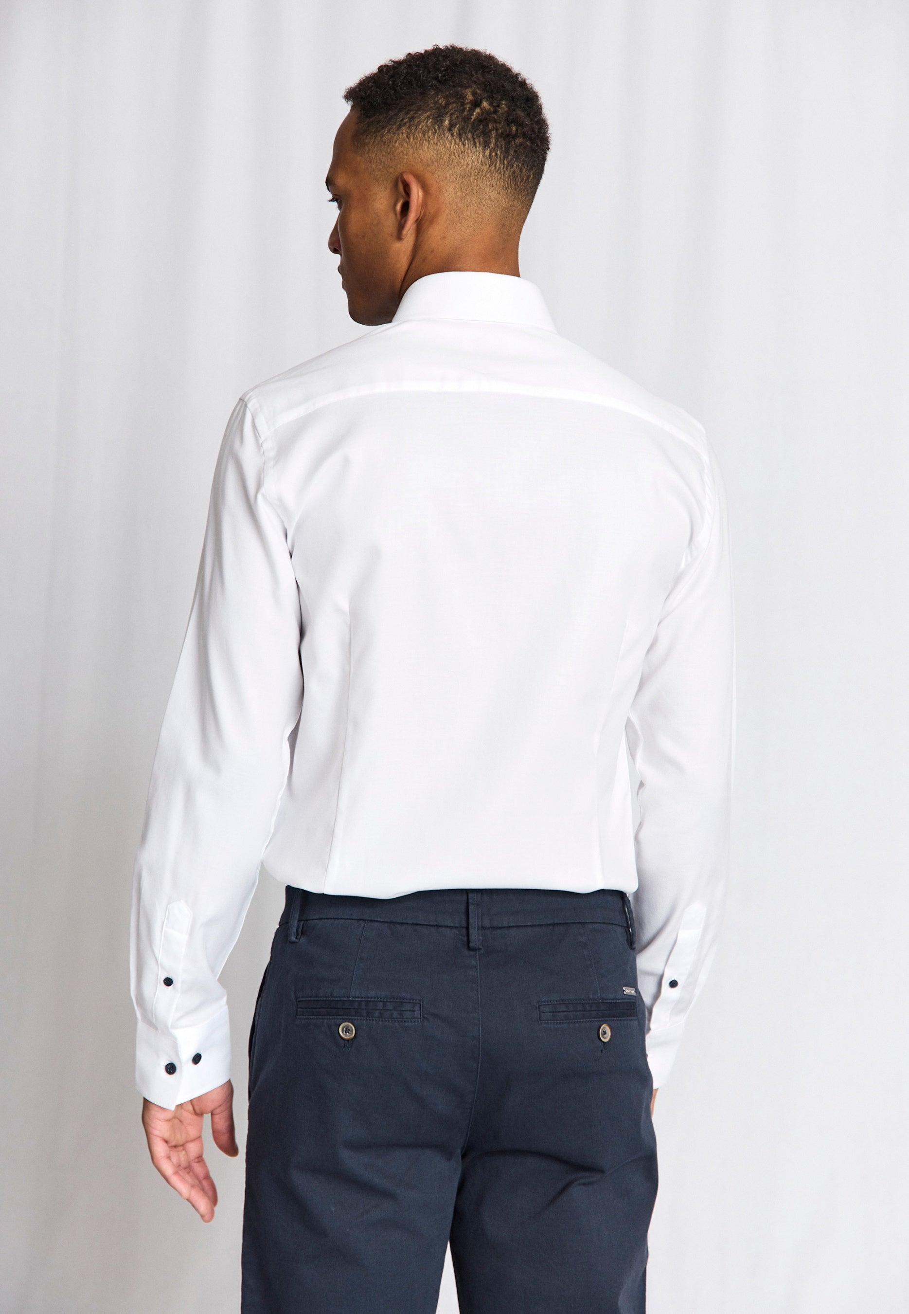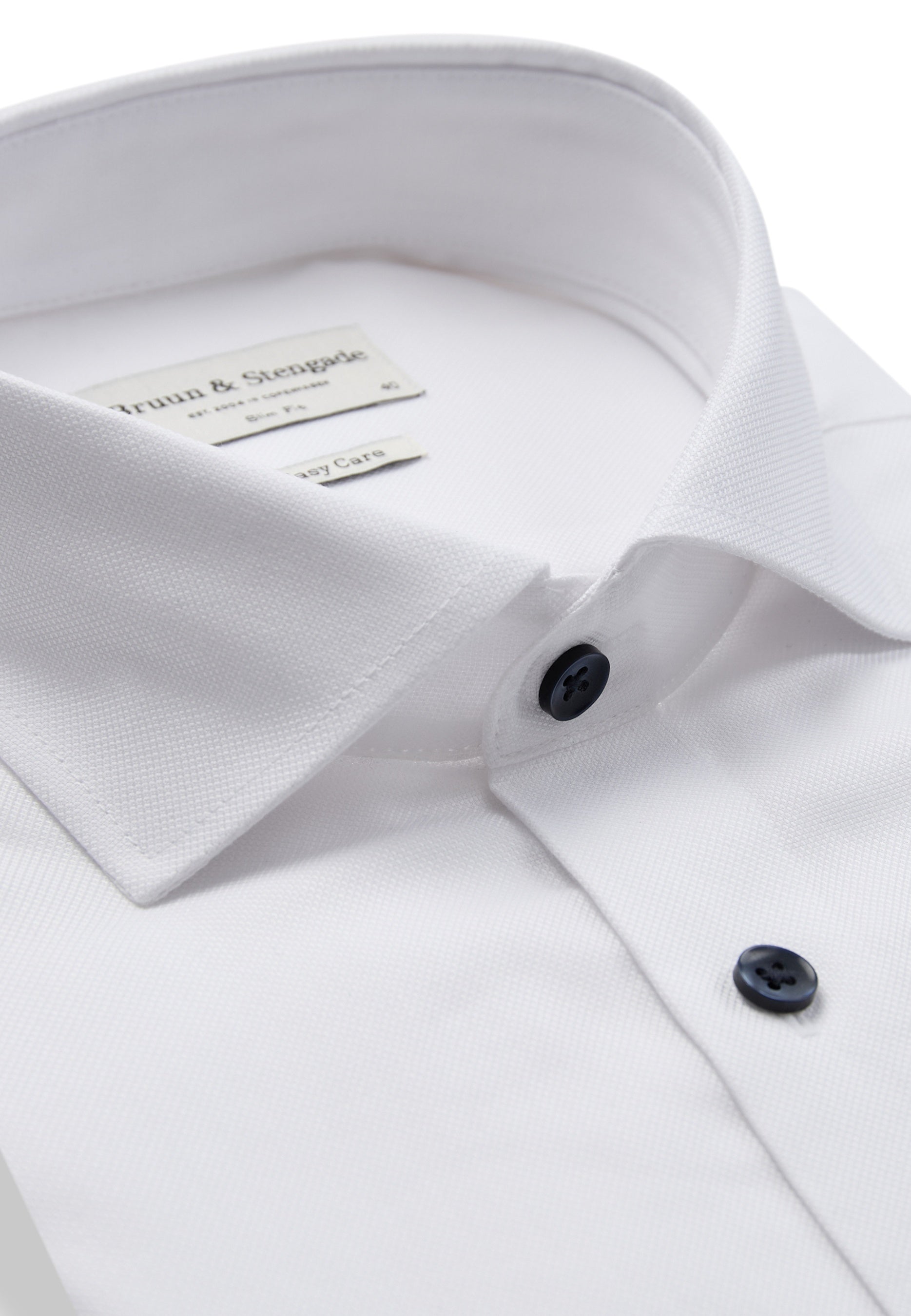Our slim fit formal shirt is the ideal choice for those who prefer a close-fitting style. The shirt is made from 100% cotton in an elegant dobby weave that adds texture. The classic design features a cutaway collar, French placket with pearl buttons, and adjustable cuffs, making it suitable for both business wear and formal occasions.