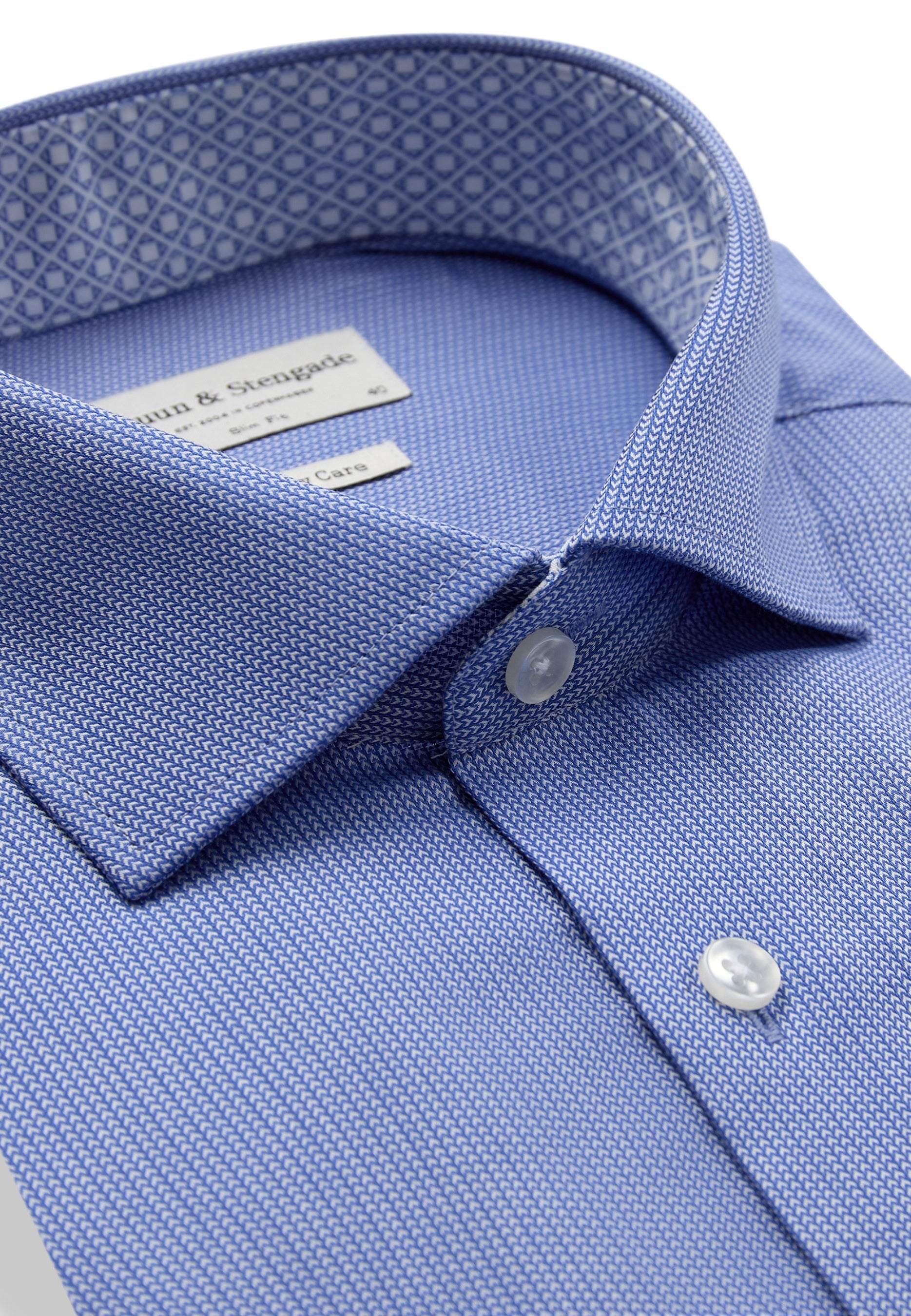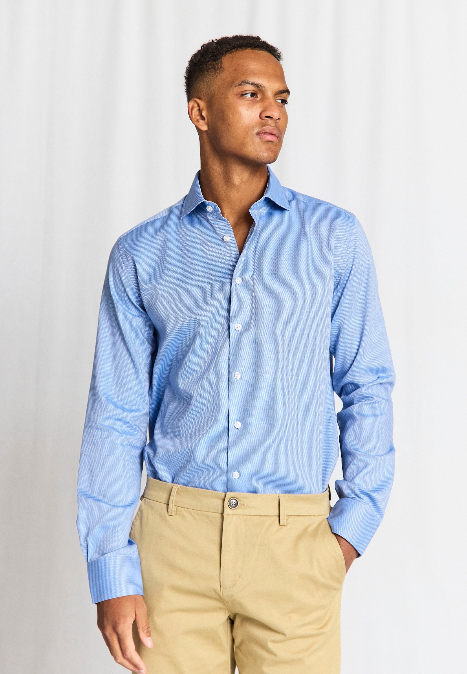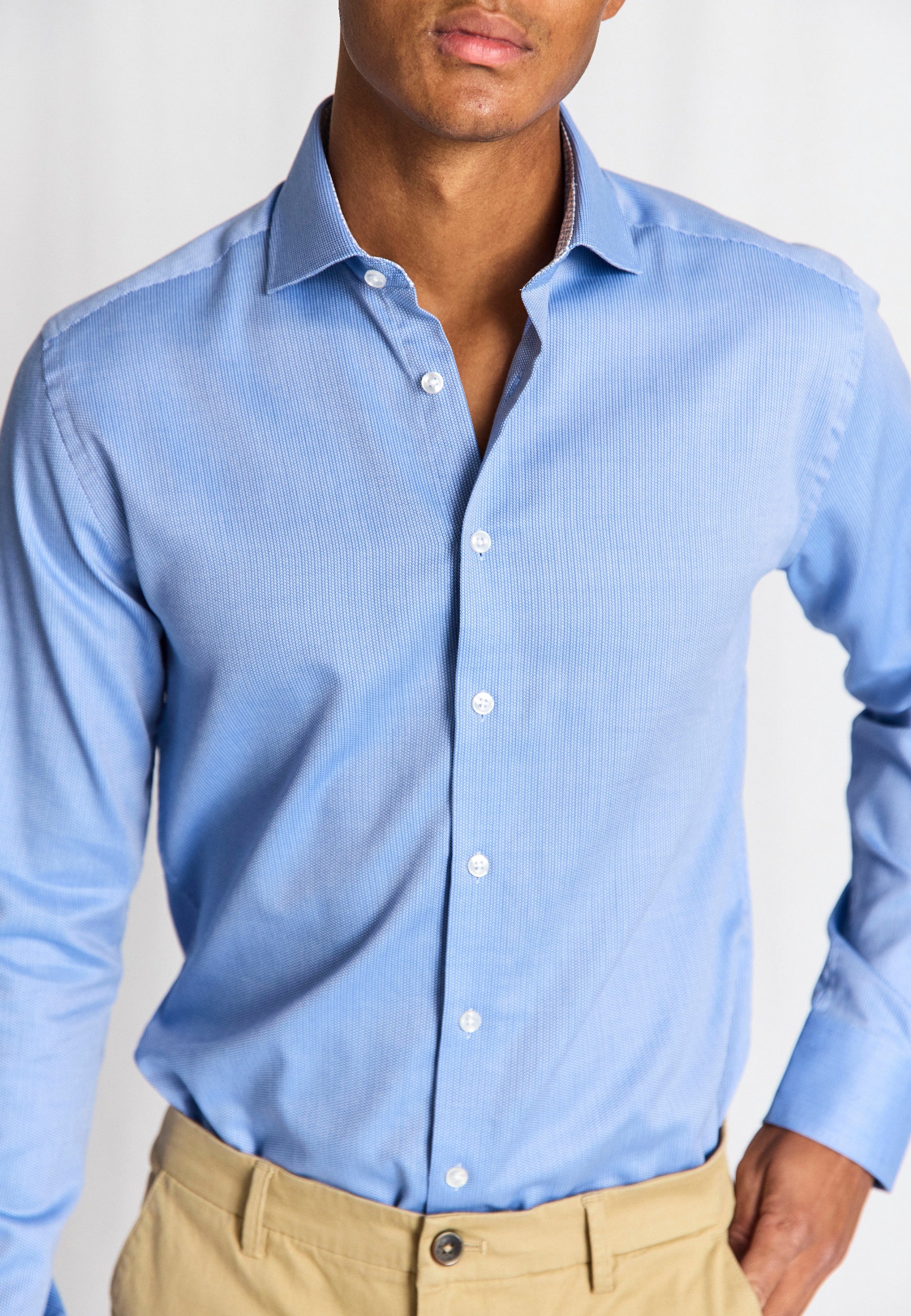 Our slim fit formal shirt is the ideal choice for those who prefer a close-fitting style. The shirt is made from 100% cotton in an elegant dobby weave that adds texture. The classic design features a cutaway collar, French placket with pearl buttons, and adjustable cuffs, making it suitable for both business wear and formal occasions.