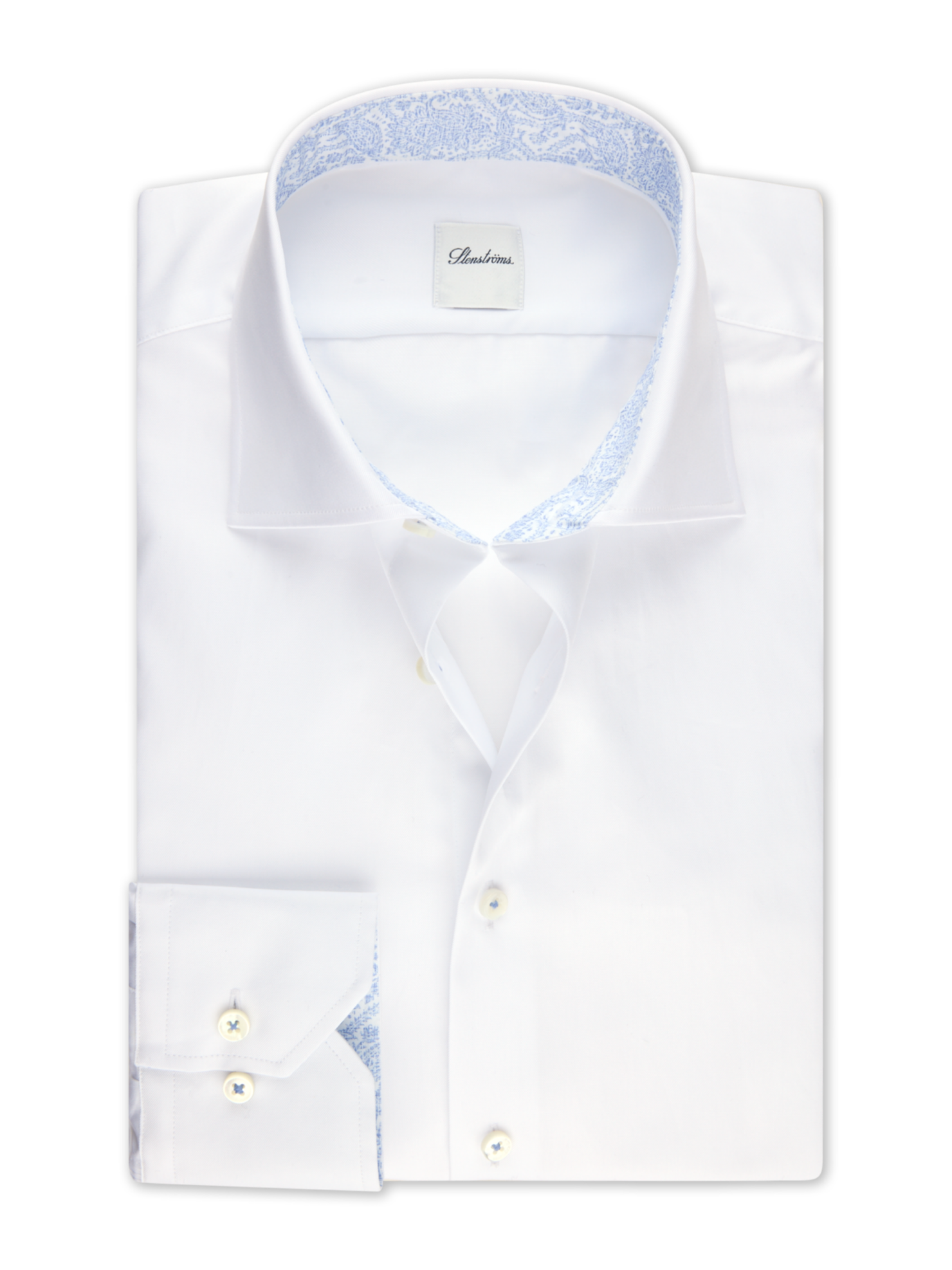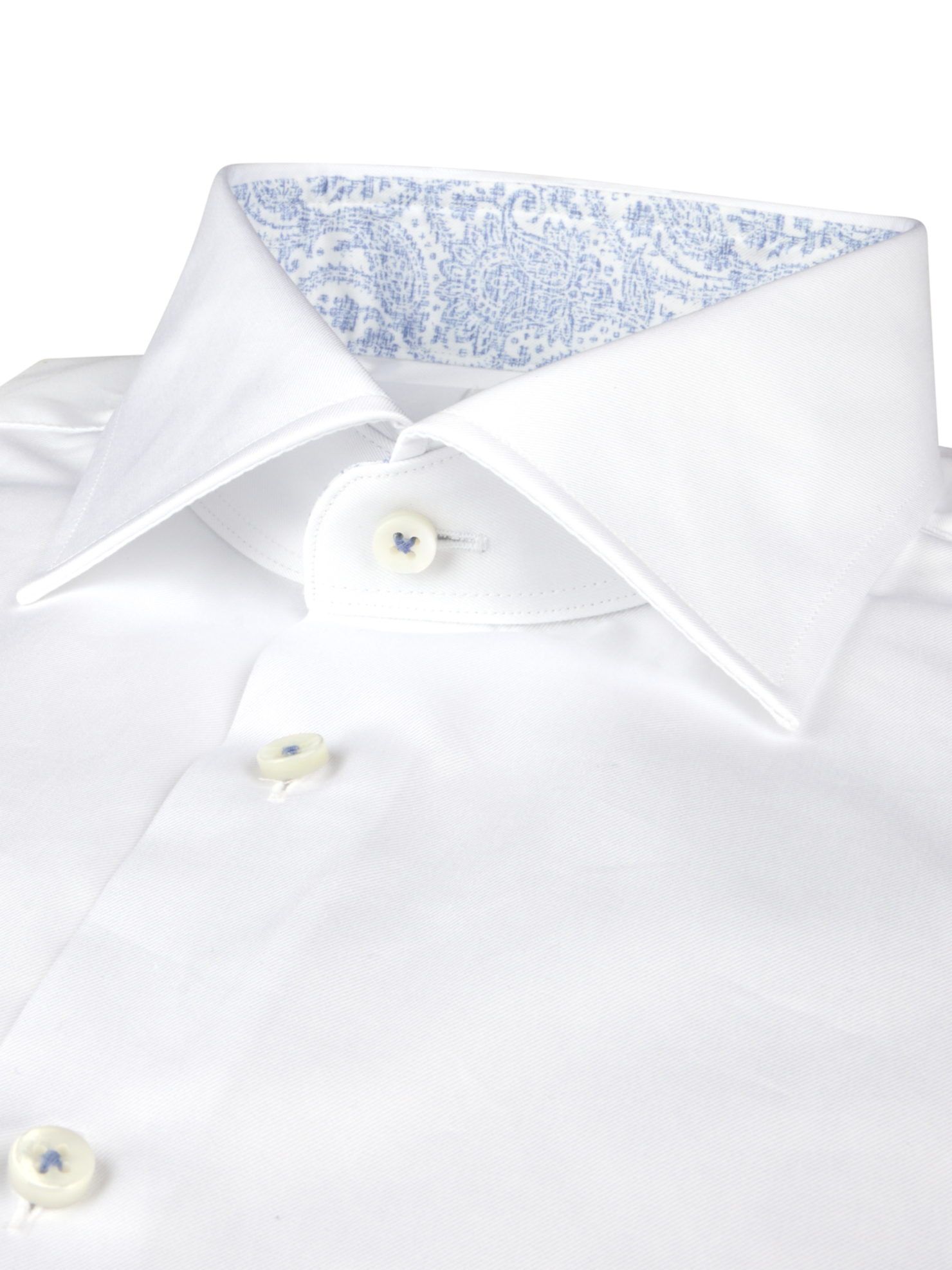 This twill shirt is made of twofold cotton. The shirt is designed with contrast inside collar and cuffs and is detailed with mother of pearl buttons, single cuffs and a cut away collar.