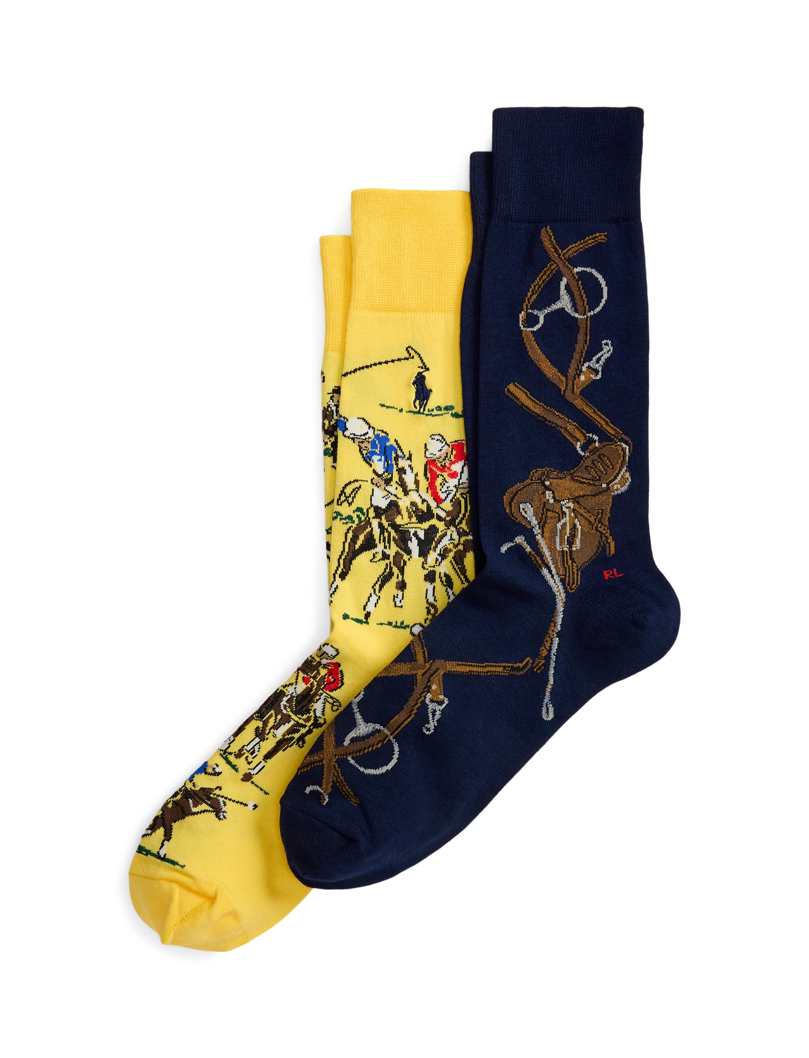 Signature graphics lend a heritage-inspired equestrian look to this trouser sock two-pack. One pair features scenes from a polo match, while a motif including a saddle, bridle, and stirrups accents the other pair.