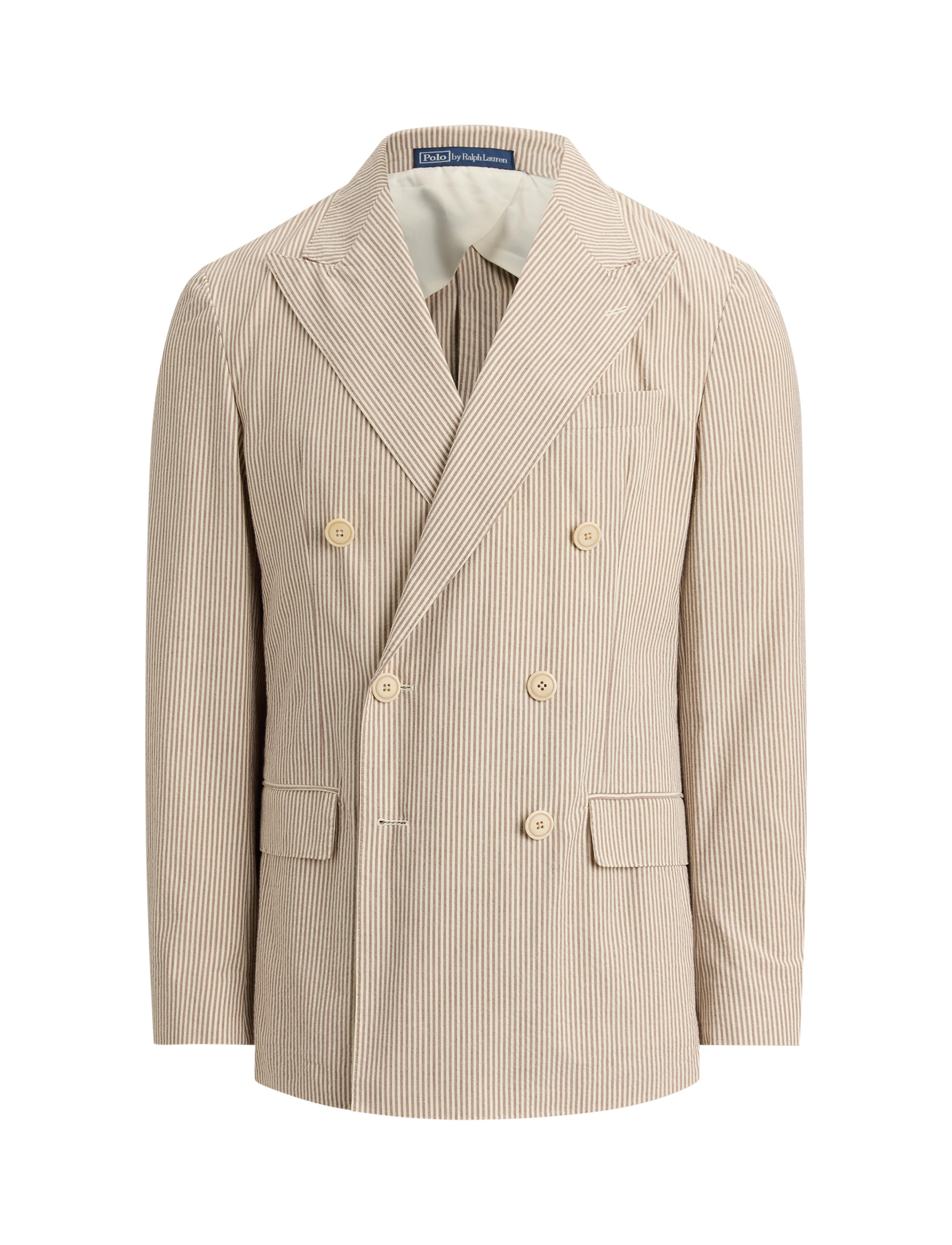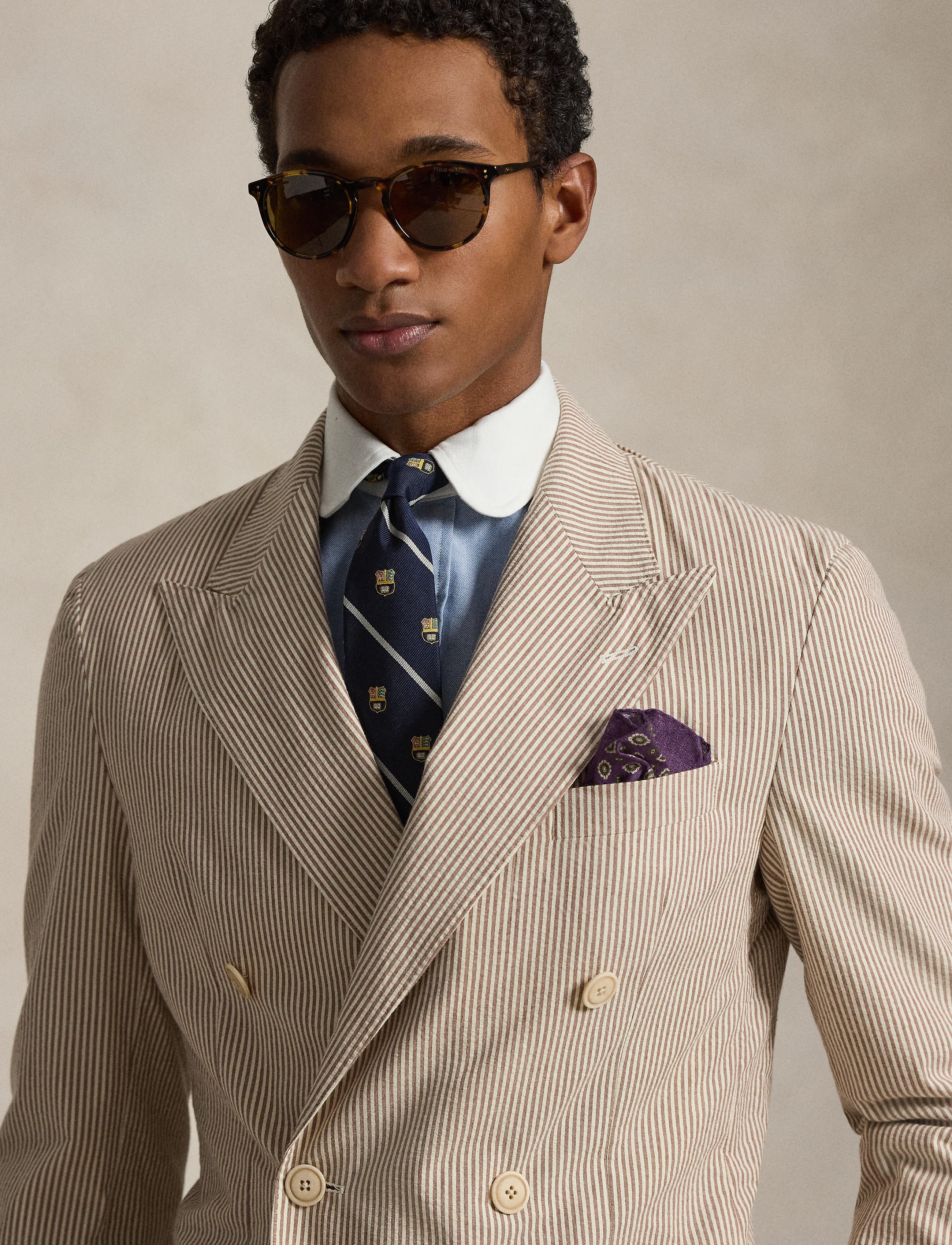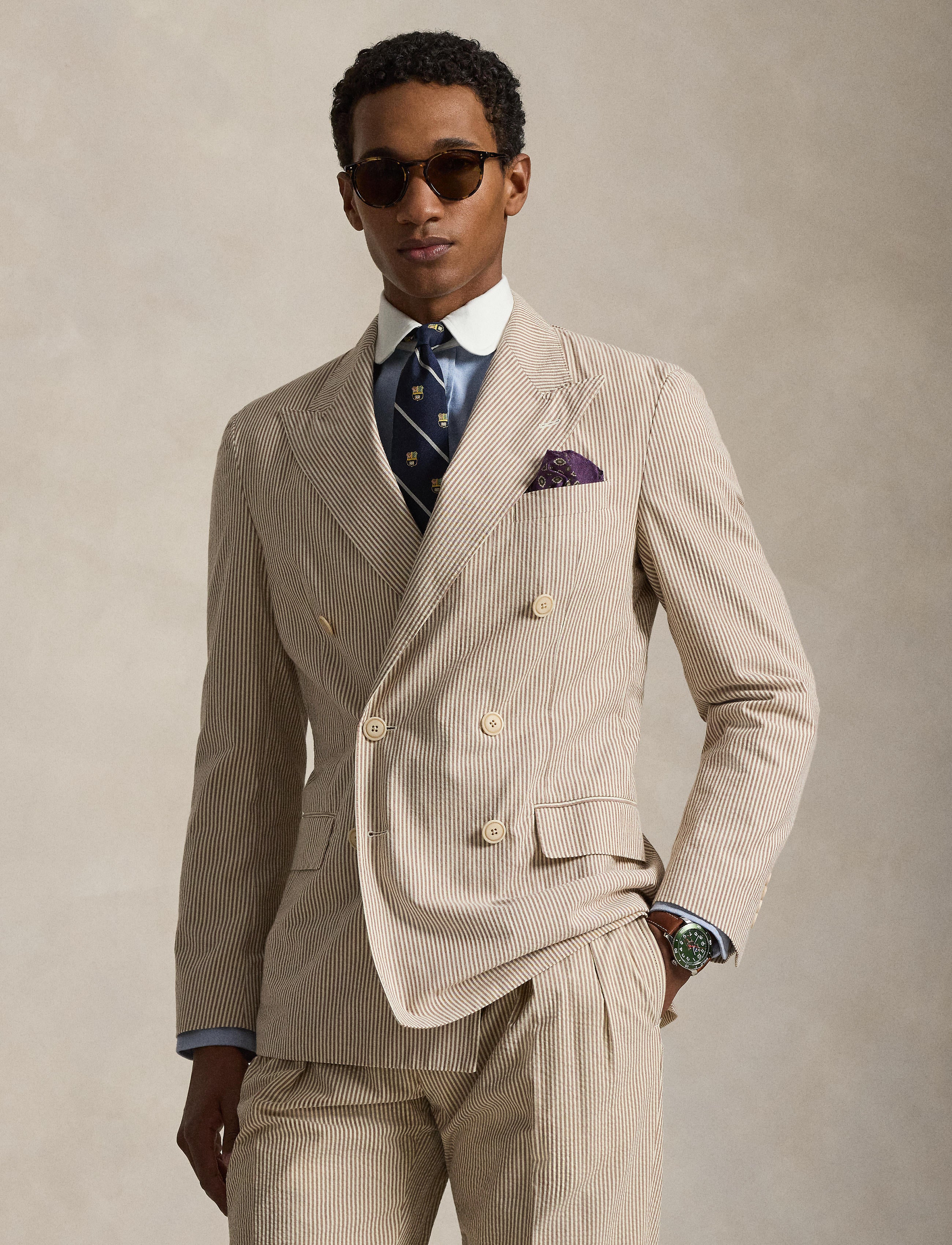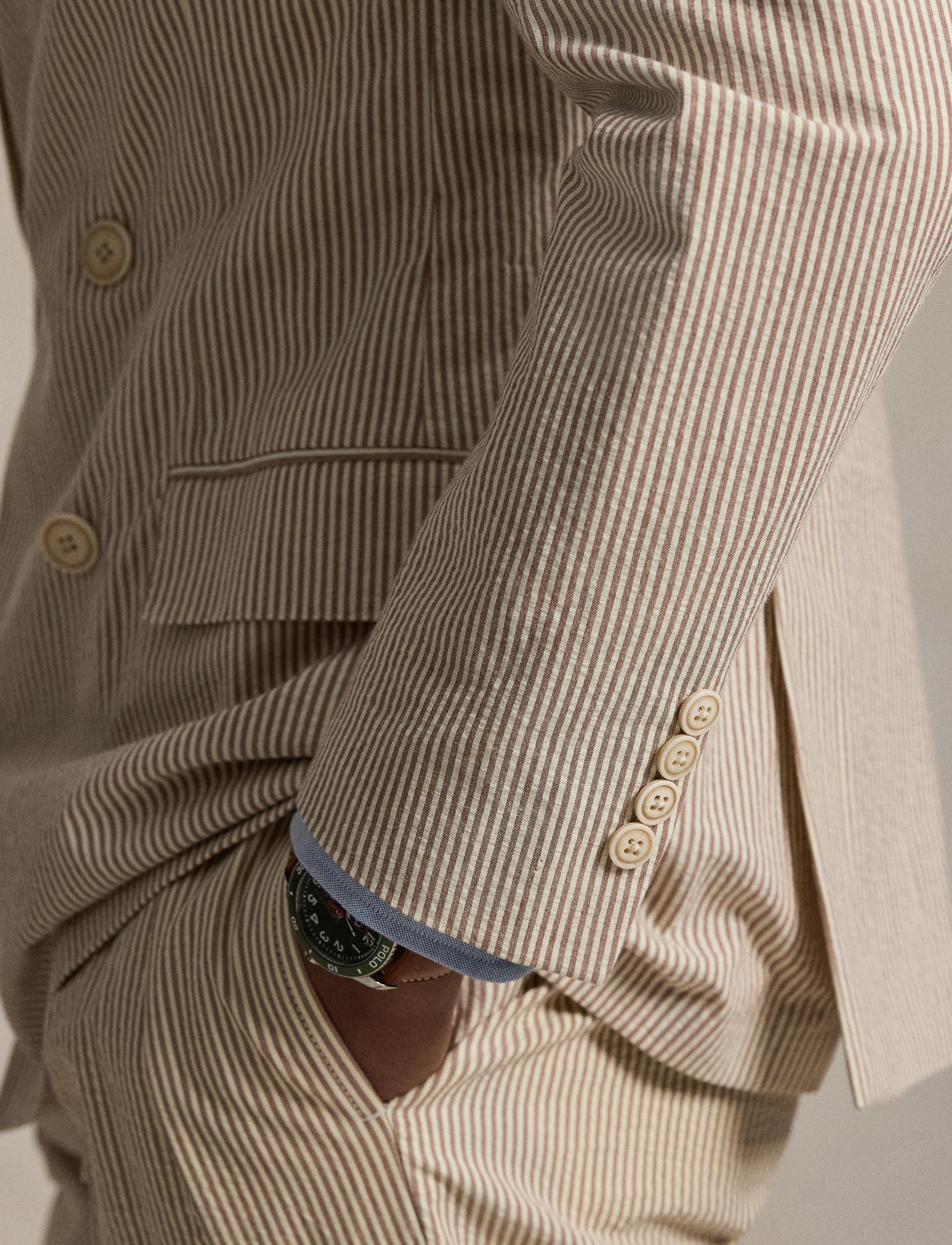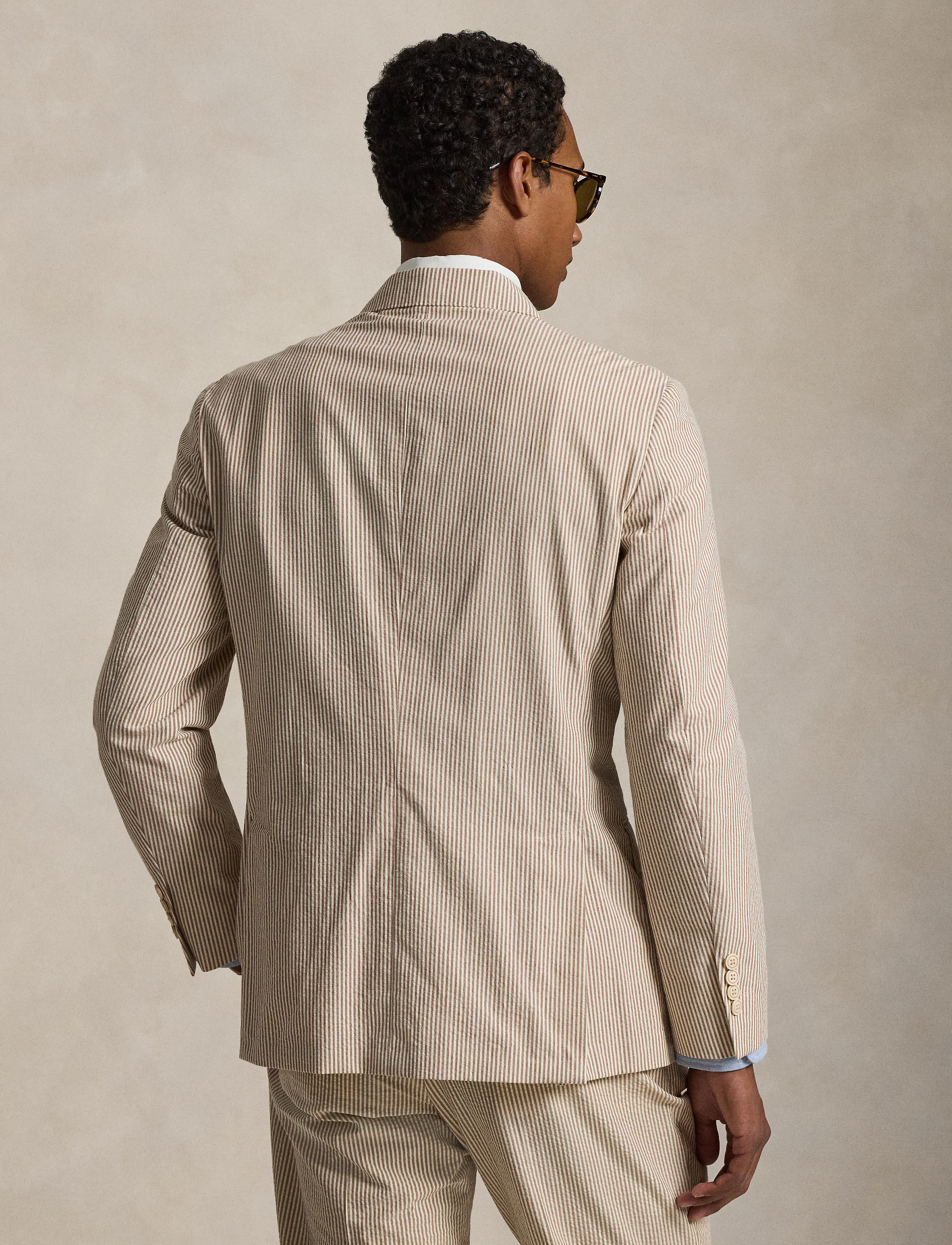 Our Polo Soft suit jacket puts a modern spin on classic preppy style with a natural shoulder, slightly structured chest, and partial lining. This version is expertly tailored in Portugal with a custom-developed striped cotton seersucker.