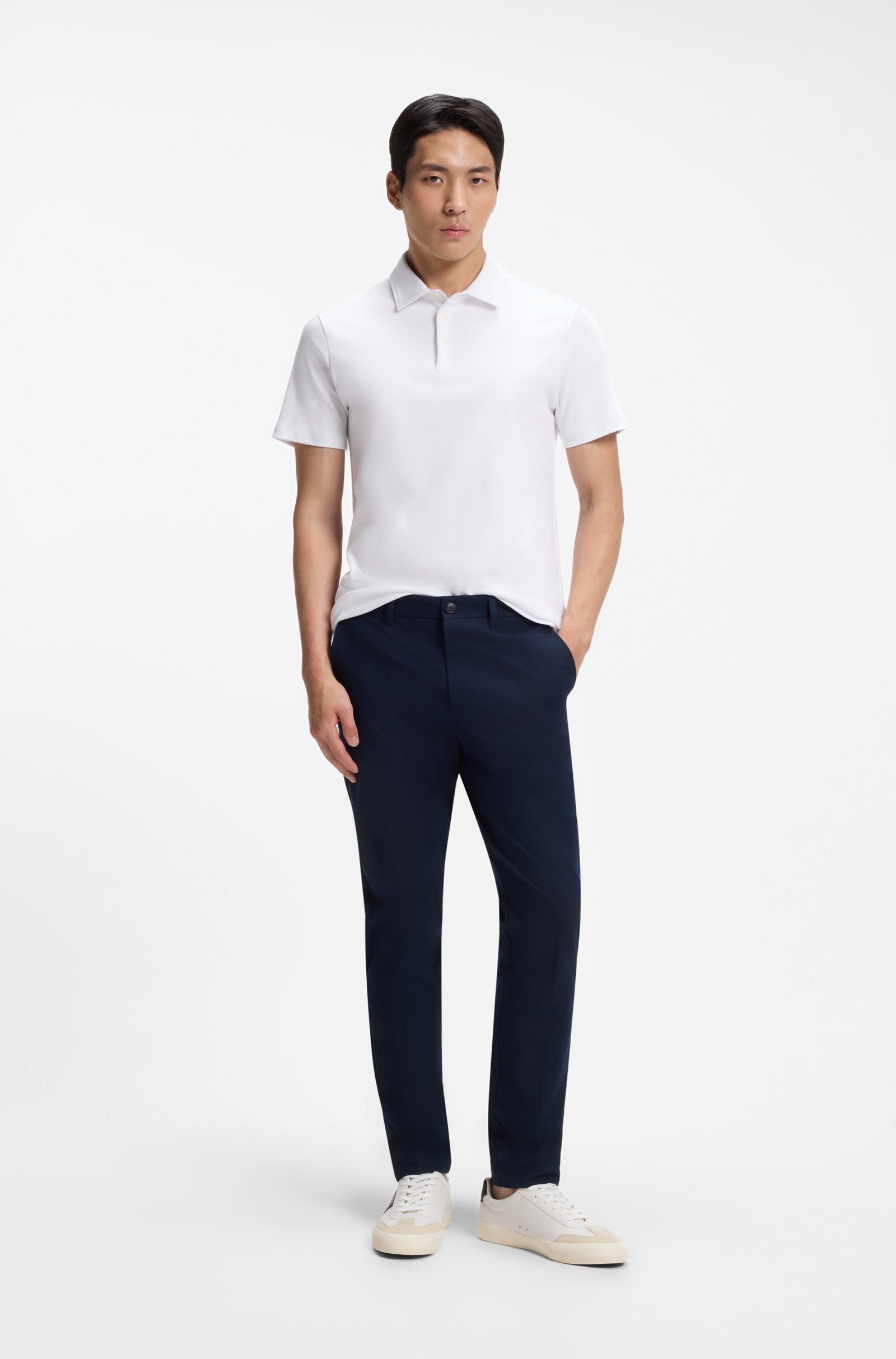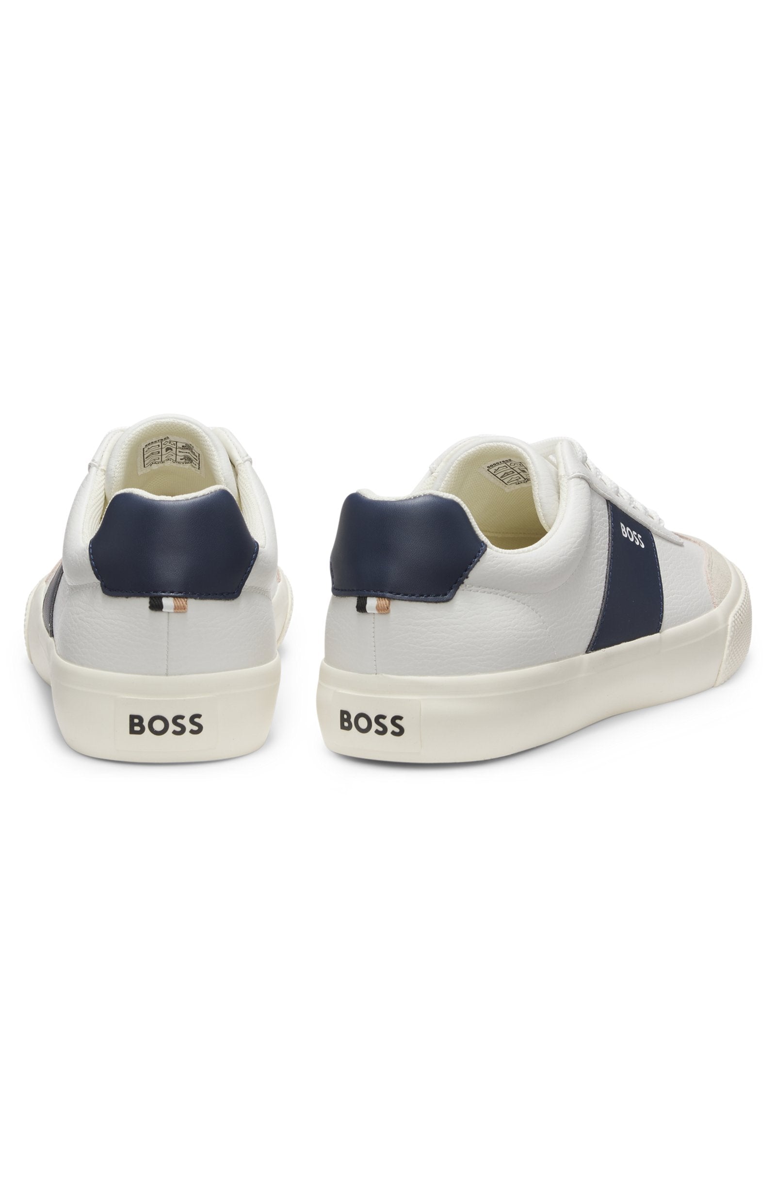 Round off everyday looks with the cleanly styled uppers of these BOSS Menswear trainers. Real contrast leather trims with grained synthetic coated fabric.