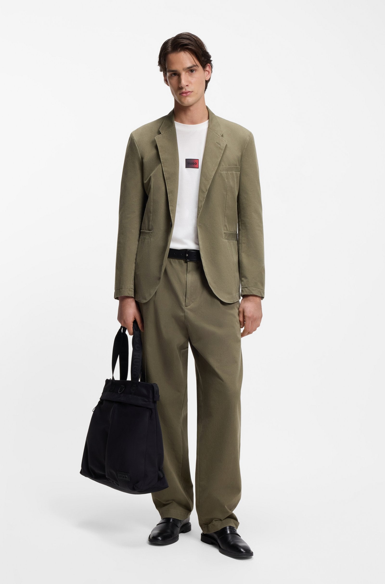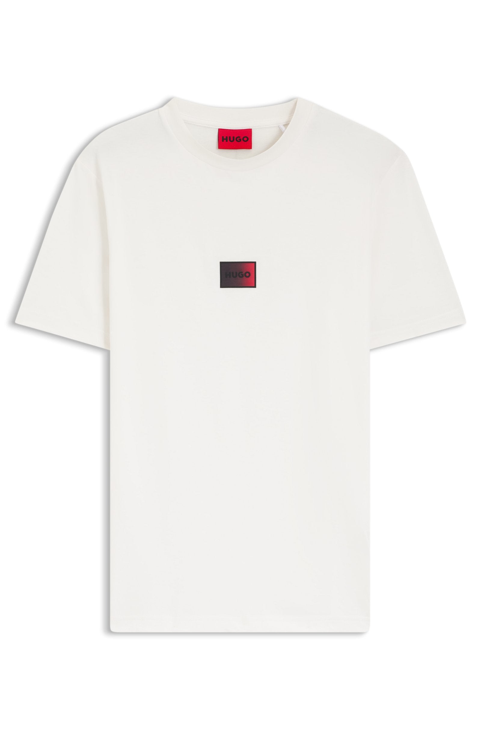 Add impact to casual looks with the centered, gradient-effect logo patch of this HUGO Menswear T-shirt. Straight fit. Breathable cotton jersey.
