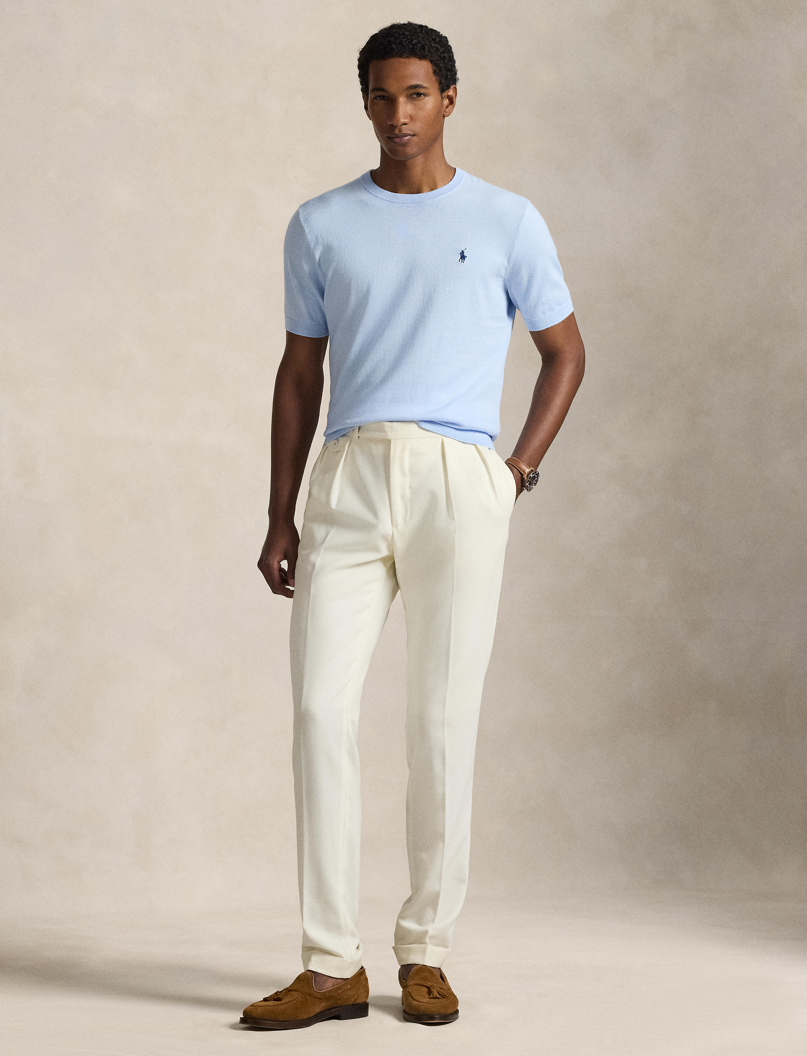 To create this layer, we reinterpreted the clean-lined silhouette of a T-shirt with combed cotton yarn and a sophisticated fine-knit construction. Our signature embroidered Pony at the left chest adds a distinctive finish.