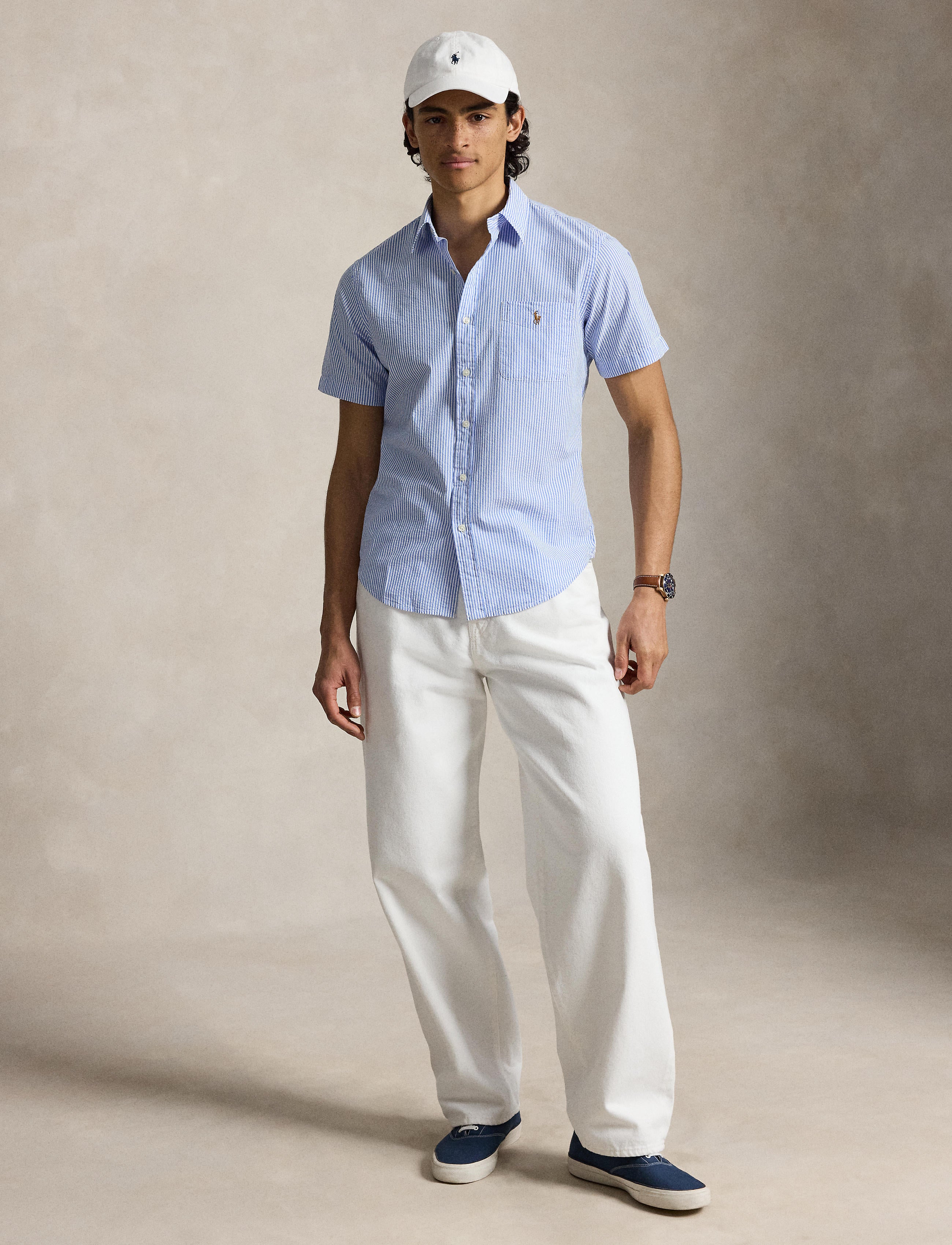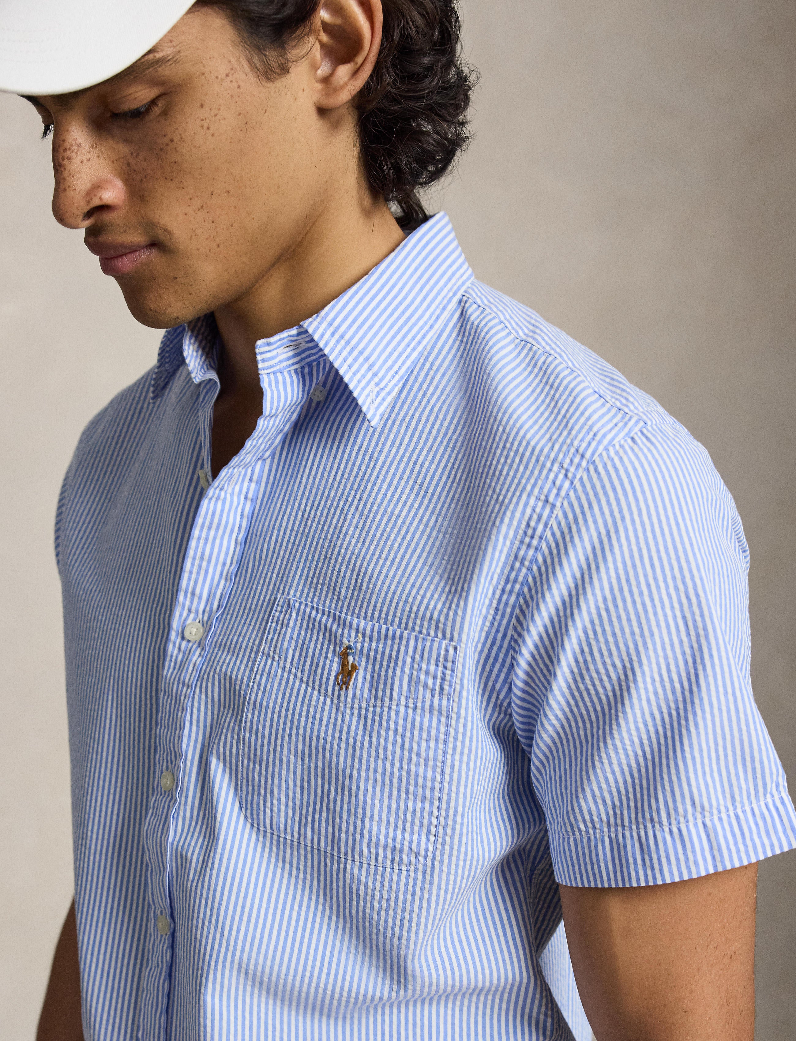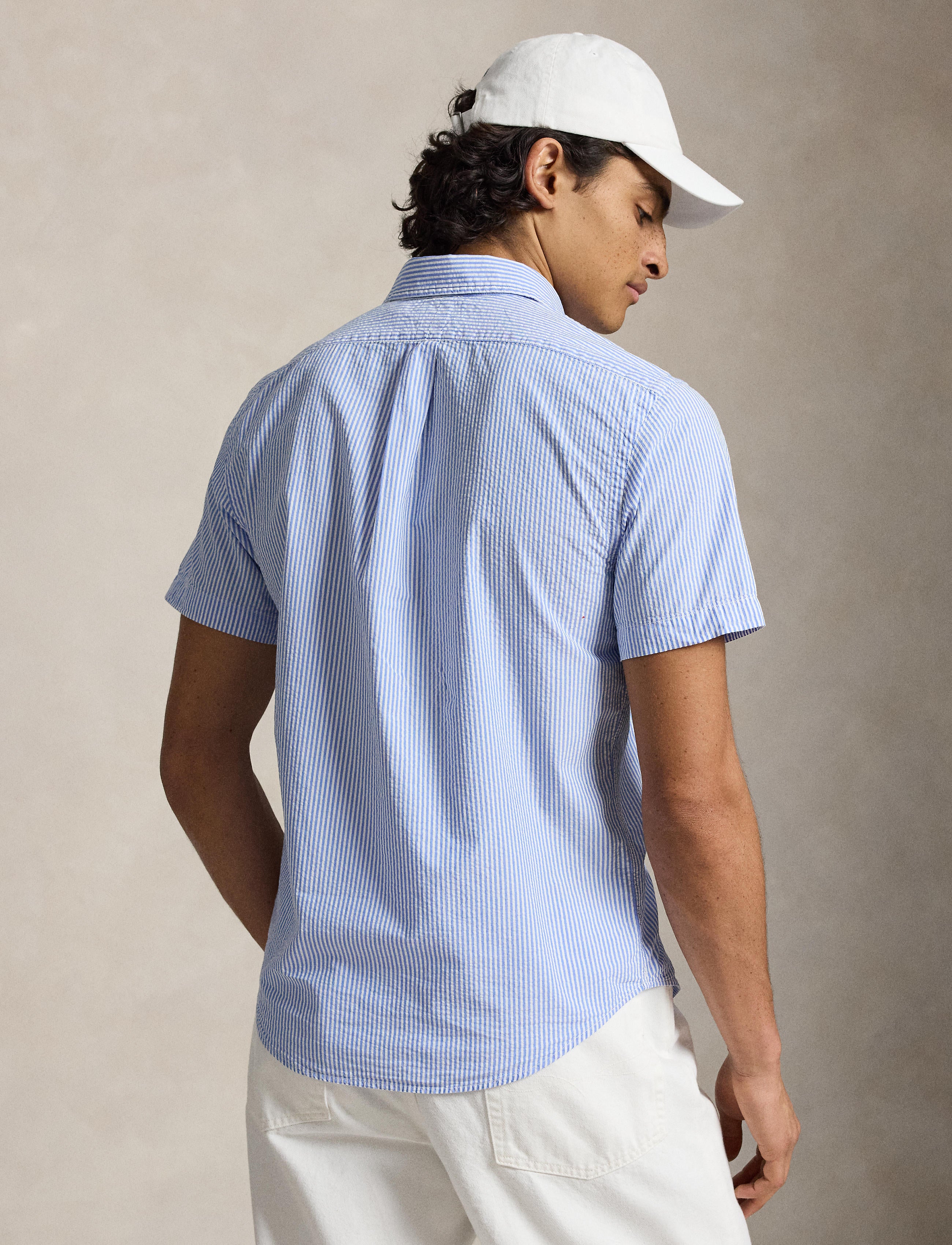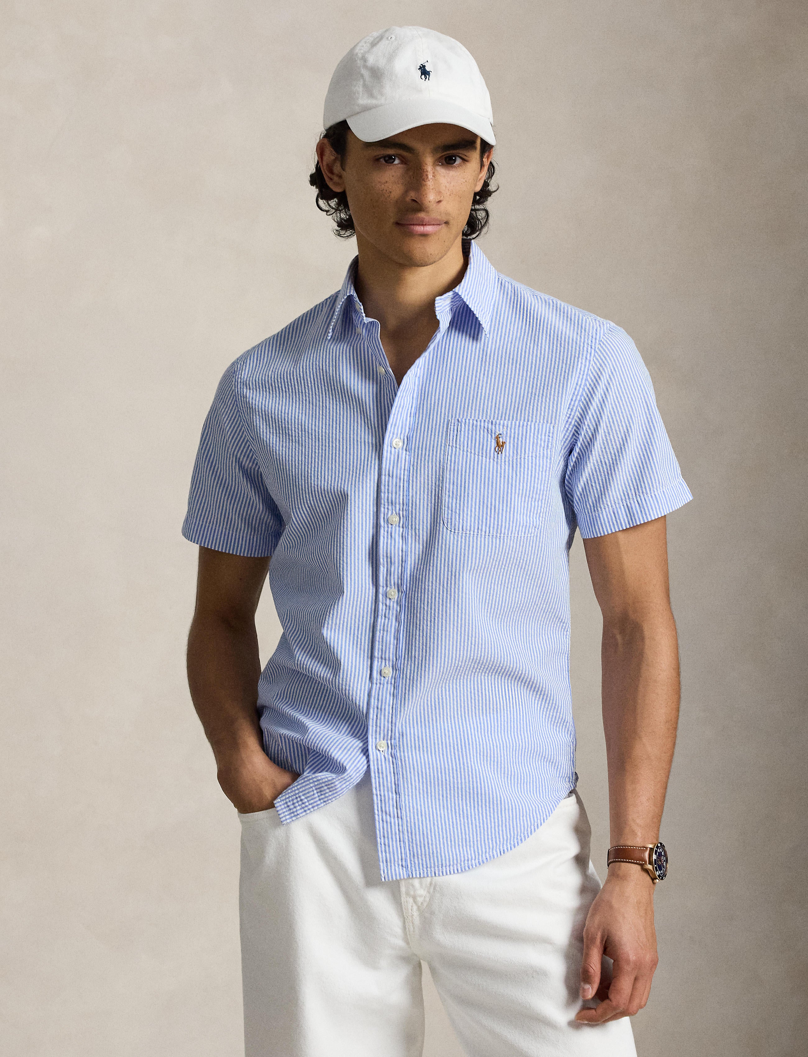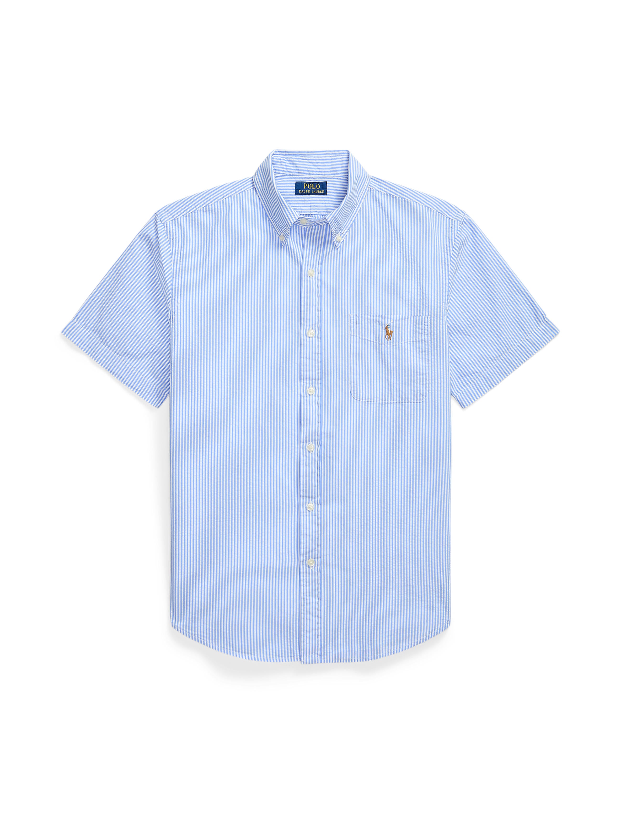 Designed with a shorter length, the RL Prepster is perfect for wearing untucked. This striped version is made with lightweight cotton seersucker and washed for extra softness.