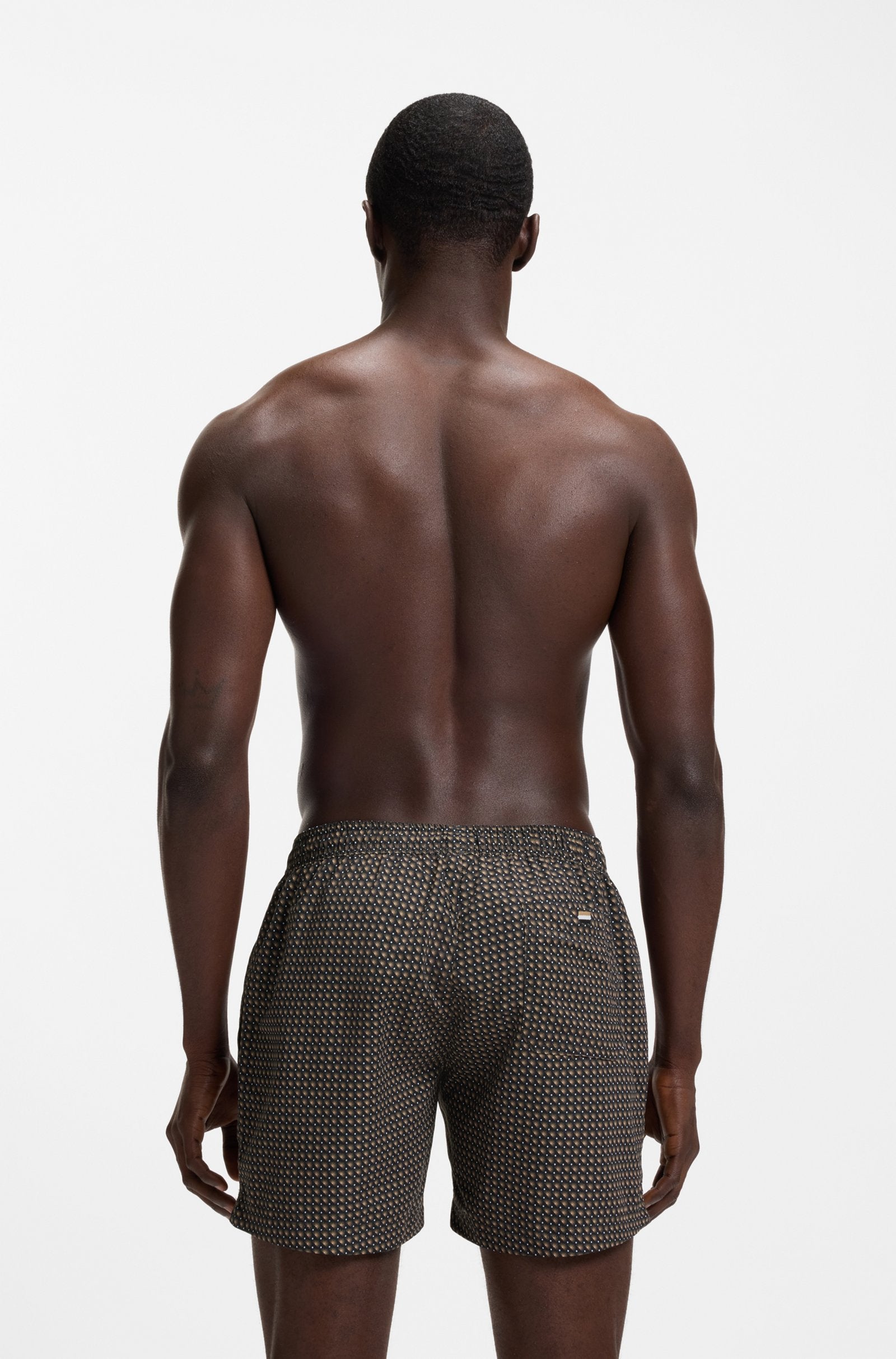 Featuring a modern micro print all over, these BOSS Menswear swim shorts offer natural quick-dry performance. Trimmed with a logo patch.