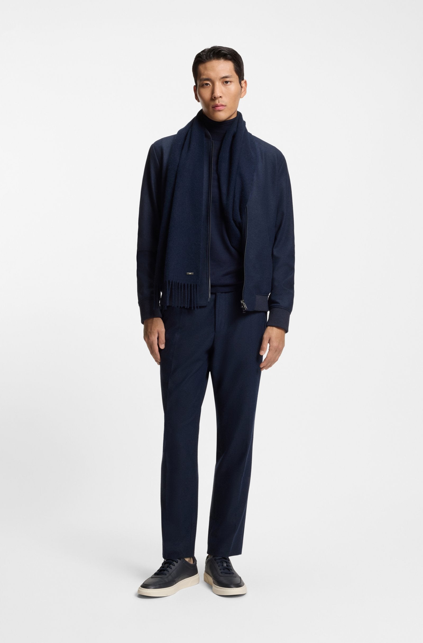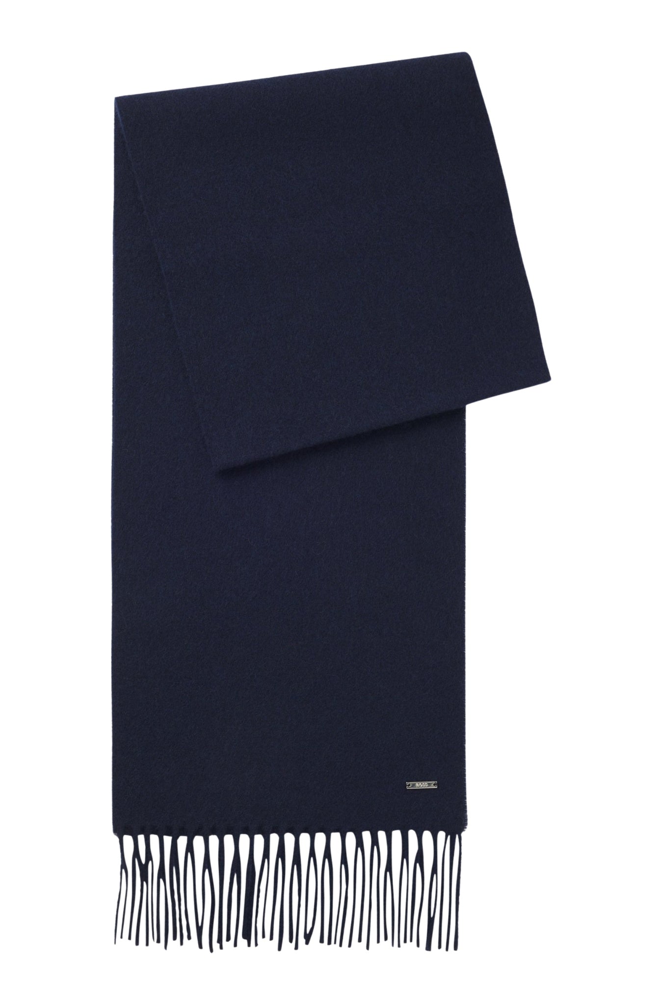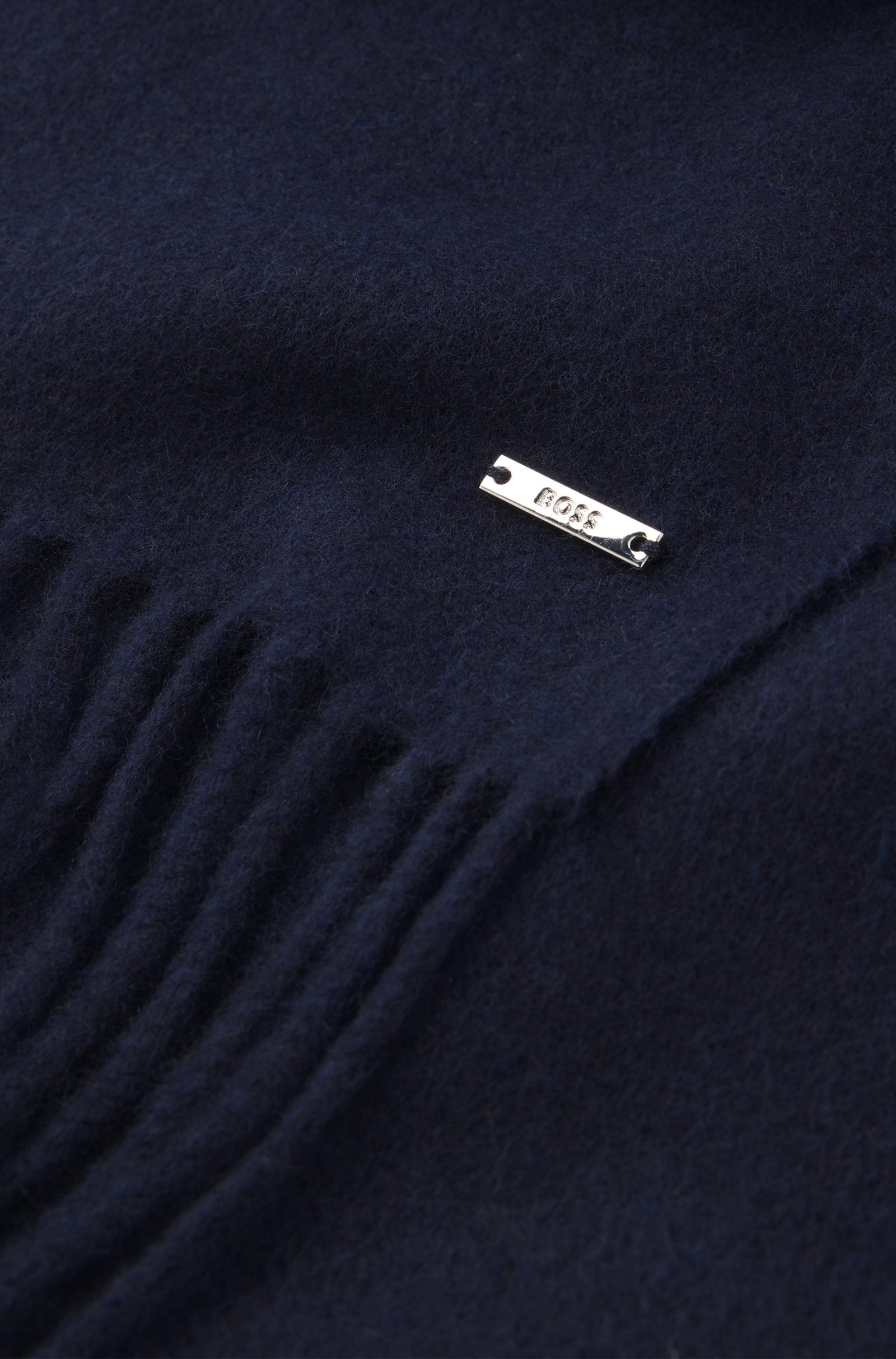 Add luxury to crisp mornings with this BOSS Menswear scarf, woven in 100% cashmere. Metal logo rivet. Long twisted fringes.