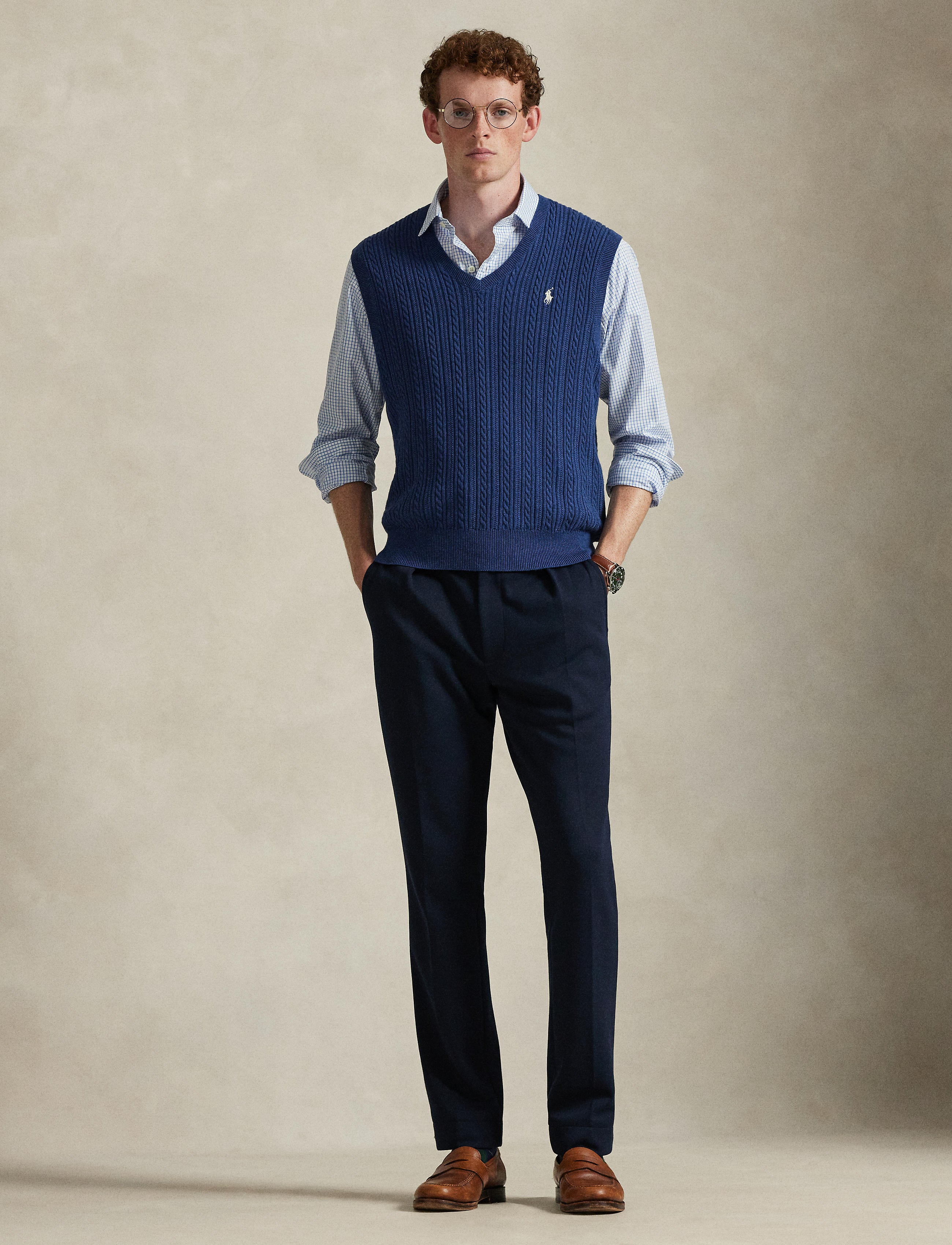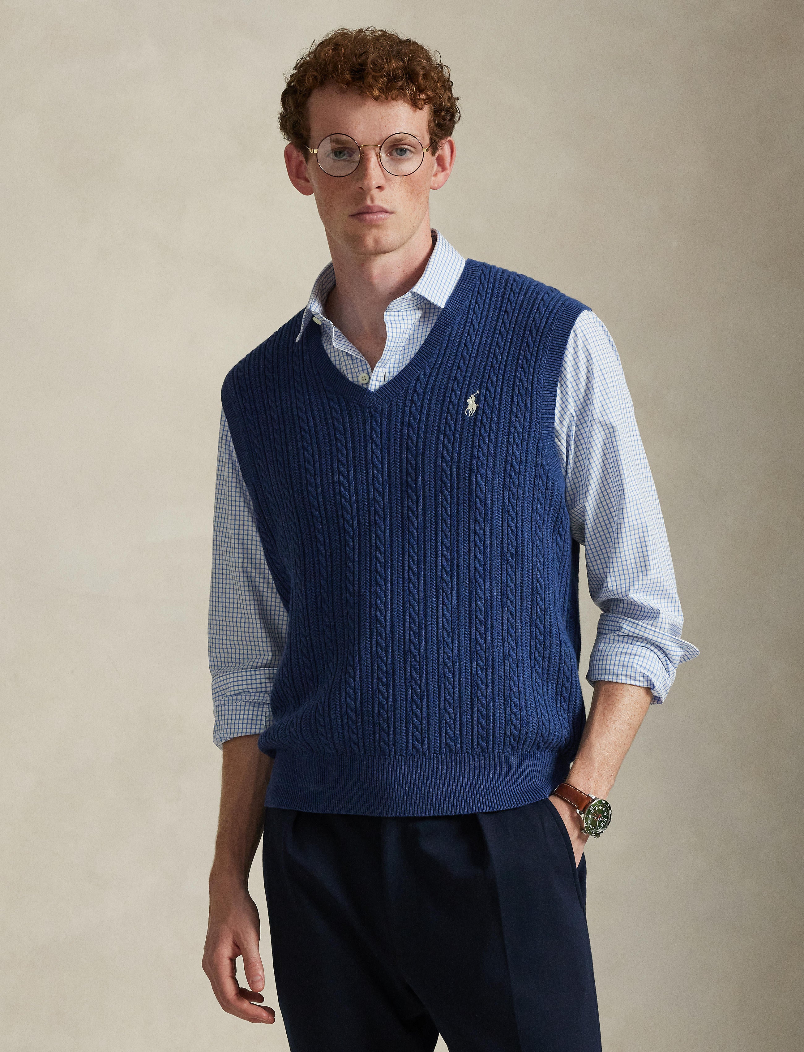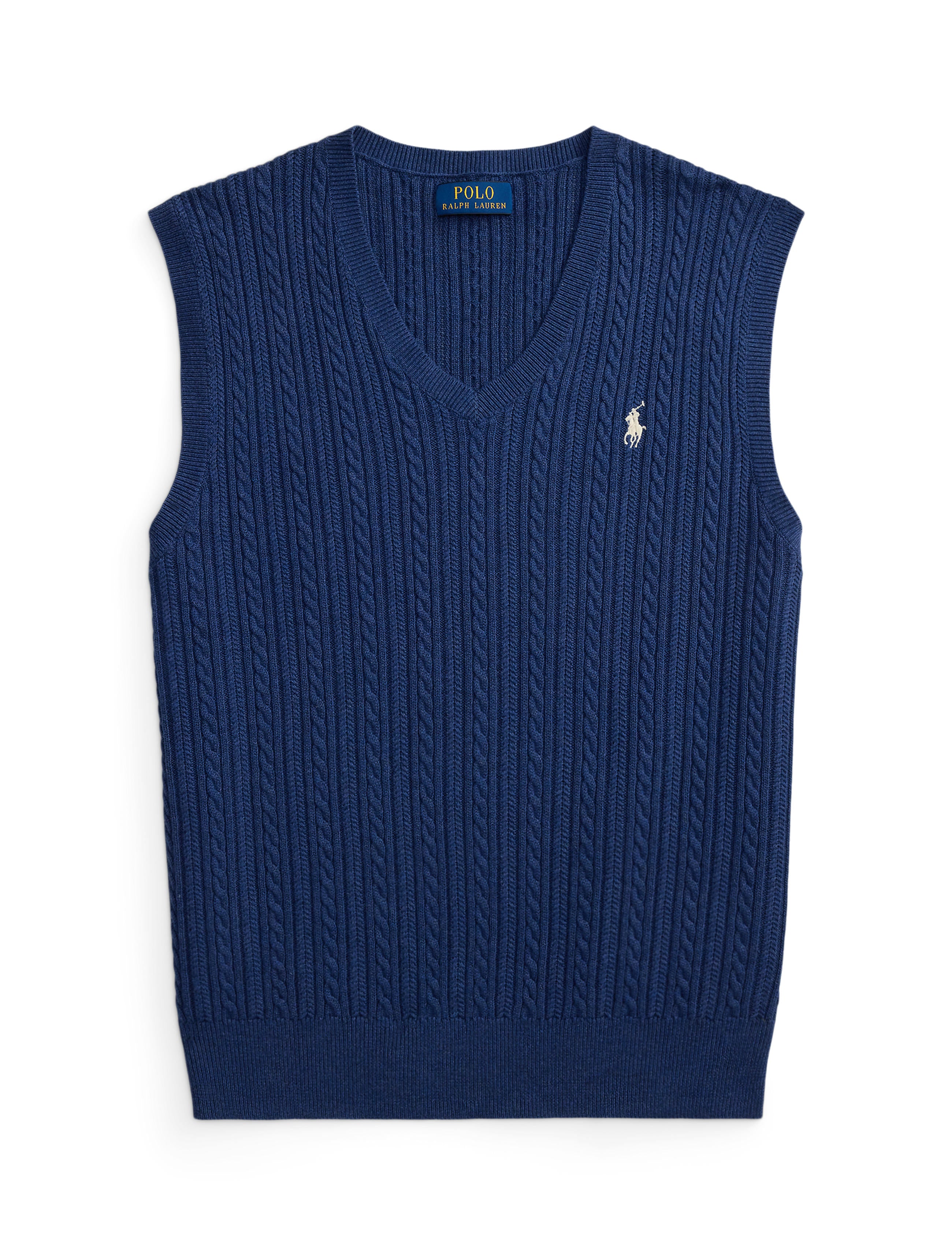 This sweater vest is cable-knit with featherweight cotton yarn that is combed with fine brushes, resulting in a softer, more durable garment.